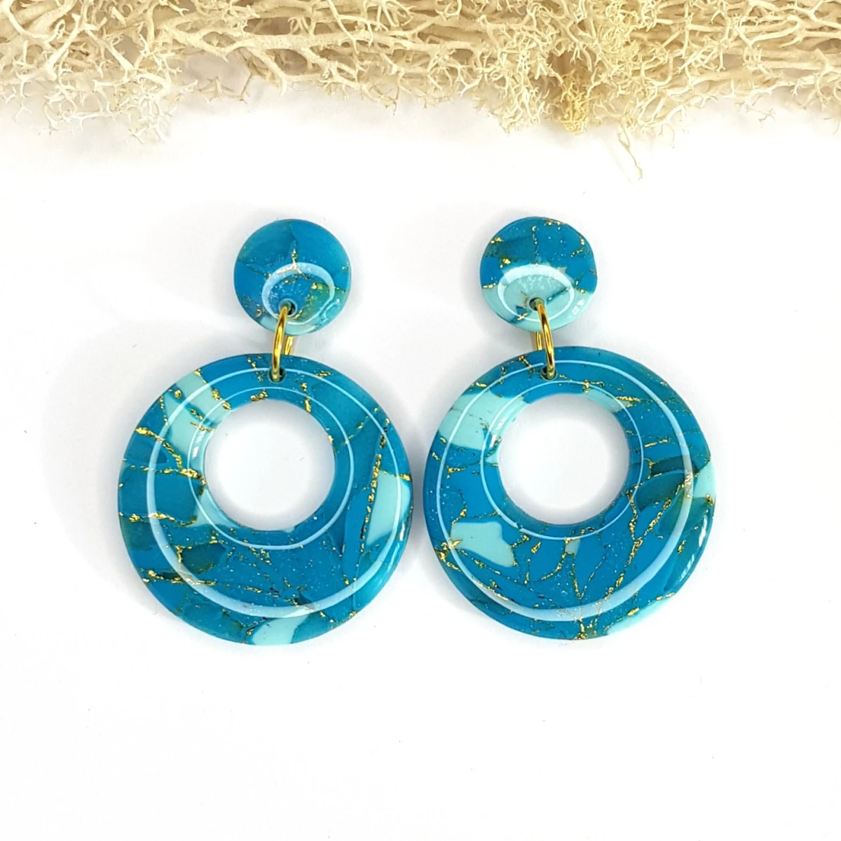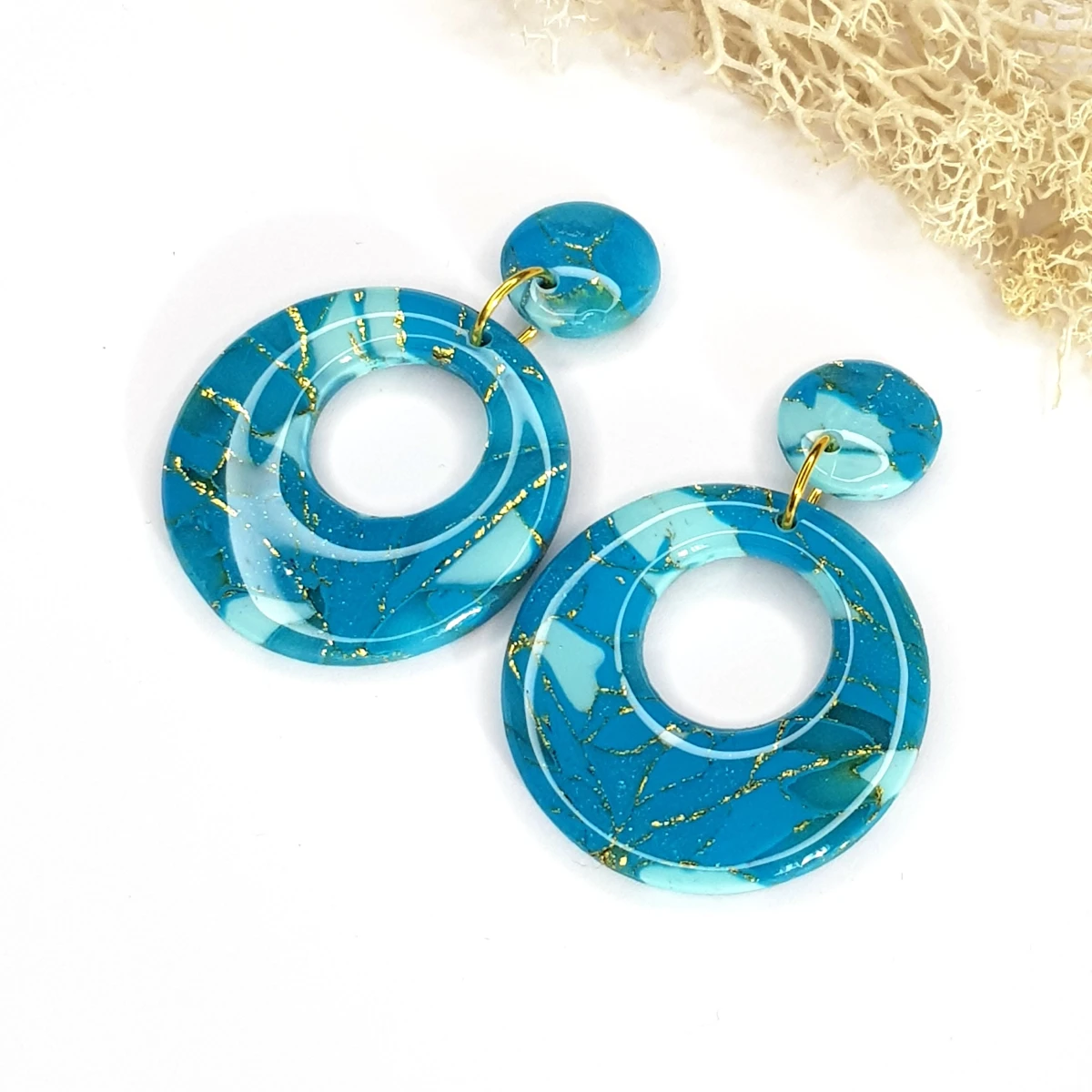 Kolczyki z gliny polimerowej to prawdziwe dzieła sztuki. Ich intensywny turkusowy kolor w połączeniu z delikatnymi złotymi żyłkami tworzy elegancką i wyrazistą kompozycję. Mają długość 5,5 cm, co nadaje im efektownego charakteru, a jednocześnie są lekkie i wygodne w noszeniu. Okrągła, warstwowa forma przywodzi na myśl fale oceanu, które odbijają promienie słońca. Całość została pokryta połyskującą żywicą, dzięki czemu kolczyki są trwałe i zyskują wyjątkowy blask. To idealny dodatek zarówno na co dzień, jak i na wyjątkowe okazje, który przyciągnie spojrzenia i podkreśli unikalny styl. Każda para odrobinę się od siebie różni. Czas dostawy od 3 do 5 dni roboczych.