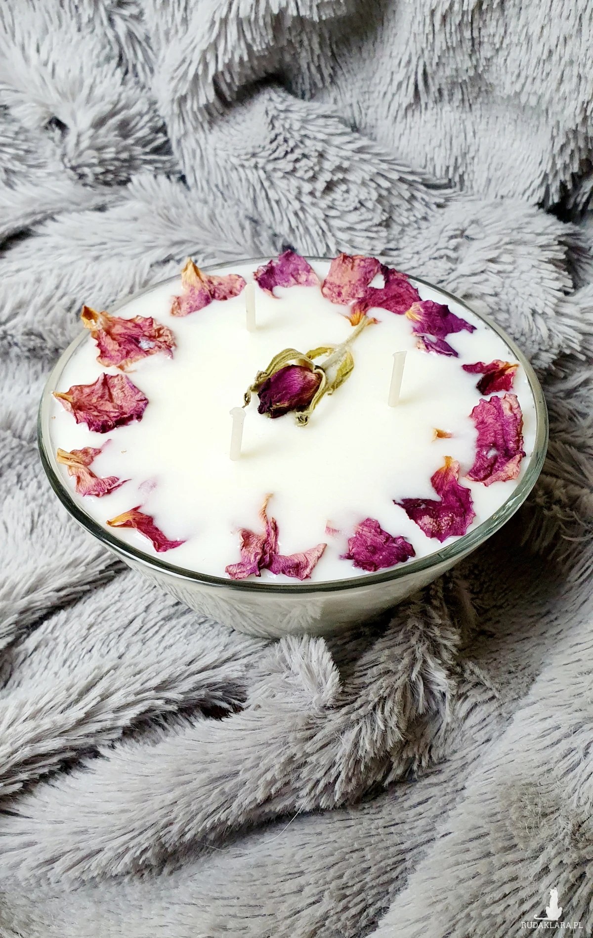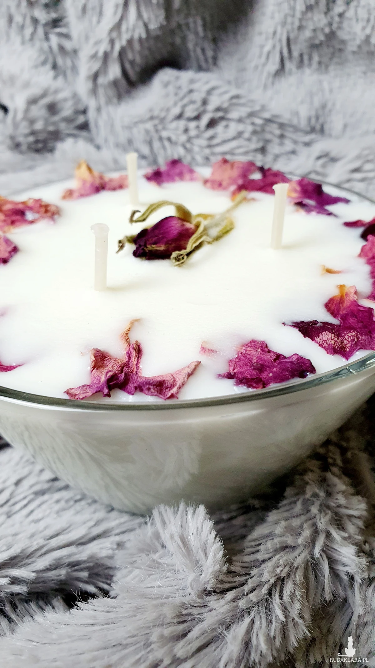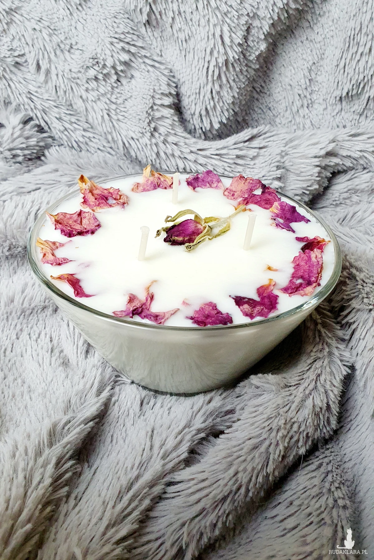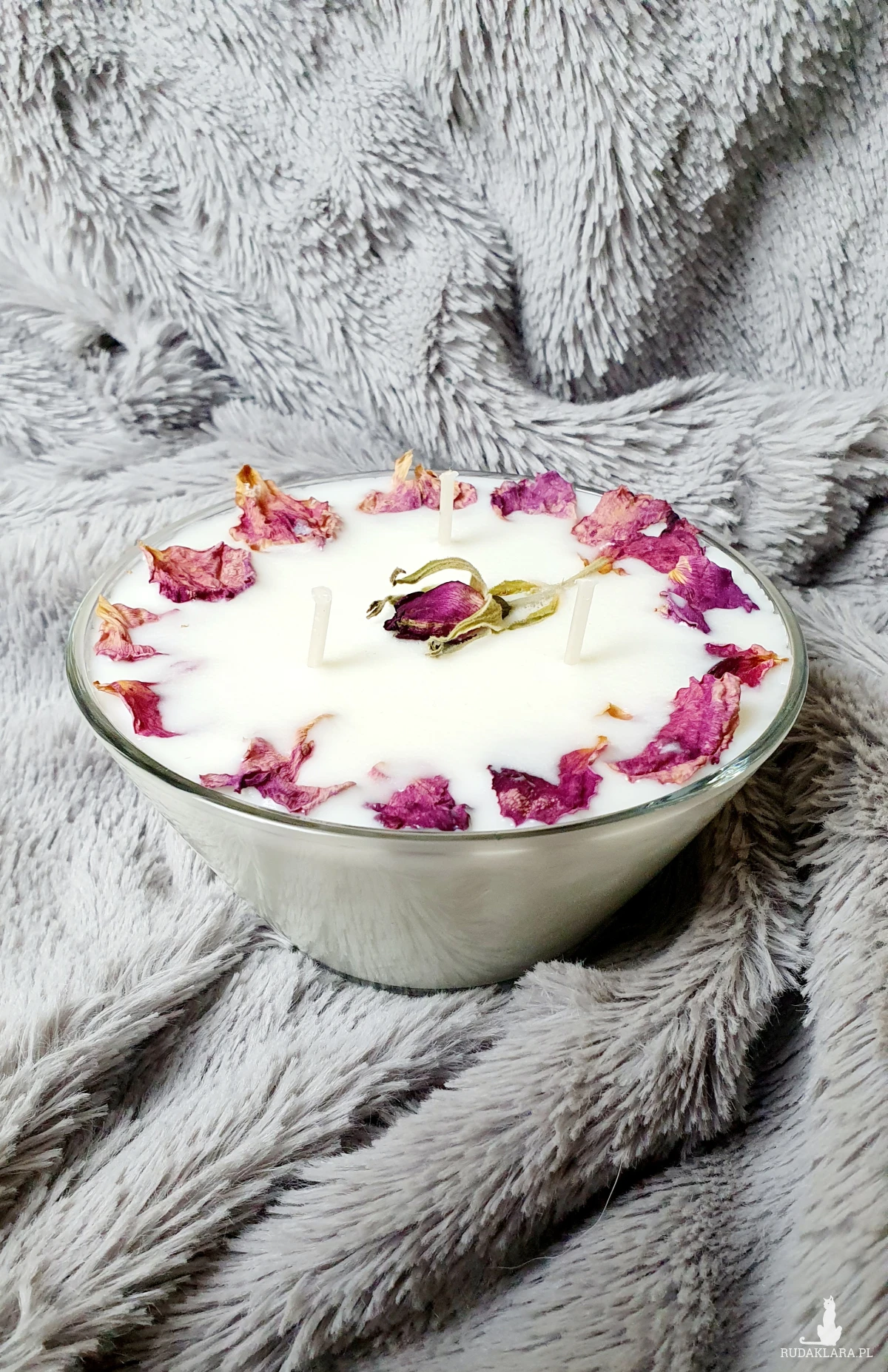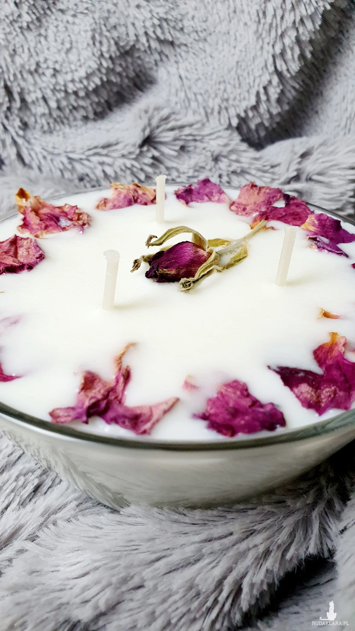 Świeca wykonana została ze 100% wosku sojowego z dodatkiem naturalnego olejku o zapachu limonki, udekorowana suszoną różą.