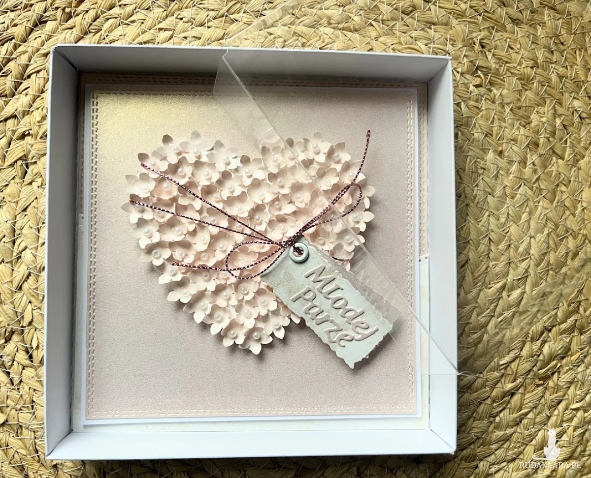 240,kartka na ślub w pudełku z kwiatowym sercem i torebką