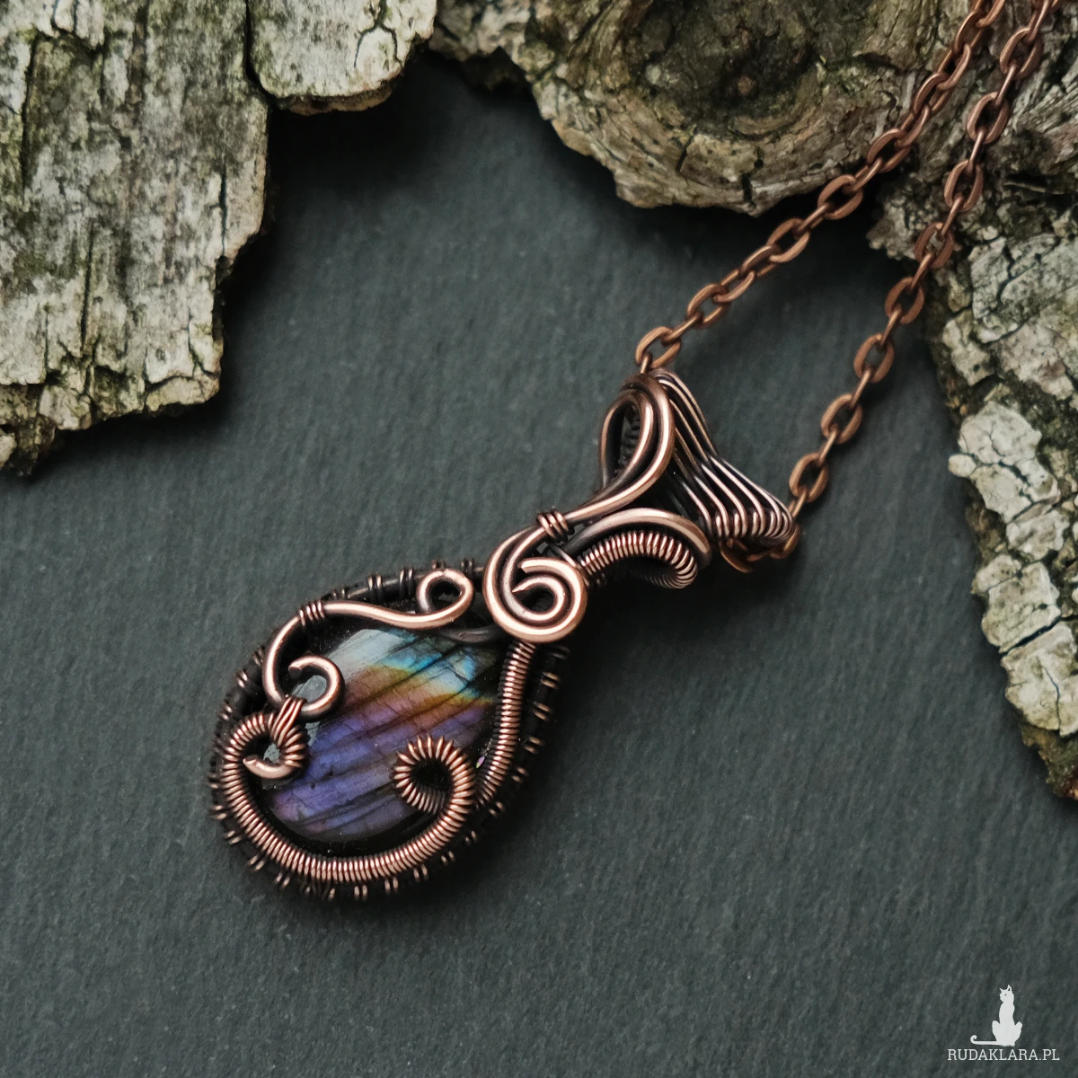 Miedziany wisiorek mieści w sobie kamień labradorytu mieniącego się w świetle pomarańczem, fioletem oraz błękitem. Posiada zwartą oprawę - ozdobne boczki oraz fikuśne sploty dodające mu słodyczy. Wisiorek idealnie sprawdzi się na dekolcie kobiety, która lubi delikatne dodatki, ceniącej wyroby rękodzielnicze.