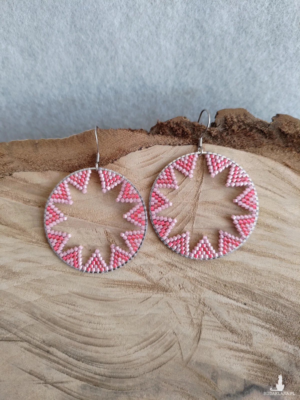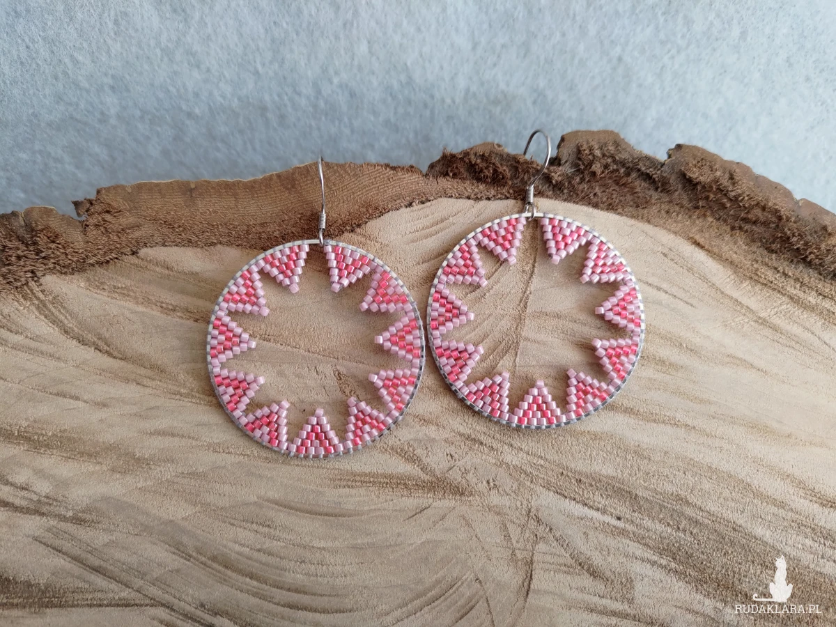 Kolczyki wykonane są z japońskich koralików miyuki techniką beadingu na okrągłej bazie o średnicy 4 cm. Koraliki są w odcieniach koloru różowego. Kolczyki zawieszone są na otwartych biglach ze stali chirurgicznej.