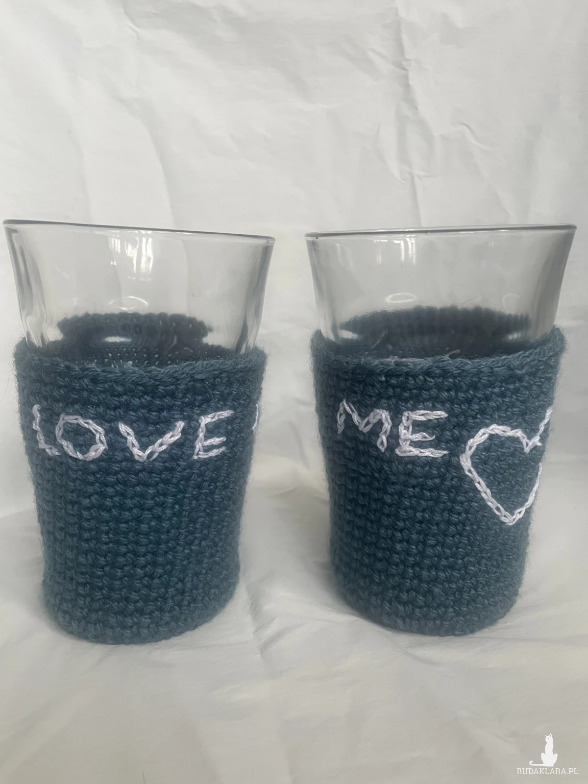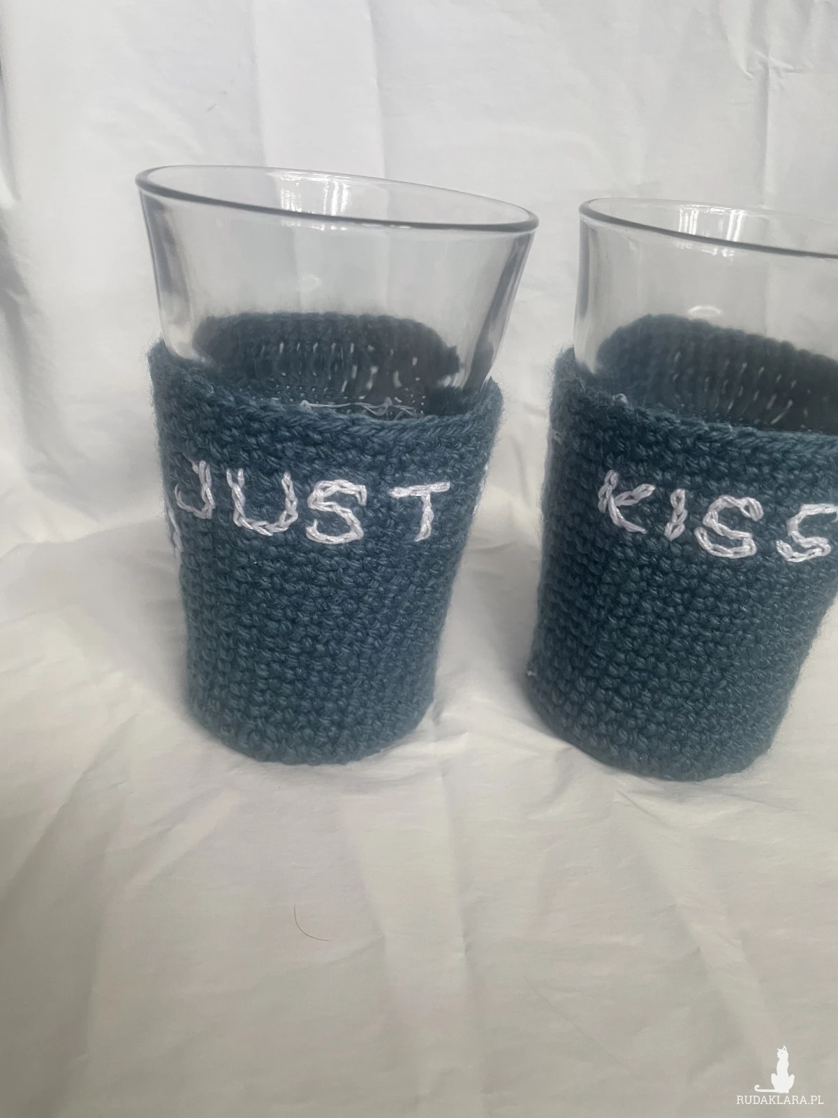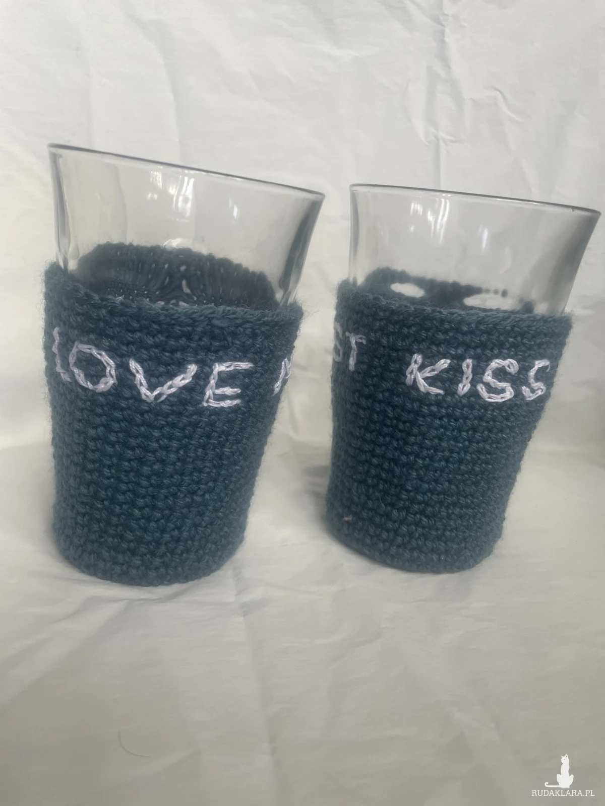 Komplet szklanek w osłonkach wydzierganych na szydełku, i z wyszywanymi napisami "JUST LOVE ME" "JUST KISS M" i sercem. Osłonki są w kolorze morskim z białymi napisami. Wysokość szklanki to 14 cm a średnica to 9 cm.