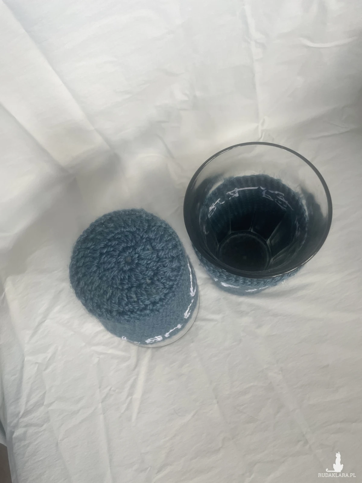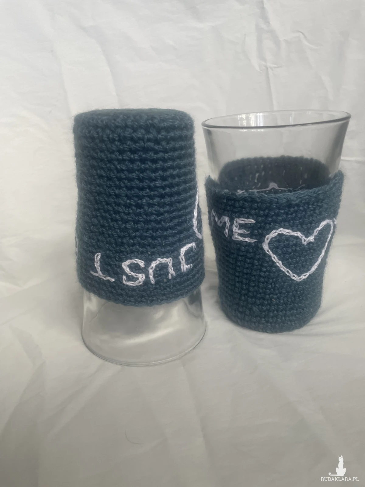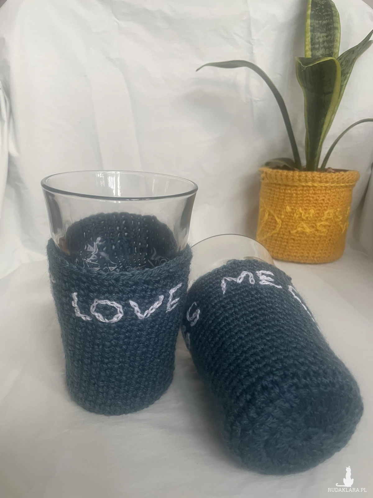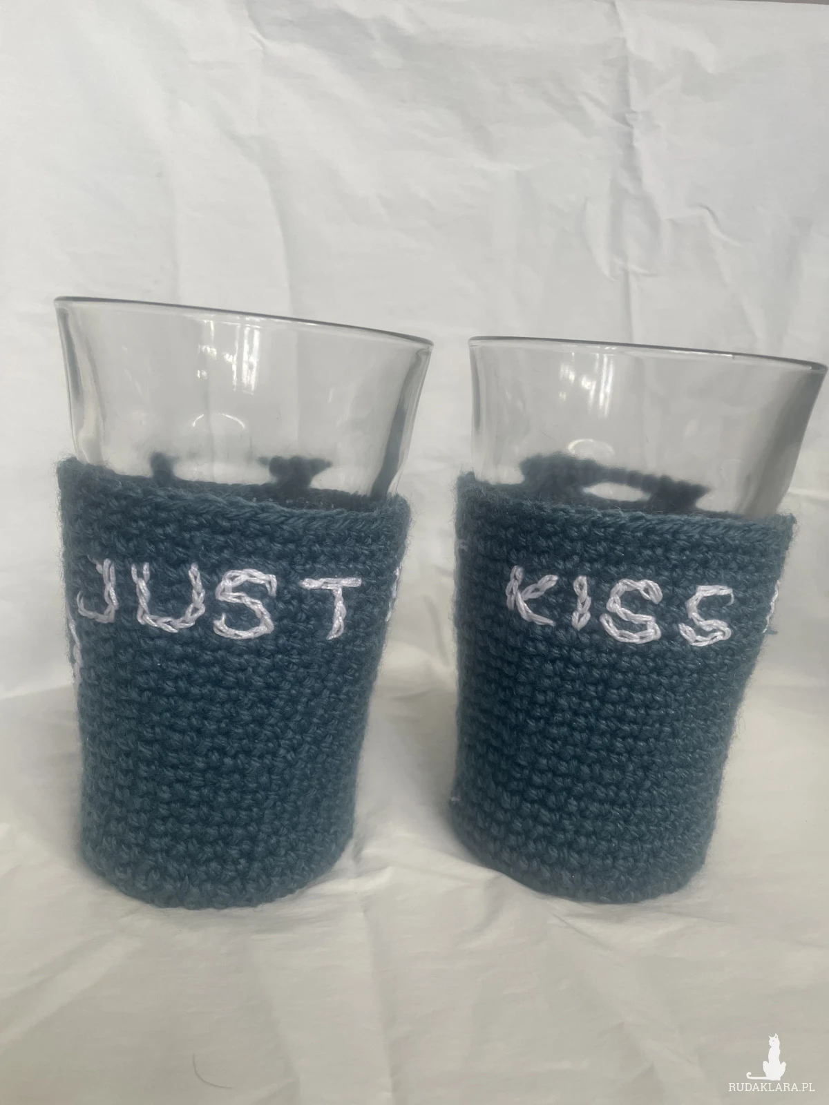 Komplet szklanek w osłonkach wydzierganych na szydełku, i z wyszywanymi napisami "JUST LOVE ME" "JUST KISS M" i sercem. Osłonki są w kolorze morskim z białymi napisami. Wysokość szklanki to 14 cm a średnica to 9 cm.