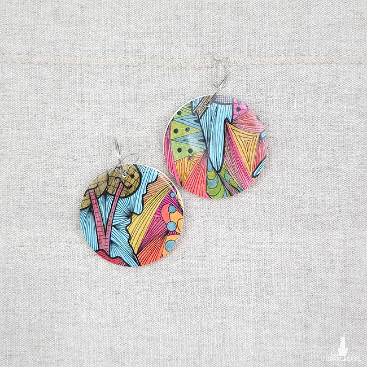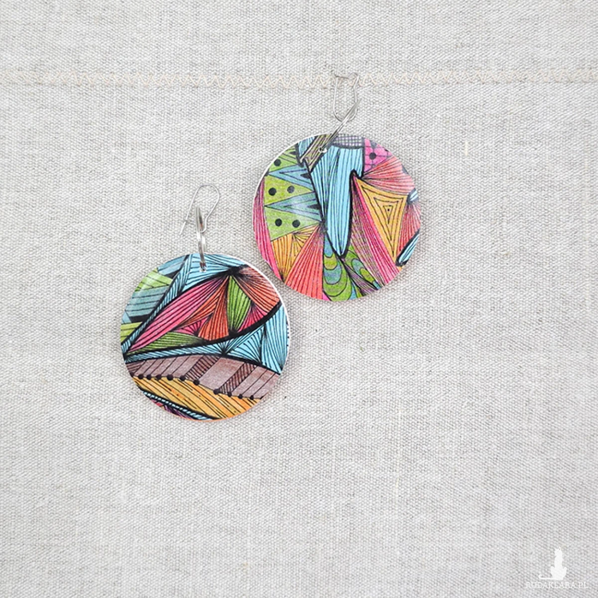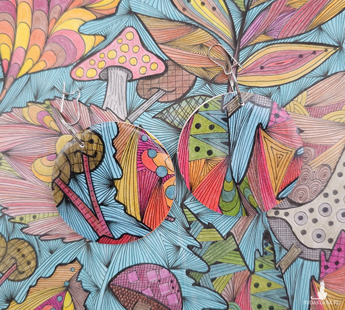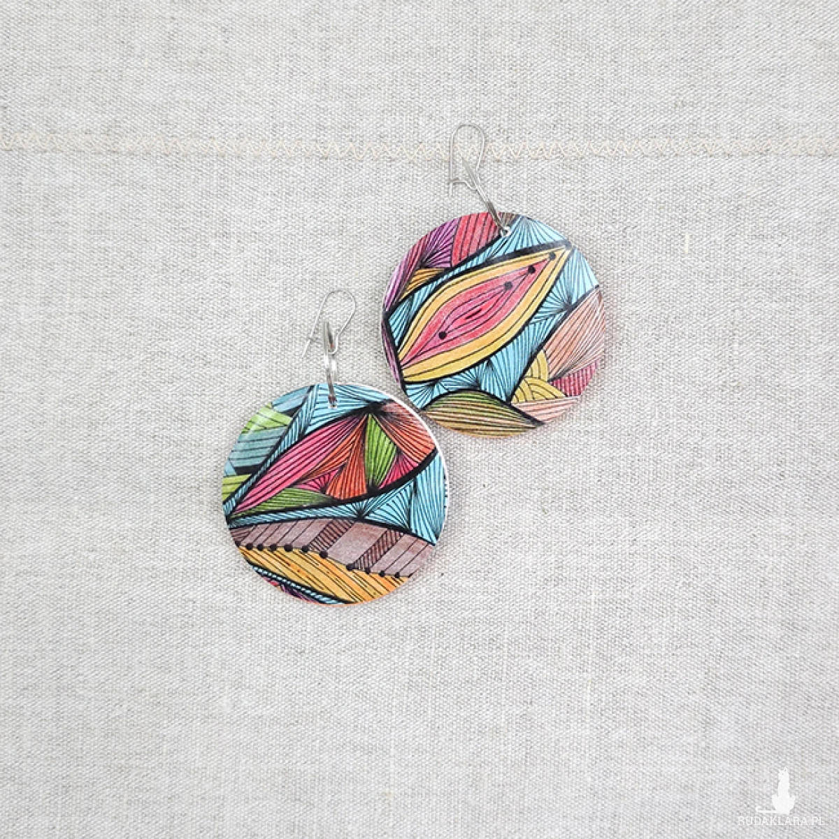 Kolczyki wykonane z drewnianej bazy oraz części mojego autorskiego rysunku "Jesień".