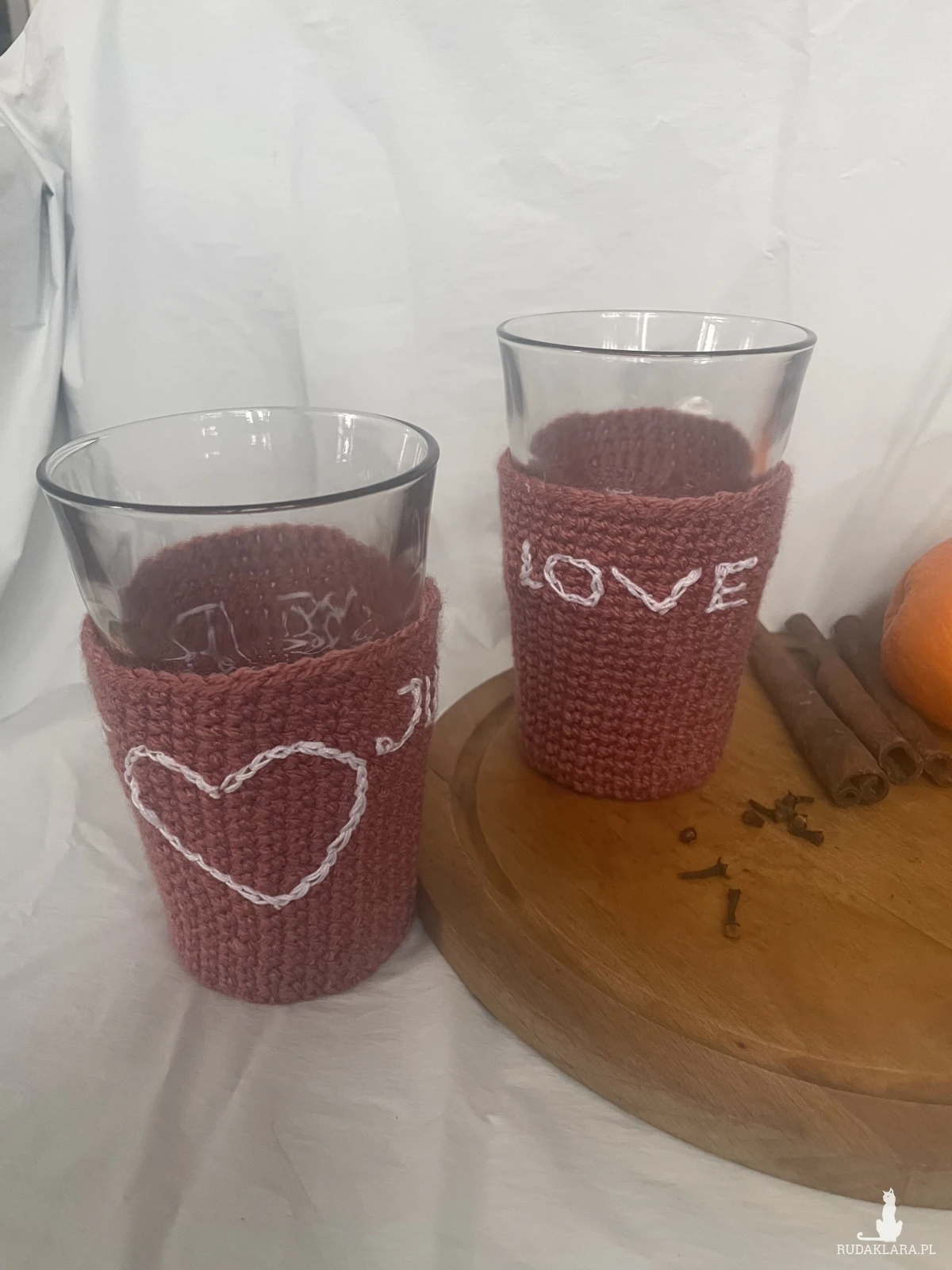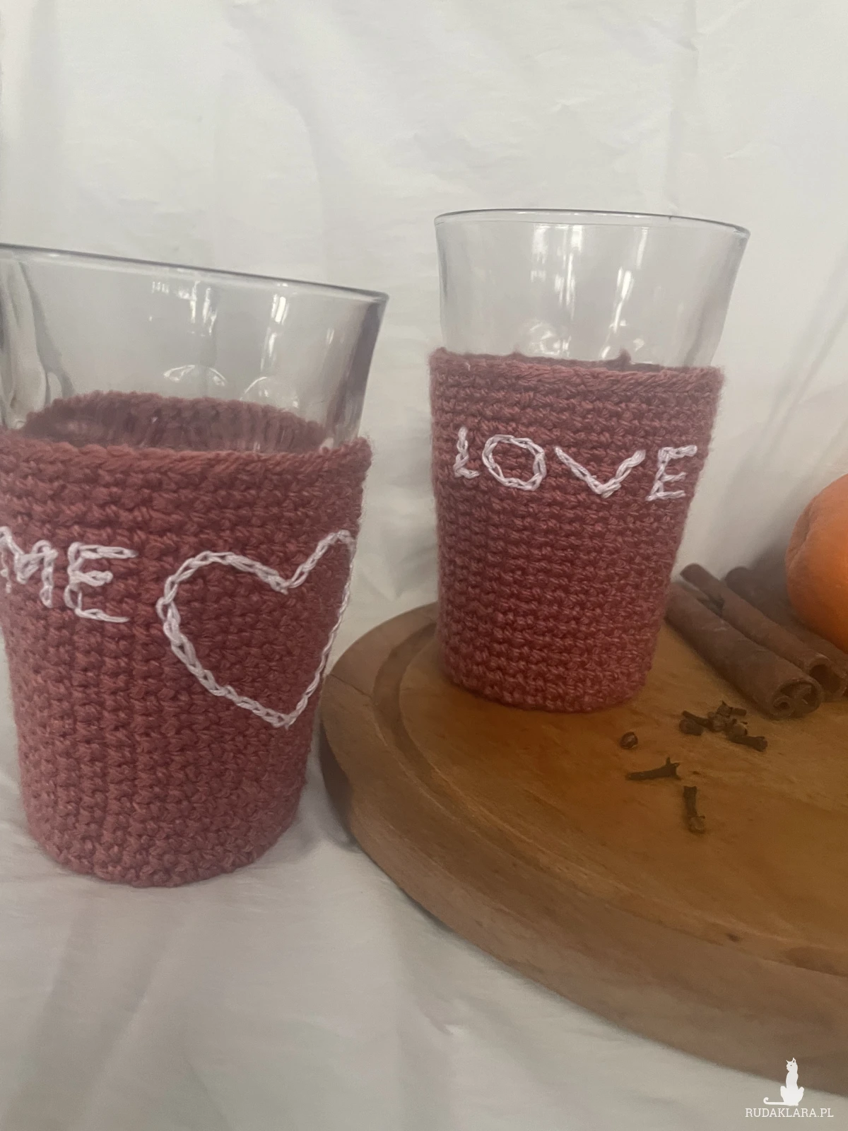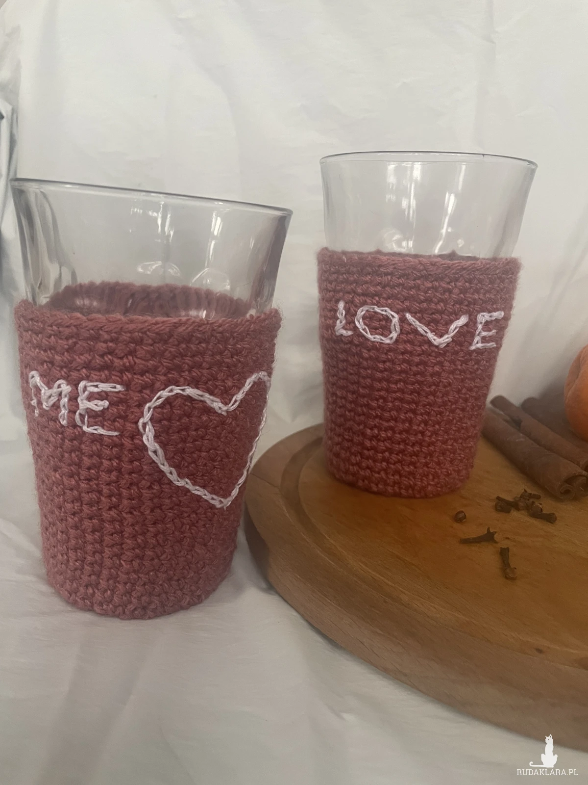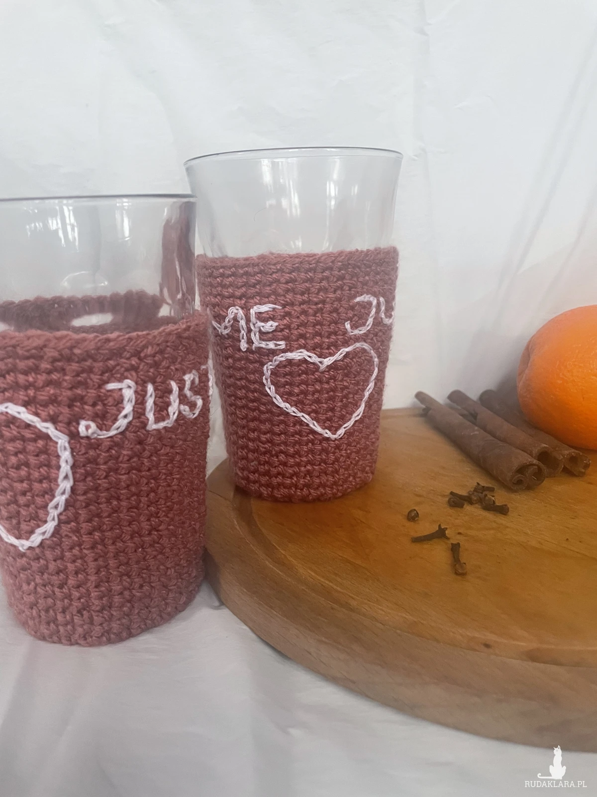 Komplet dwóch szklanek w osłonkach, ktore są wydziergane na szydełku z haftowanymi napisami "JUST LOVE ME" i sercem w złotym kolorze. Osłonki są w kolorze pudrowego rożu z białymi napisami. Wysokość to 144 cm a średnica szklanek to 9 cm.