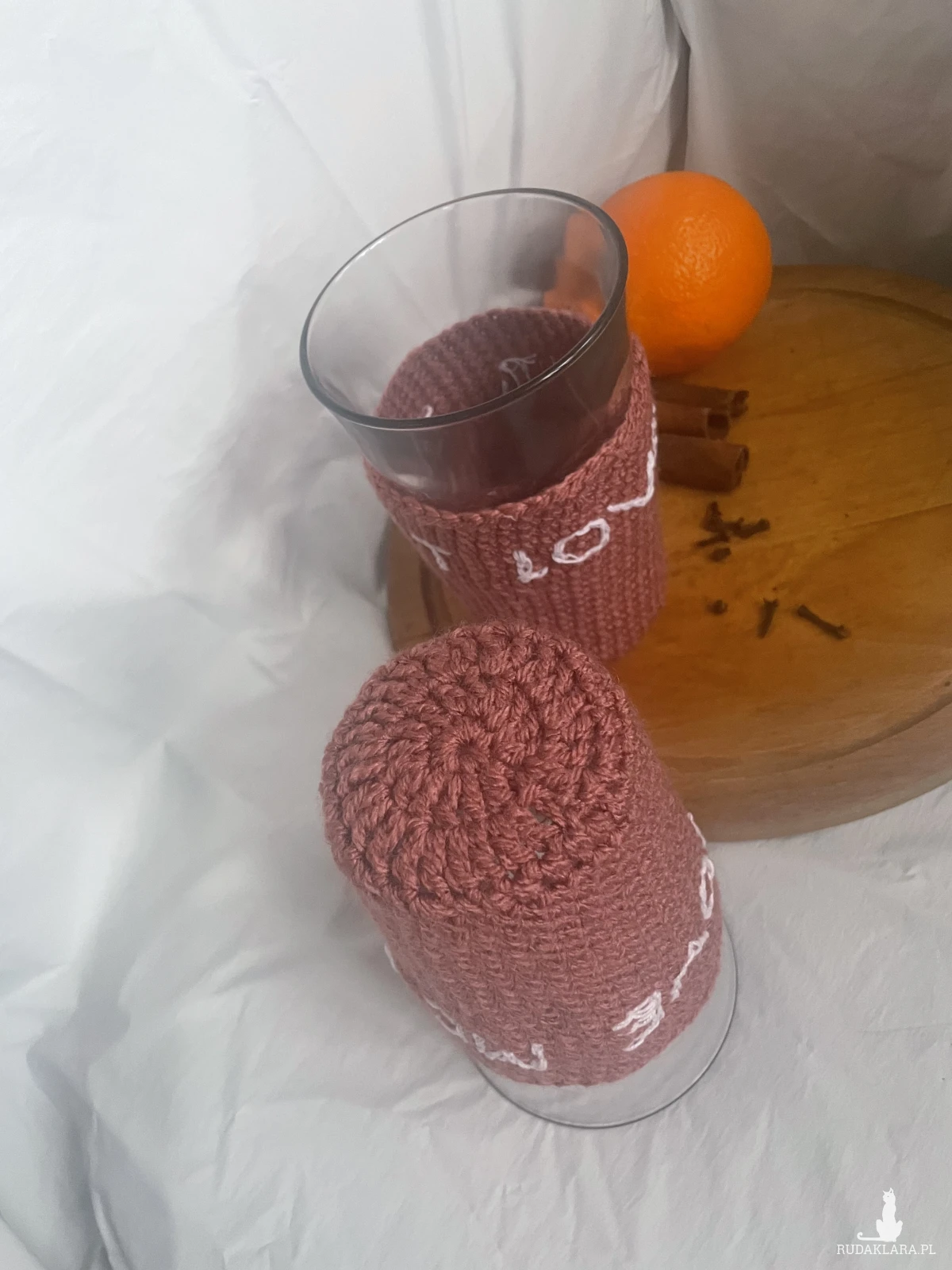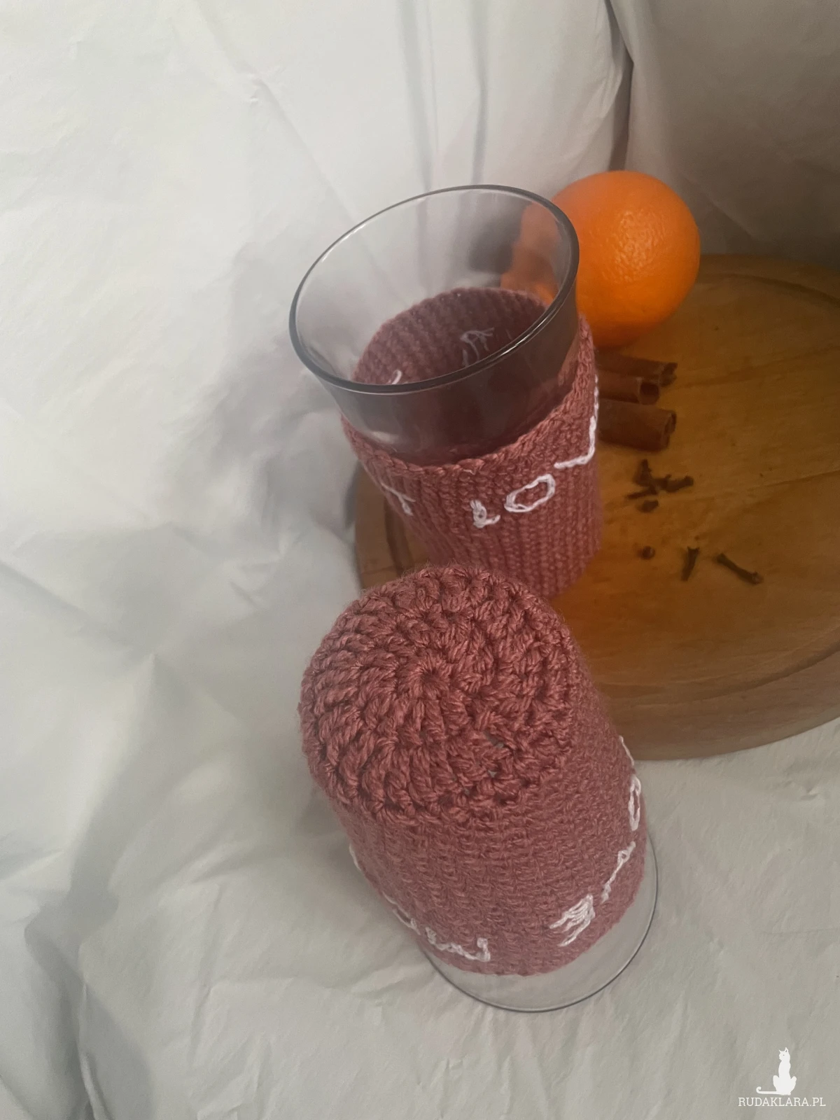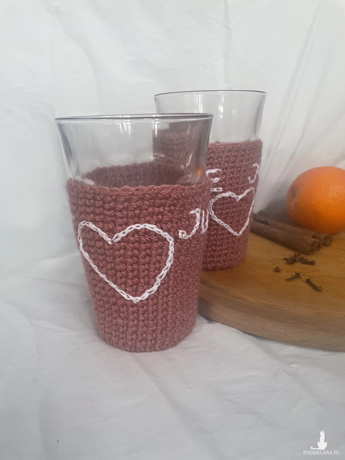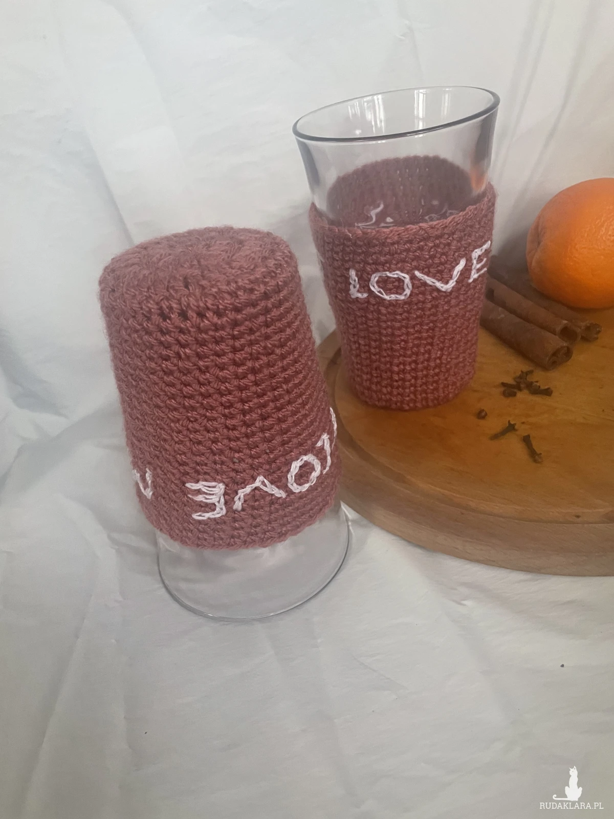 Komplet dwóch szklanek w osłonkach, ktore są wydziergane na szydełku z haftowanymi napisami "JUST LOVE ME" i sercem w złotym kolorze. Osłonki są w kolorze pudrowego rożu z białymi napisami. Wysokość to 144 cm a średnica szklanek to 9 cm.