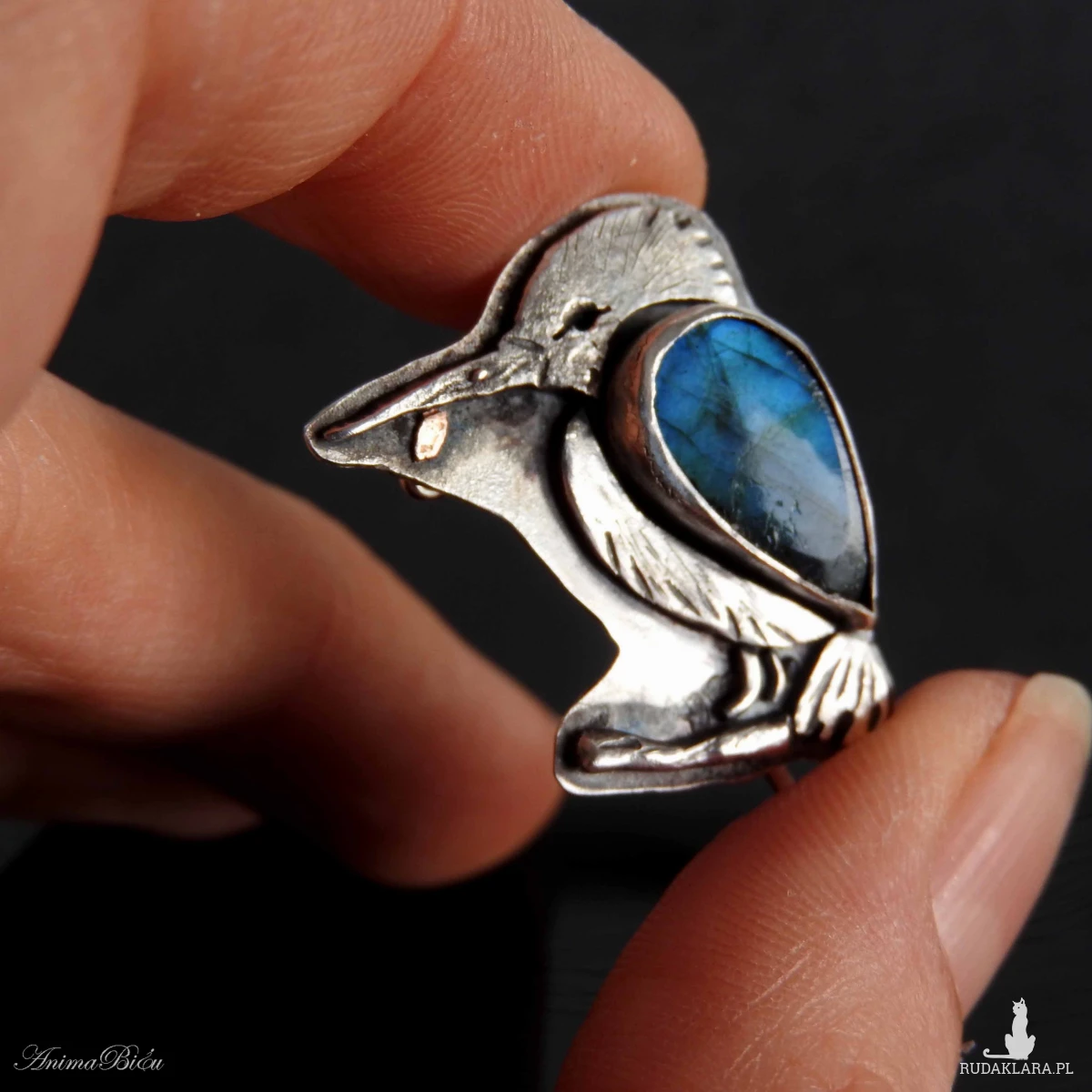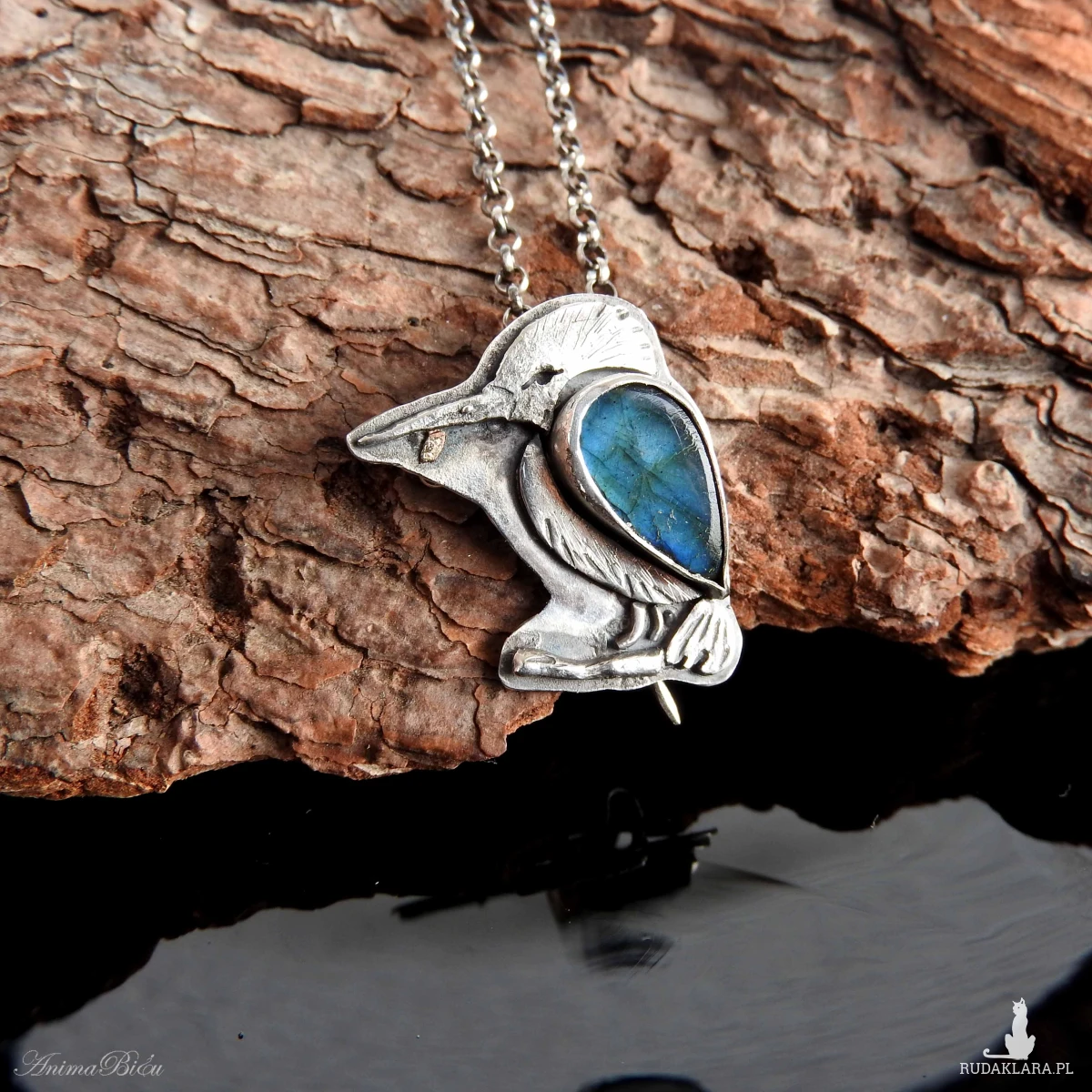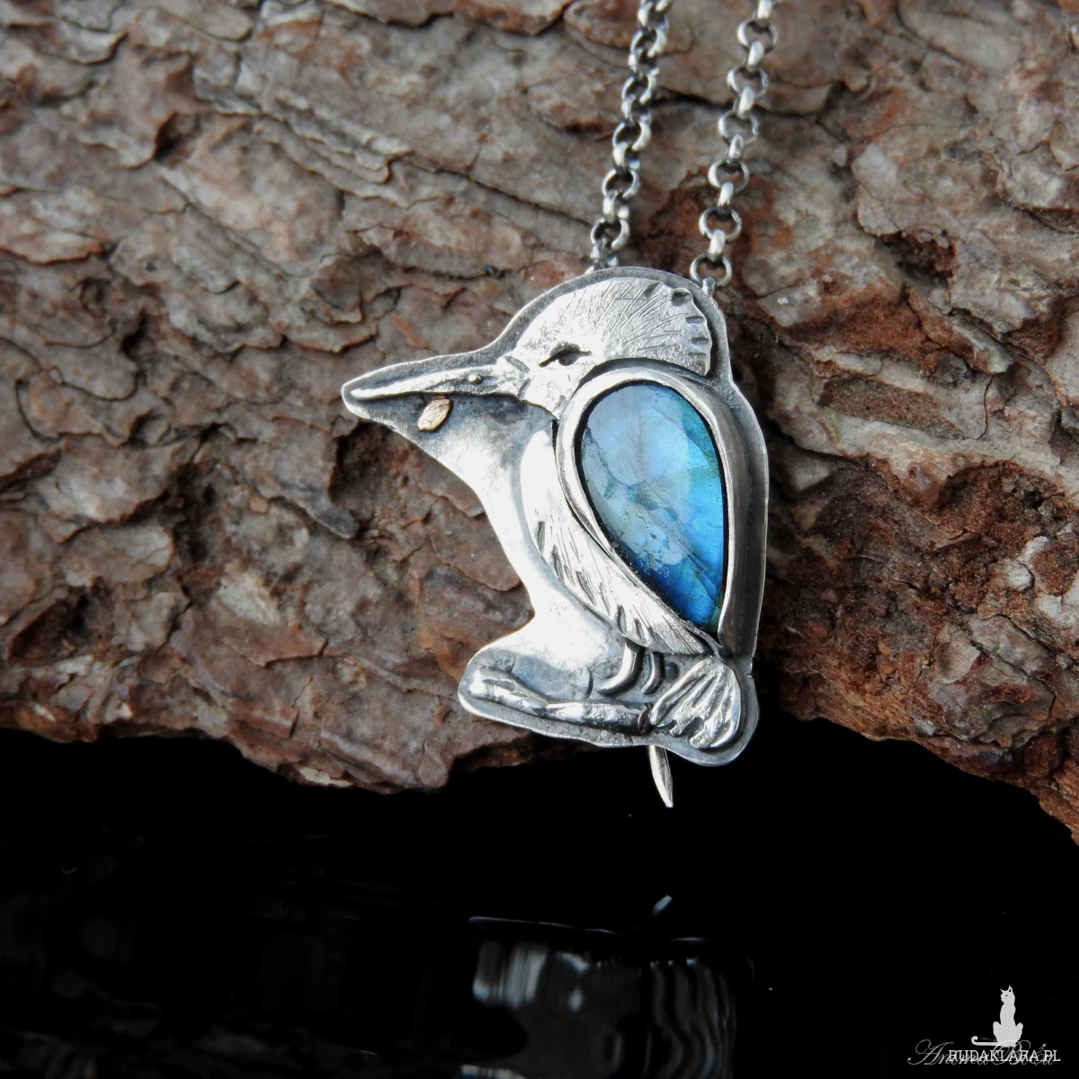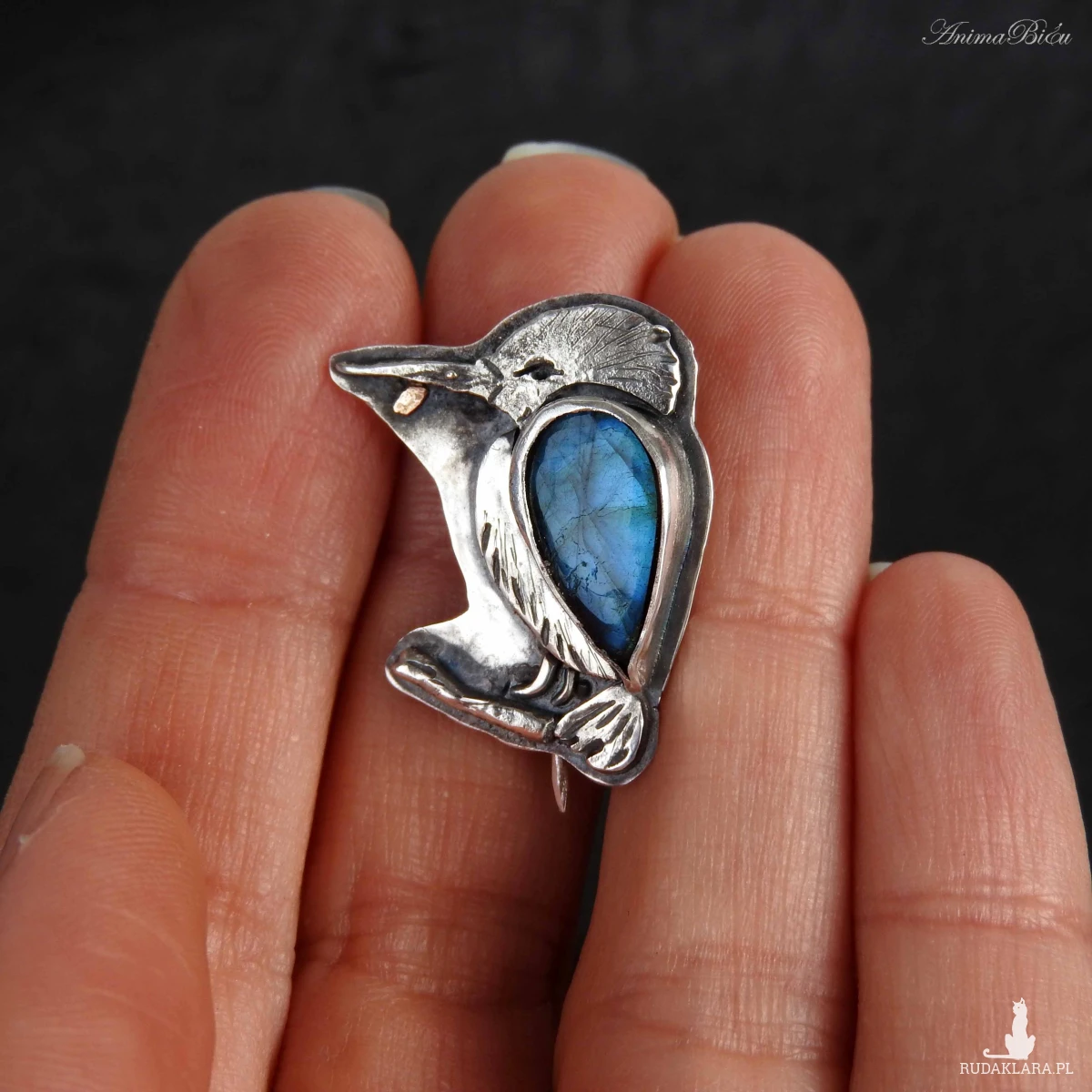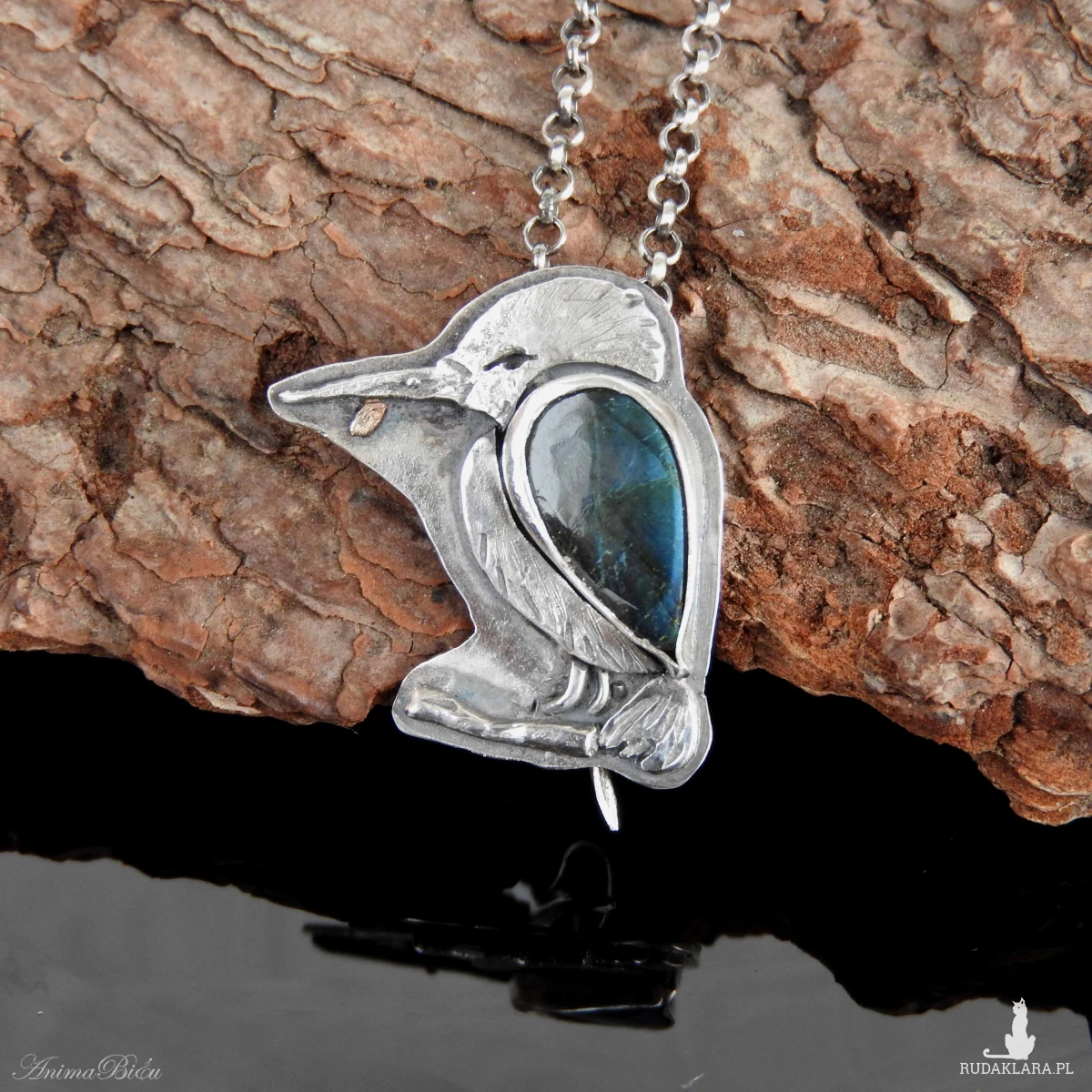 Wisiorek - broszka srebrna Zimorodek z labradorytem.
