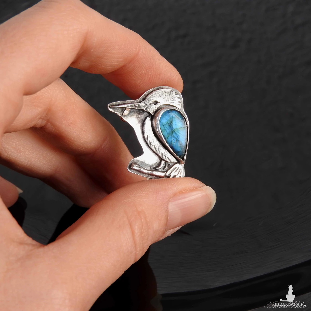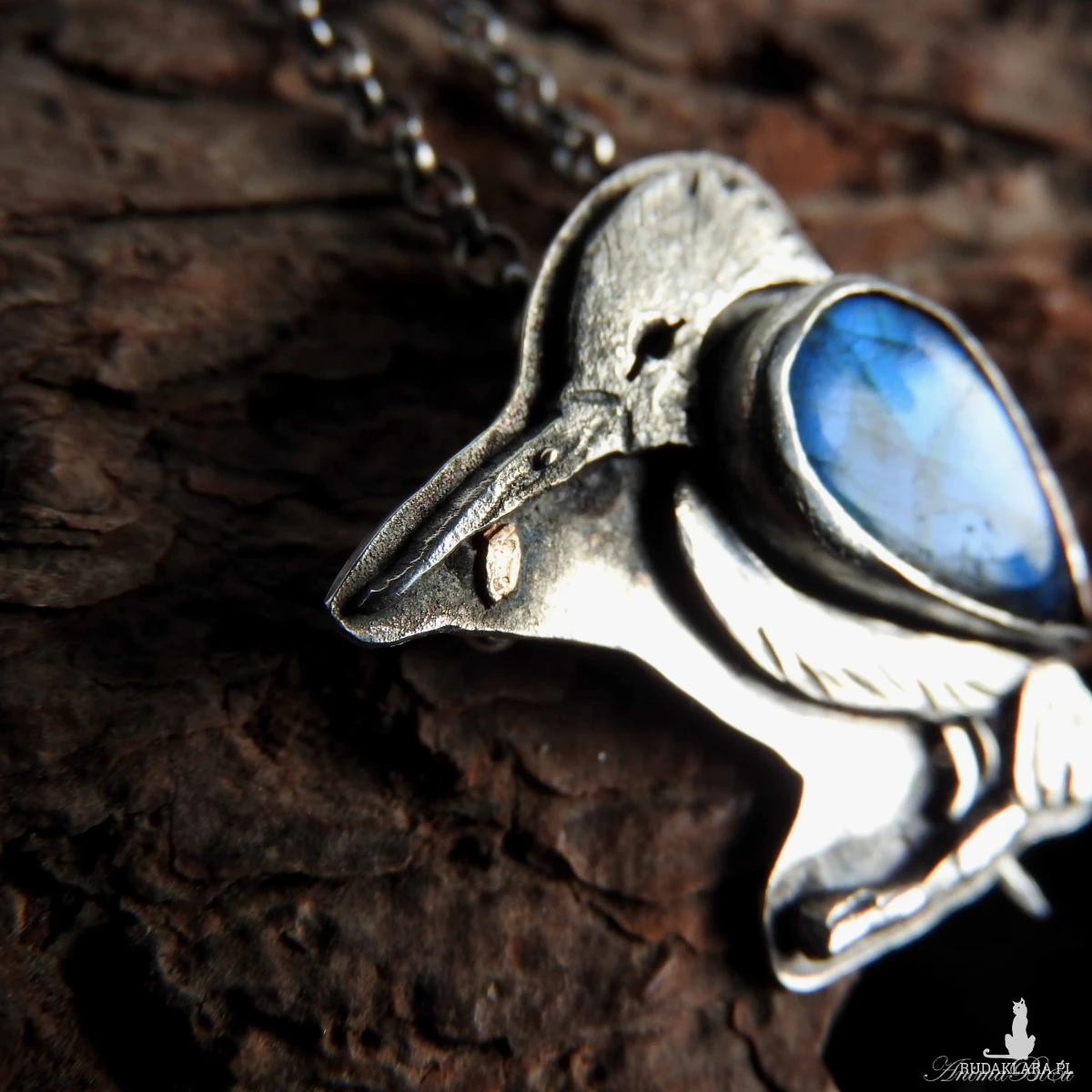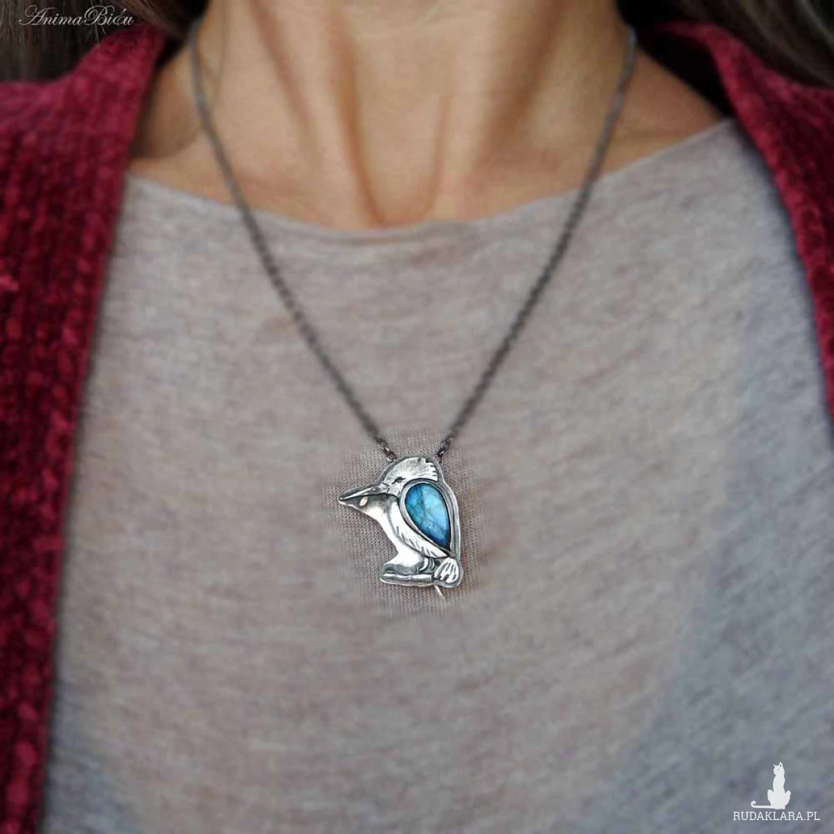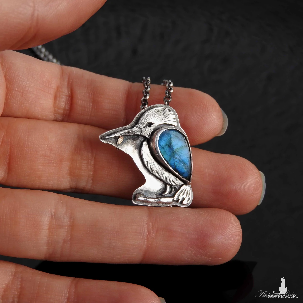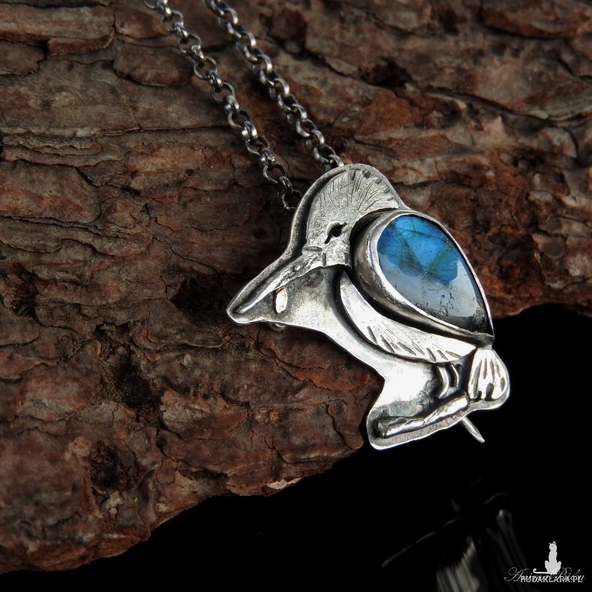 Wisiorek - broszka srebrna Zimorodek z labradorytem.