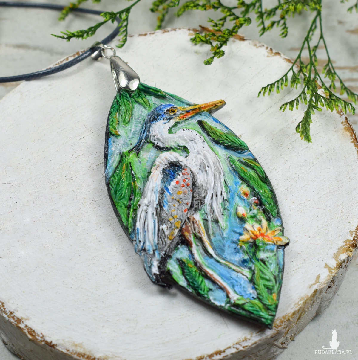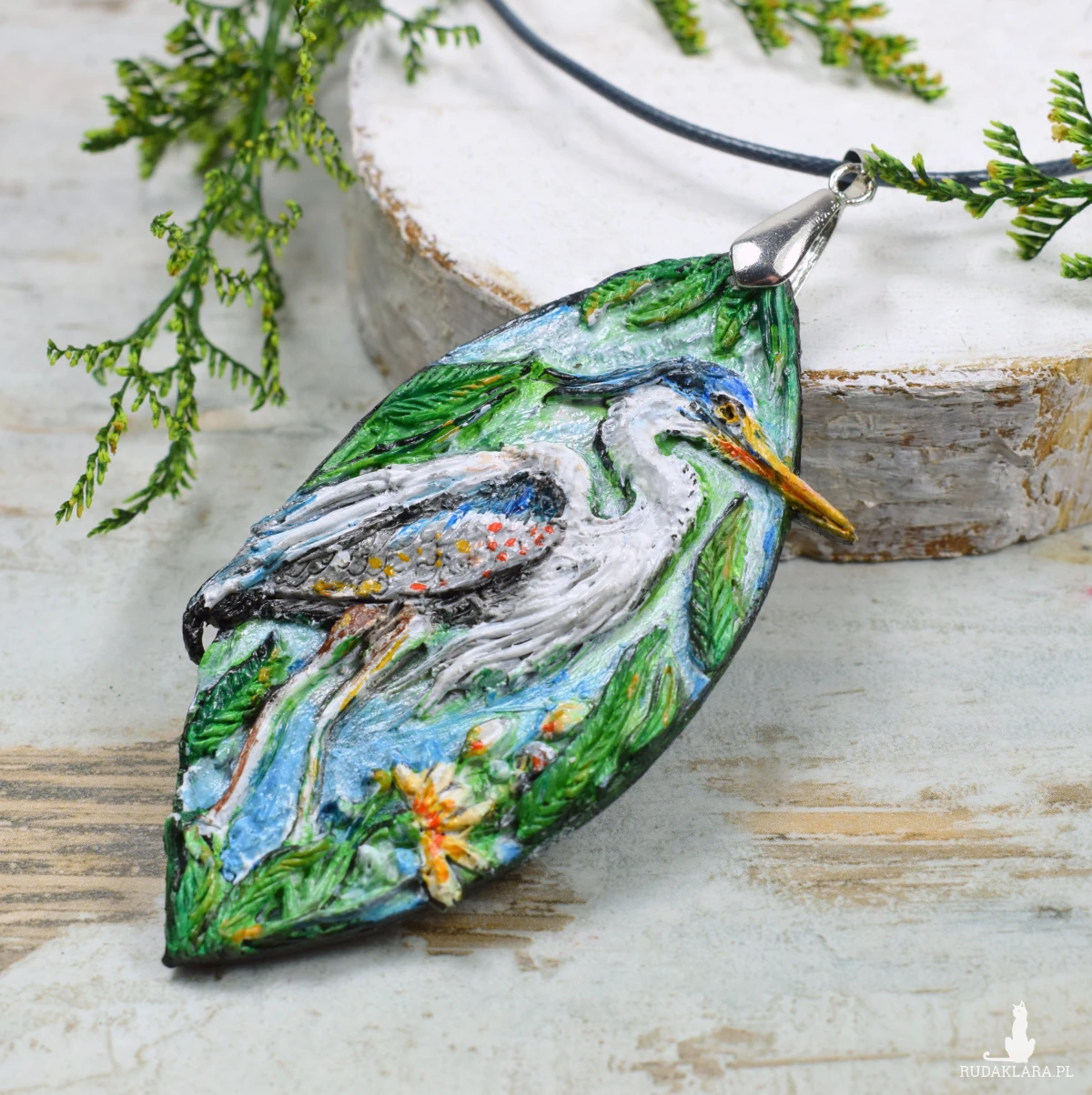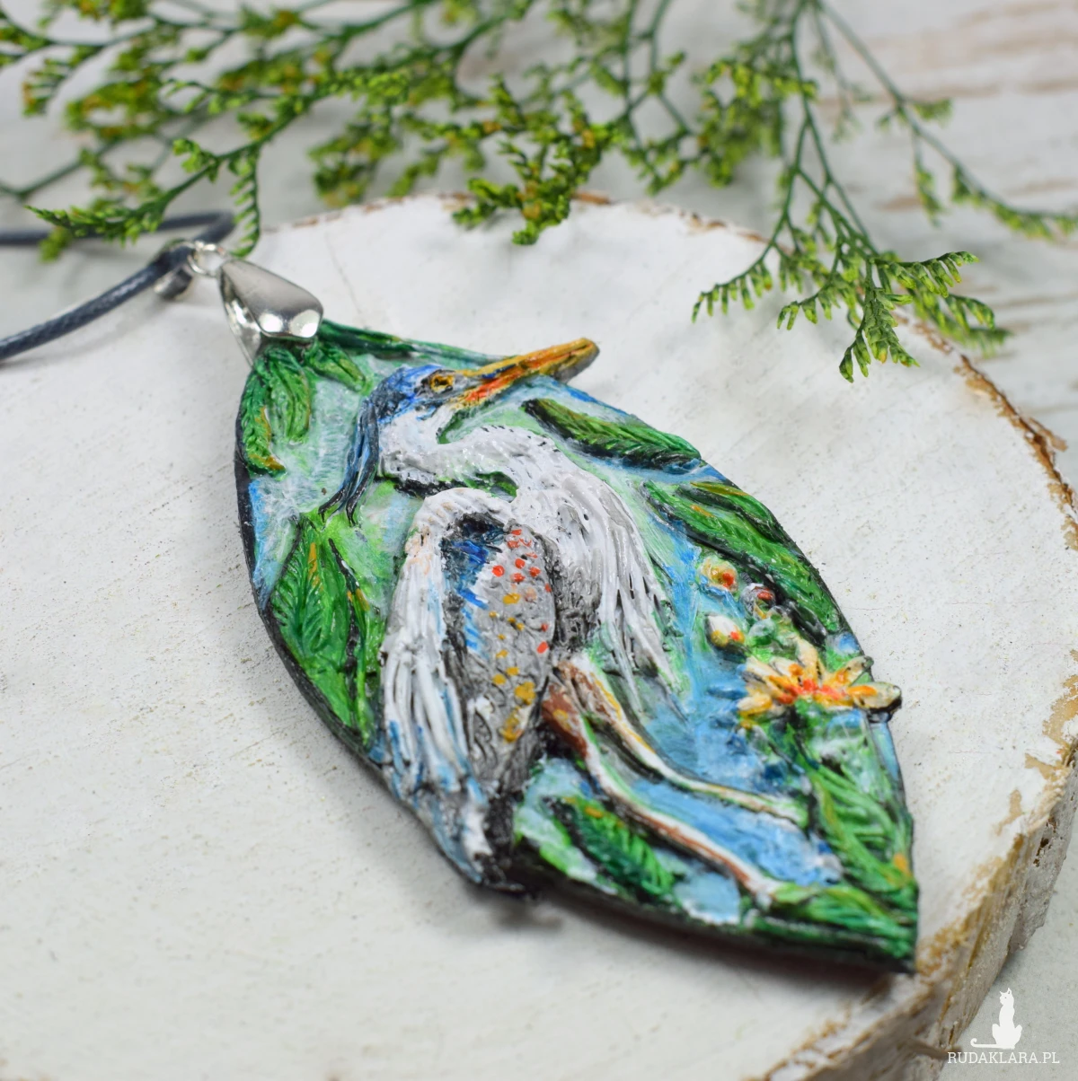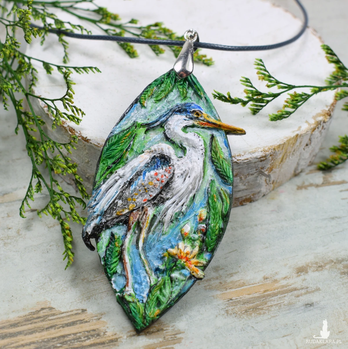 Unikatowy, ręcznie wykonany naszyjnik z czaplą siwą i motywem roślinnym.