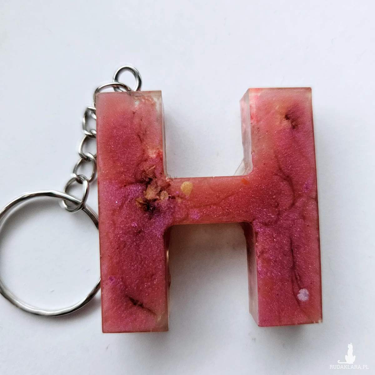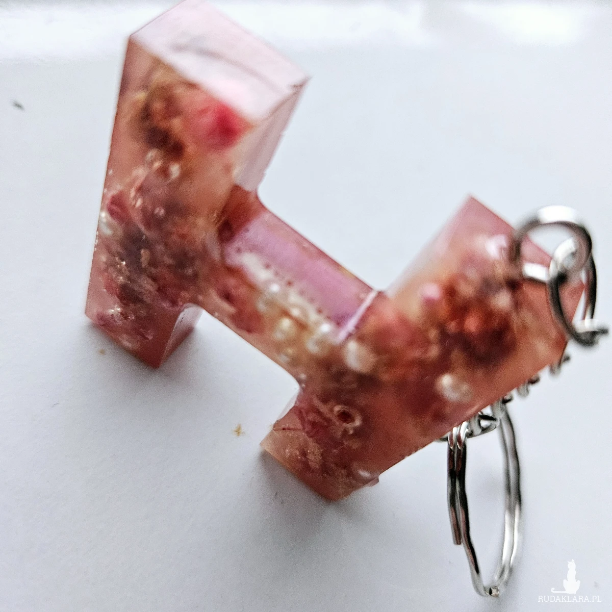 Brelok literka H ŕóżowa z gipsówką i perłami