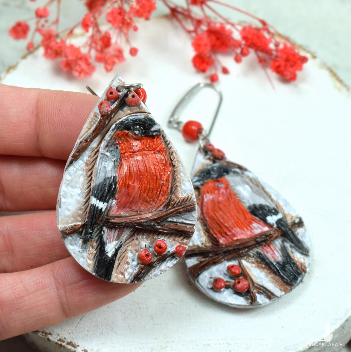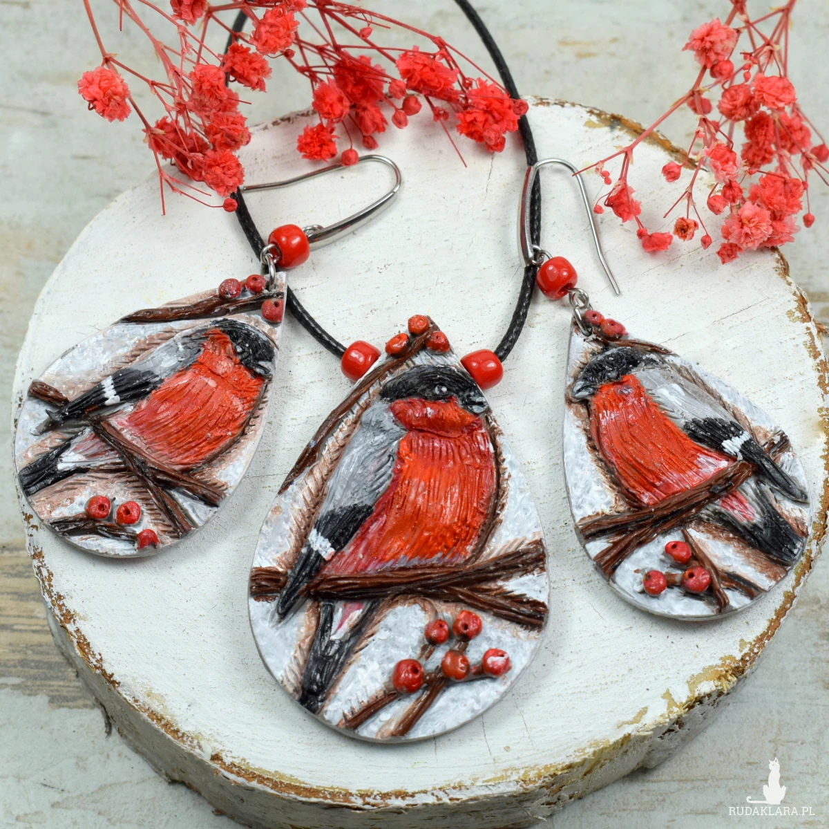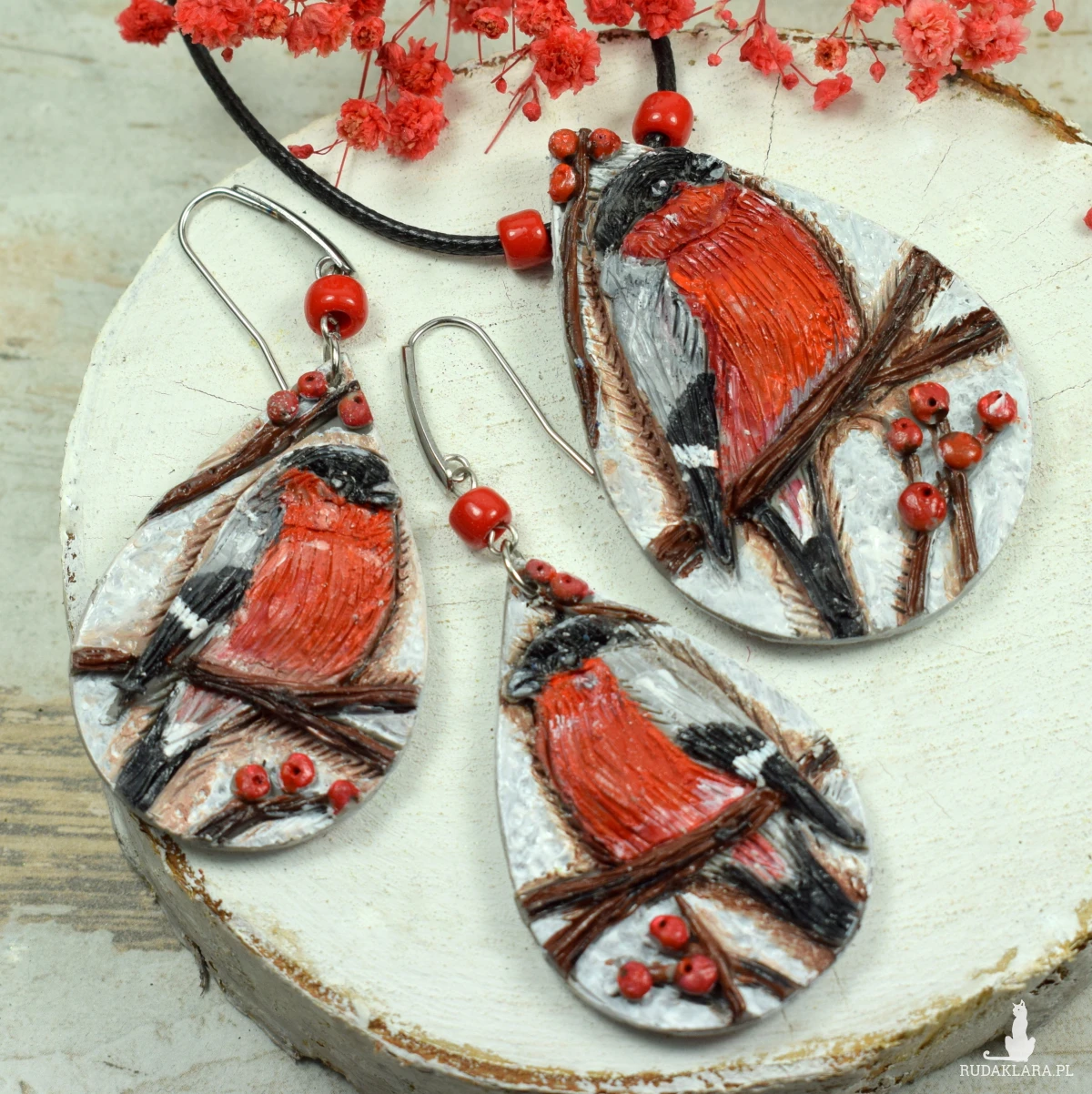 Wyjątkowy, wykonany ręcznie komplet biżuterii z gilem zwyczajnym i motywem roślinnym.