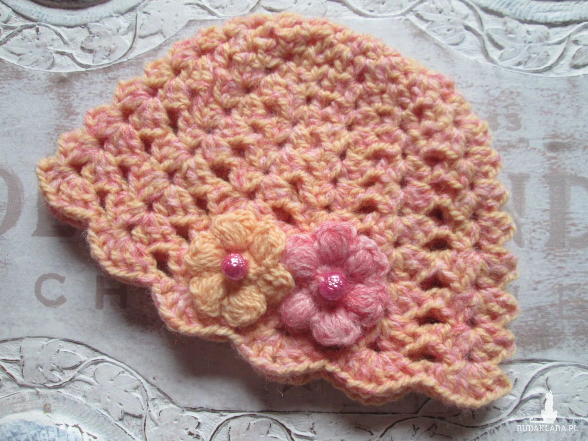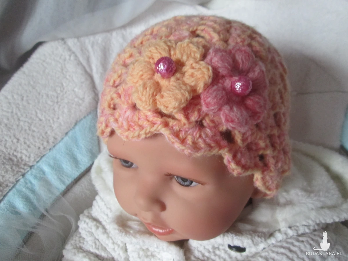 Z anilany,moheru i bawełny,z ozdobnymi kwiatkami i różowymi koralikami