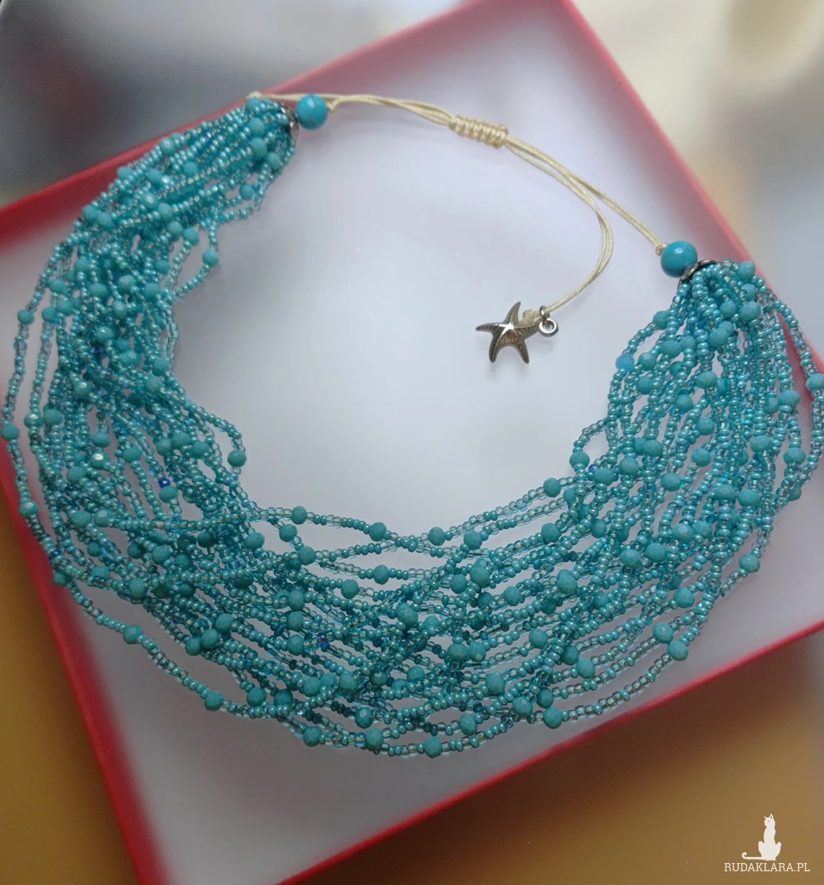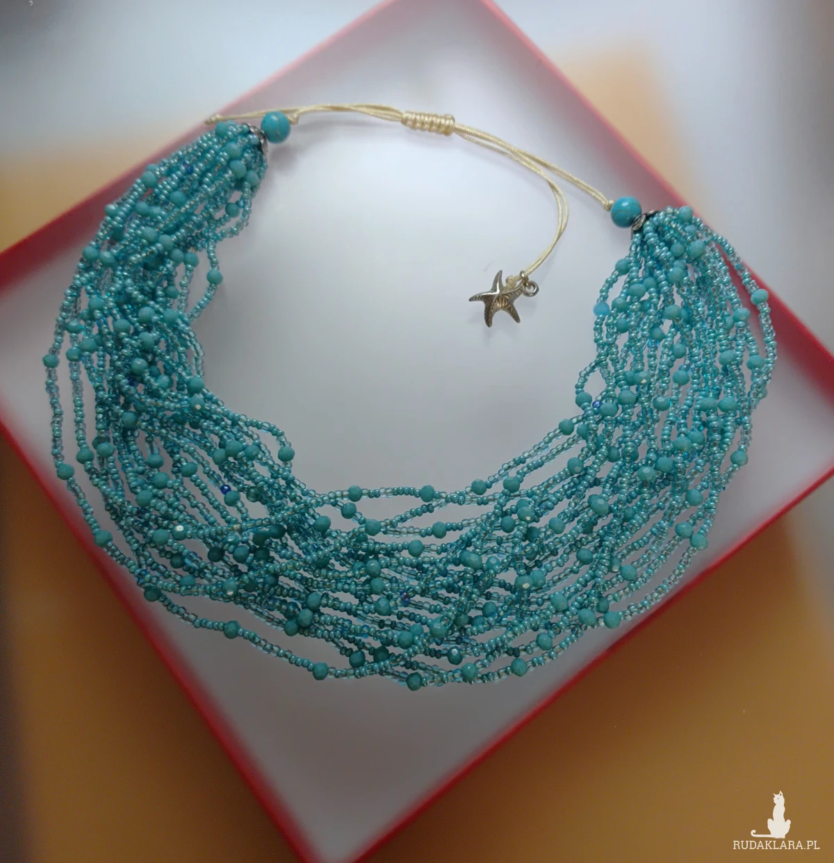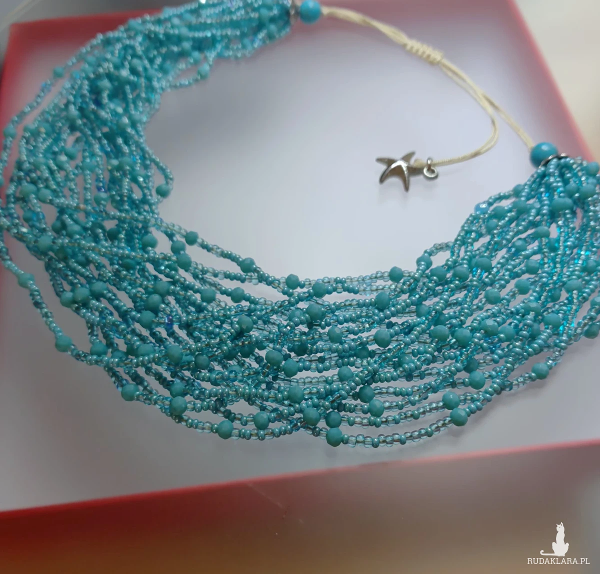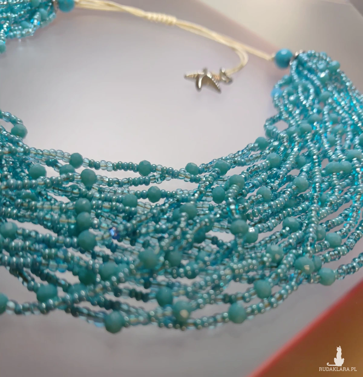 Naszyjnik W turkusowym kolorze z kryształków szklanych. Najwieksze koraliki mają ok 4 mm, wielowarstwowy, wiele nitek koralików, Piękny naszyjnik na codzień, do pracy i na wyjątkowe okazje. Wykończenie metalowe i ze sznurka syntetycznego. Objętość można regulować. Max objętość 54cm