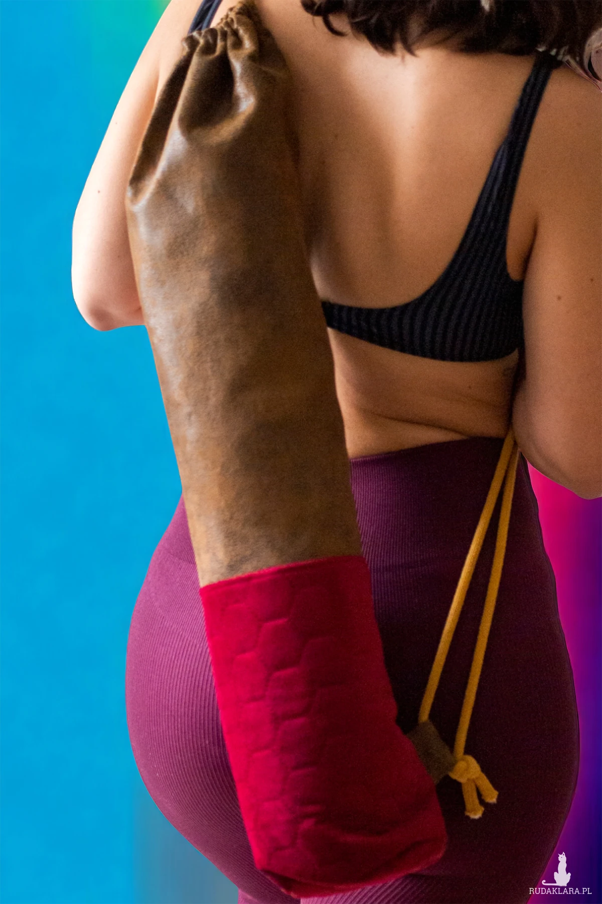 Plecak worek wykonany z brązowego nubuku imitującego postarzaną skórę w kolorze brązowym oraz pikowanego czerwonego weluru. Jego kształt sprawia, iż idealnie nadaje się na pokrowiec na matę do jogi.