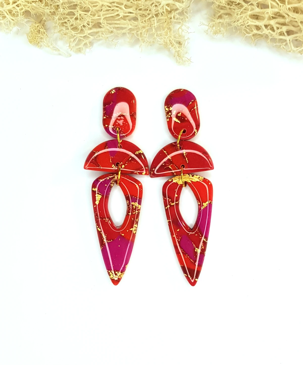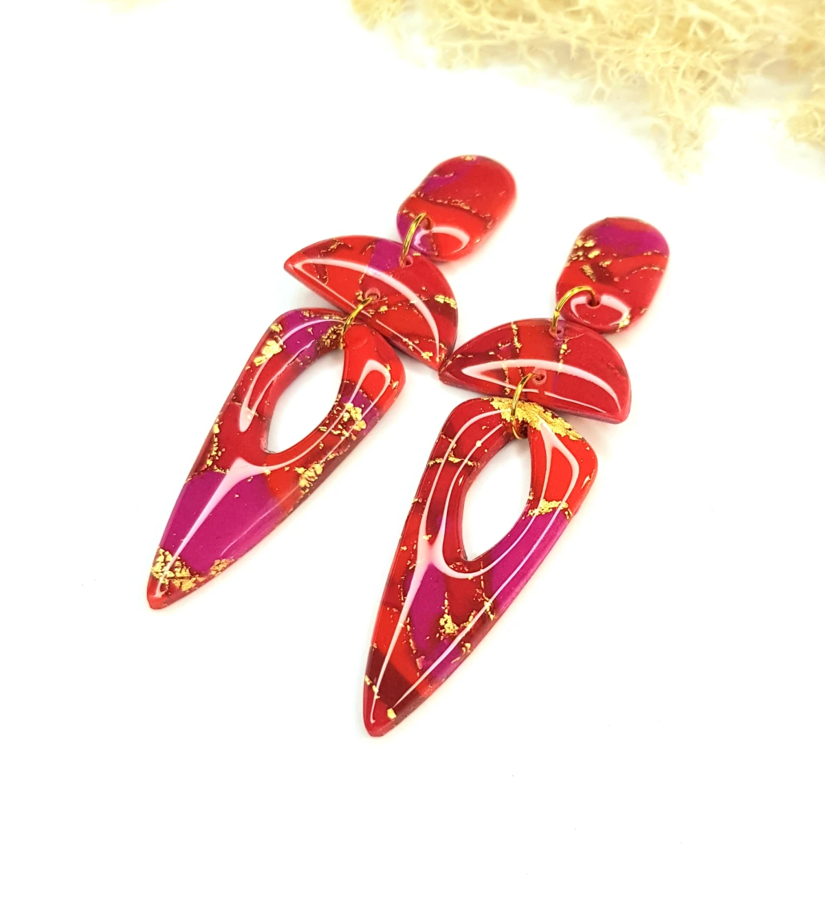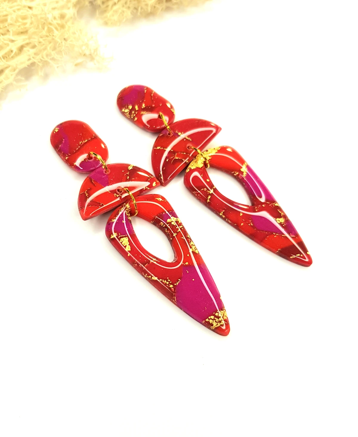 Unikalne kolczyki z gliny polimerowej- idealny prezent na Walentynki! Kolczyki mają 8 cm długości i wyróżniają się odważnym połączeniem czerwieni i fuksji, przeplatanym złotymi akcentami. Ich nowoczesny, geometryczny design i ręcznie wykonane detale sprawiają, że są nie tylko wyjątkową biżuterią, ale także symbolem miłości i pasji. Lekkie, efektowne i pełne blasku - idealne dla osoby, która kocha oryginalne dodatki. Spraw, by te Walentynki były niezapomniane z tymi eleganckimi kolczykami! 💖