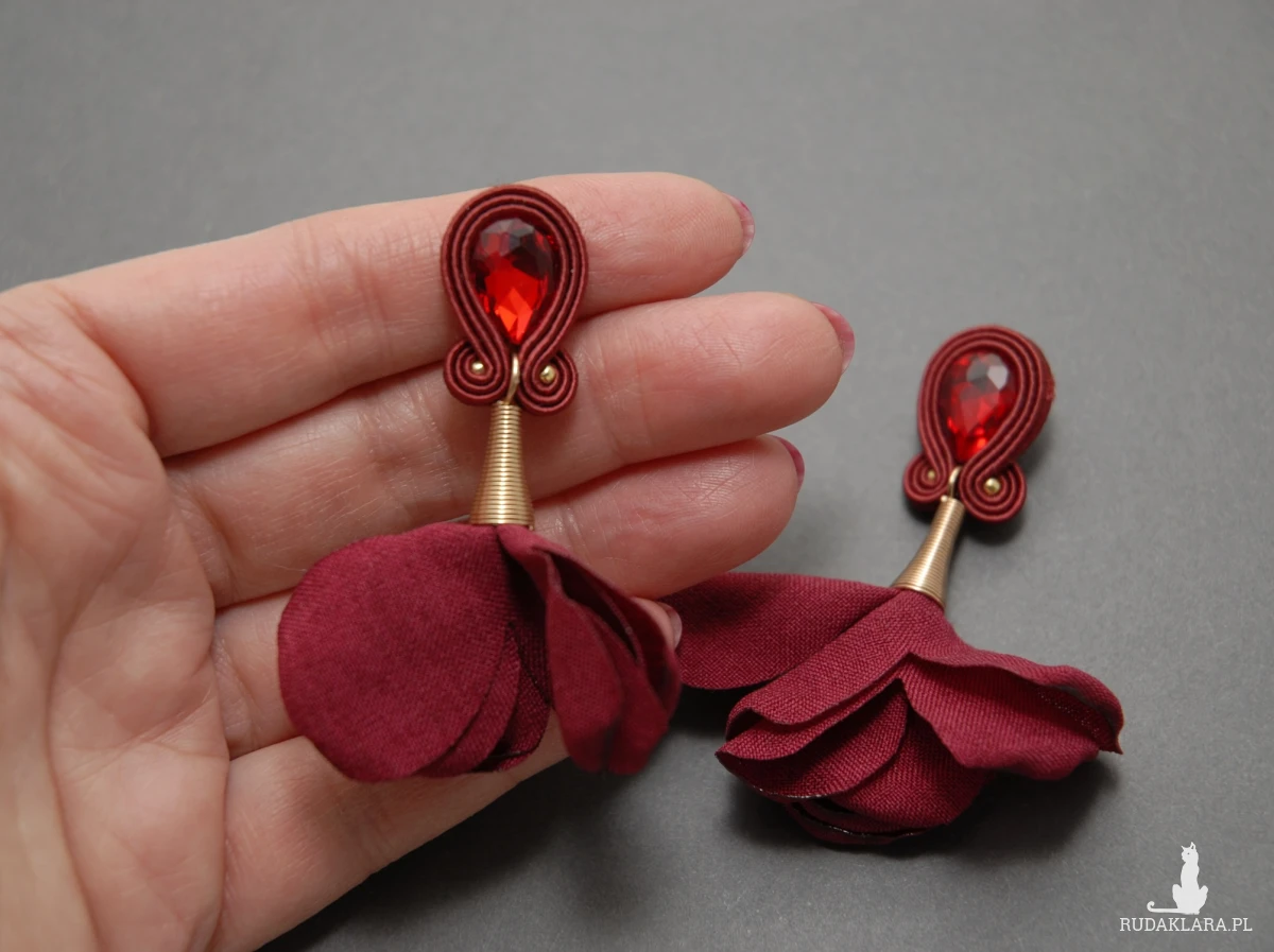 oferuję kolczyki (sztyfty) lub klipsy zrobione techniką sutasz, ozdobione fasetowanymi szklanymi kaboszonami i kwiatkami z materiału