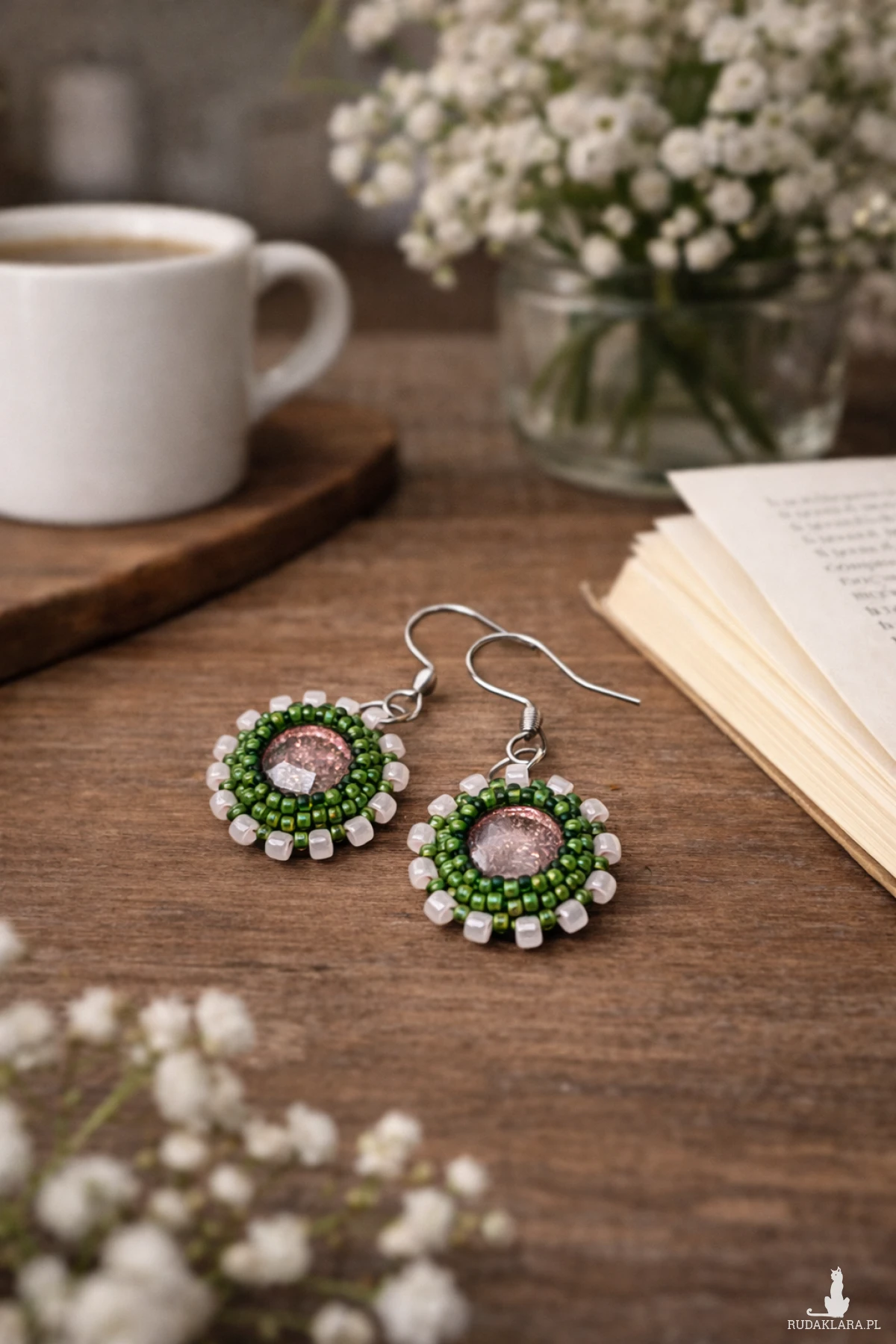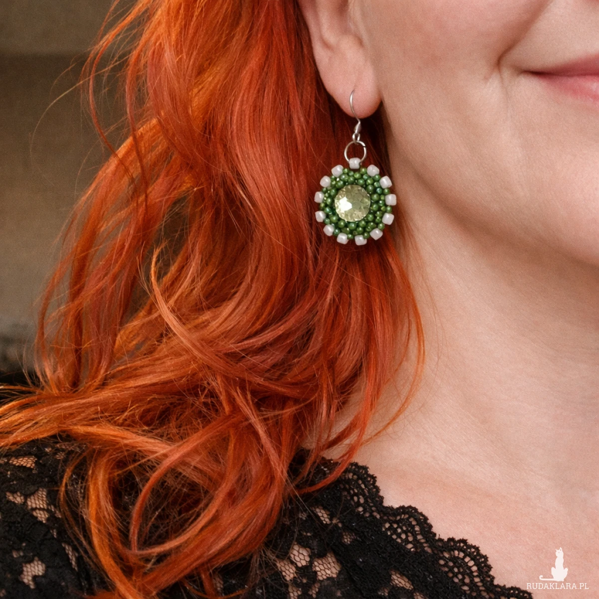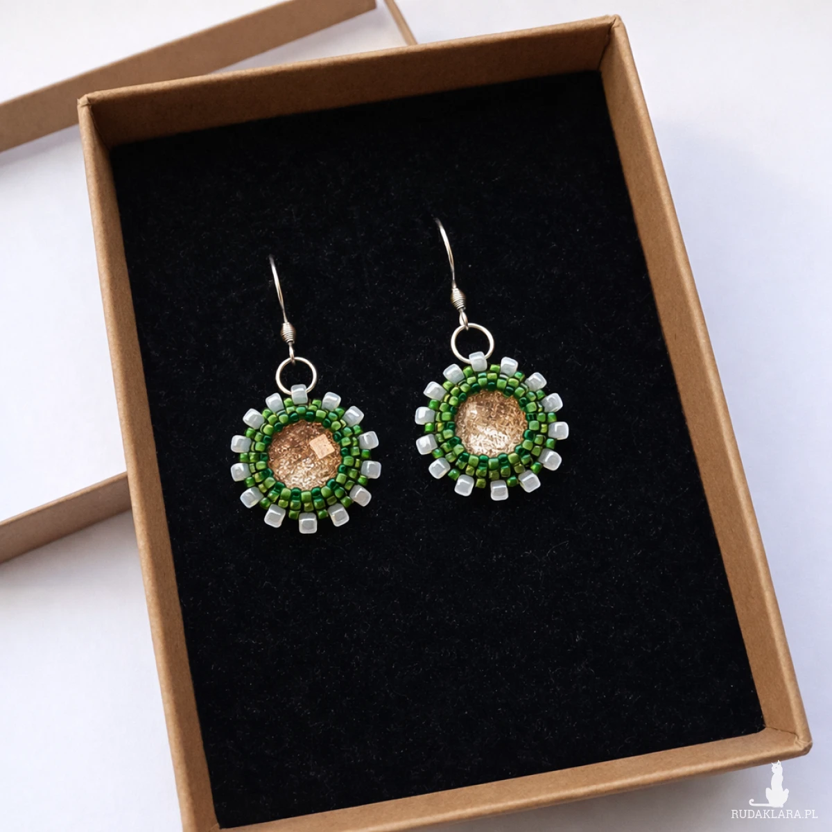 Całość wykonana techniką haftu koralikowego, gdzie każdy koralik jest starannie wyszyty, sprawia, że kolczyki nabierają wyjątkowej faktury i głębi. Błyszczące koraliki odbijają światło, dodając biżuterii elegancji i subtelnego blasku. Pomimo ich niewielkich rozmiarów, kolczyki mają wystarczająco dużo wyrazistości, by stać się wyróżniającym się elementem biżuterii, który z łatwością dopełni zarówno codzienne, jak i bardziej formalne stylizacje. To prawdziwie delikatna, ale przy tym efektowna biżuteria.