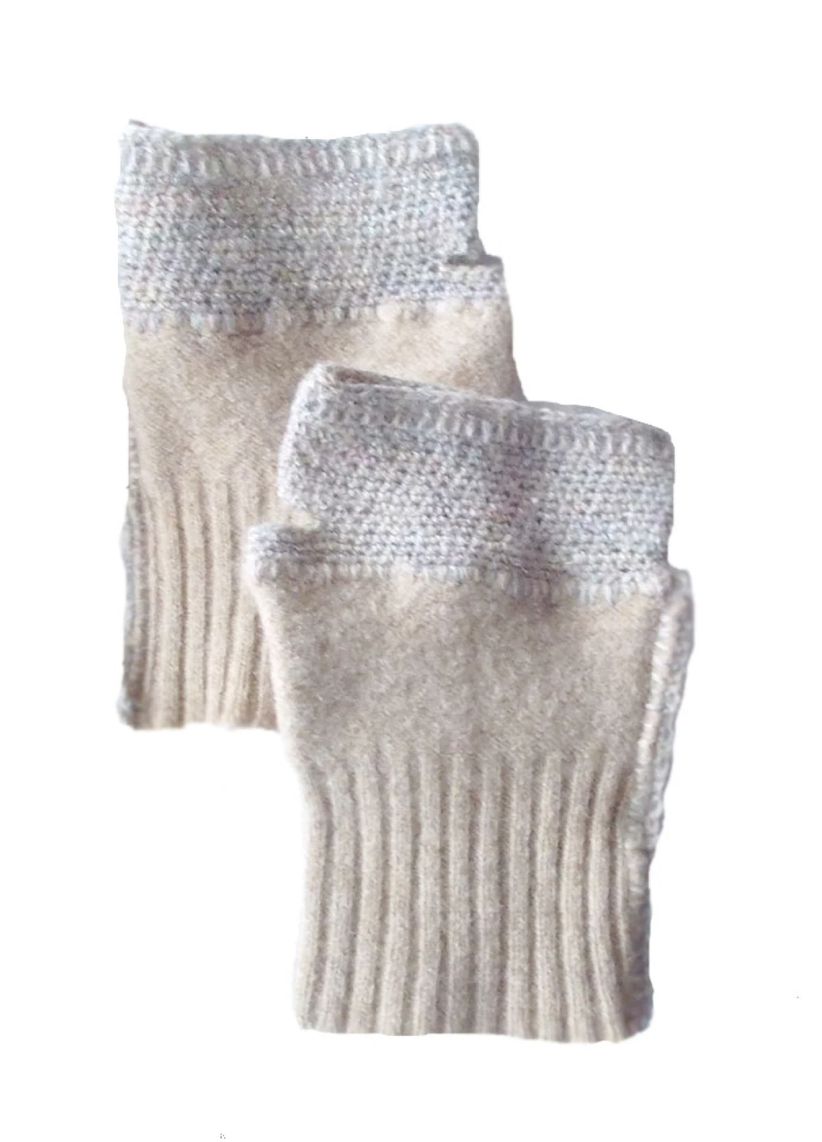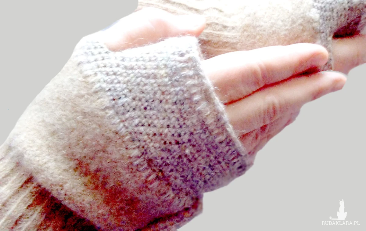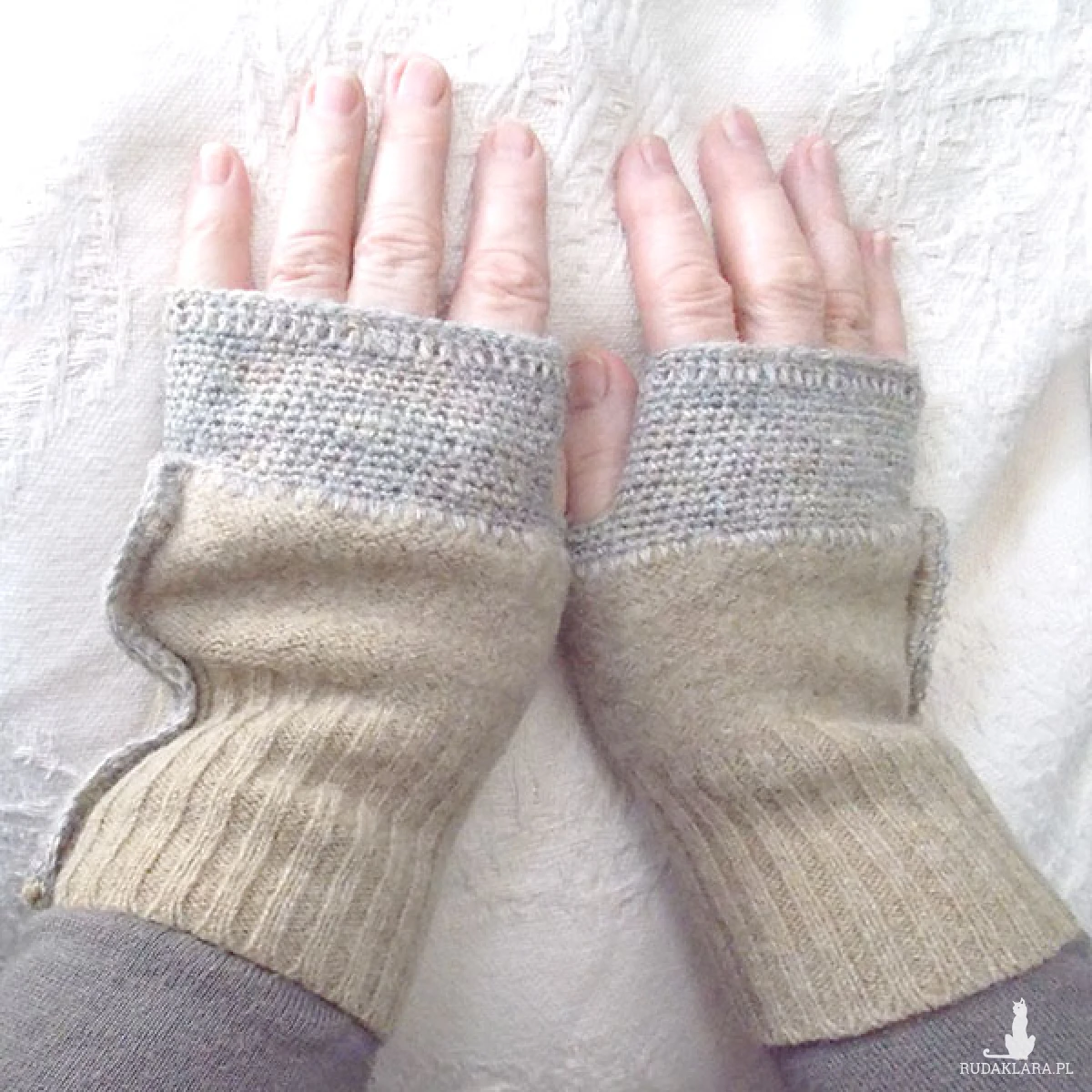 Fajne mitenki w kolorze beżowym, wełniane, wykończenie akrylowe. Prać ręcznie w letniej wodzie. Ciepły i oryginalny dodatek na jesień, zimę.. Wymiary na płasko: szer. dłoni 11 cm, szer. góra 9 cm, szer. dół 9 cm, długość całości 16 cm.