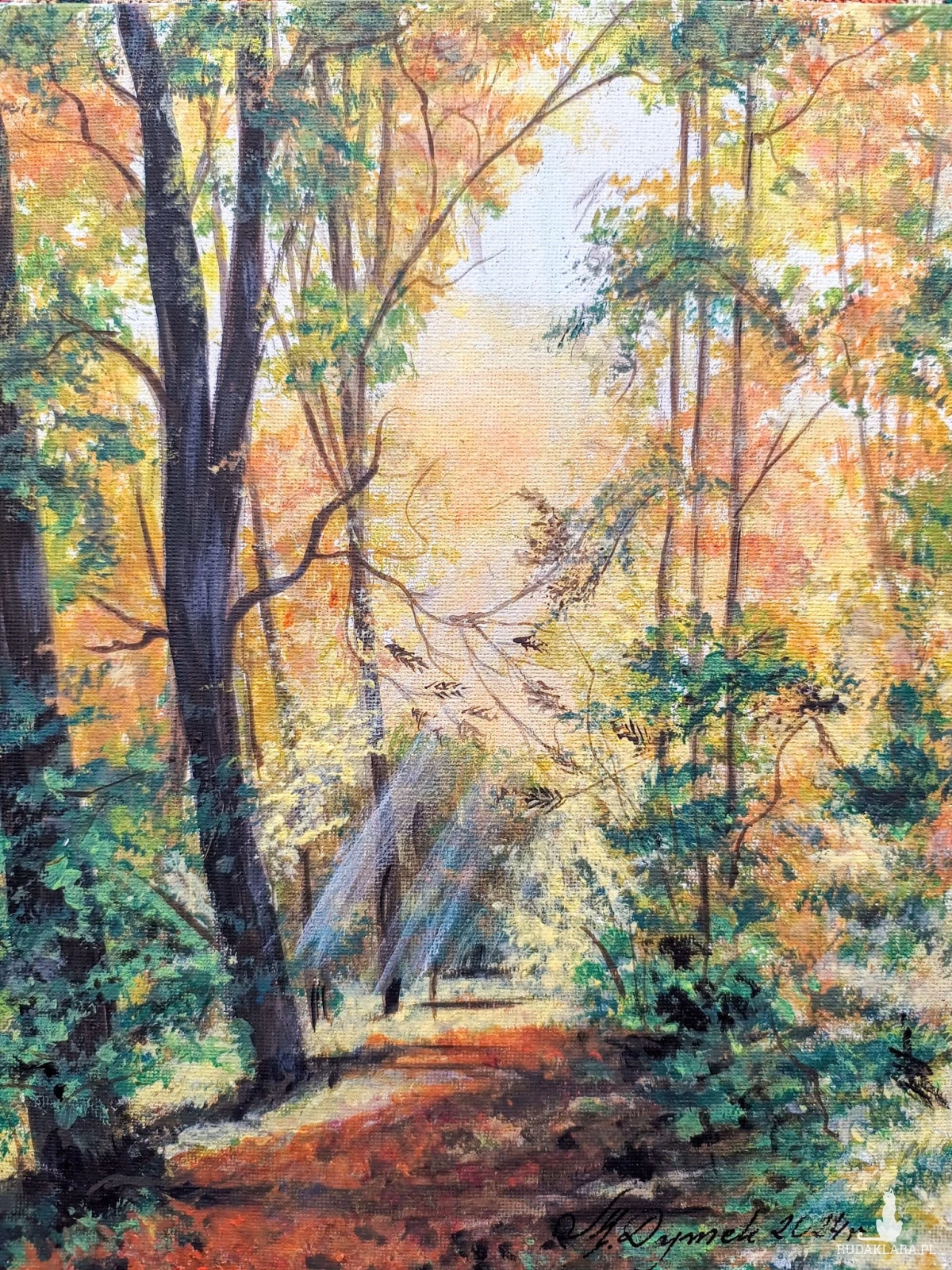 Jeden z kilkudziesięciu ręcznie malowanych obrazów, przedstawiających pejzaże, których motywem przewodnim jest piękno lasów, gór, potoków, zmieniająca się roślinność na przestrzeni dni i miesięcy. Krajobrazy tworzą serie kolorystyczne: "wiosna", "lato", "jesień", "zima".