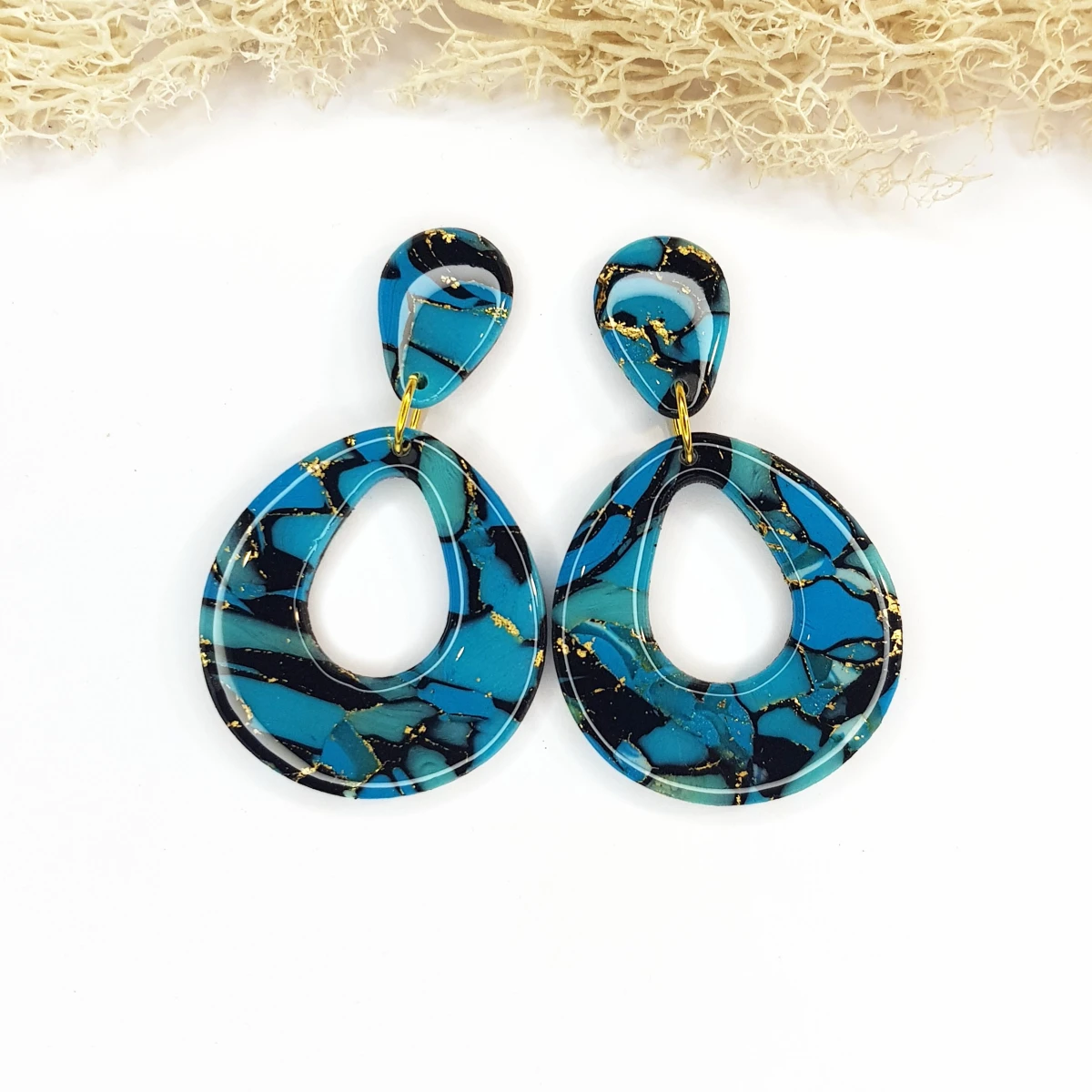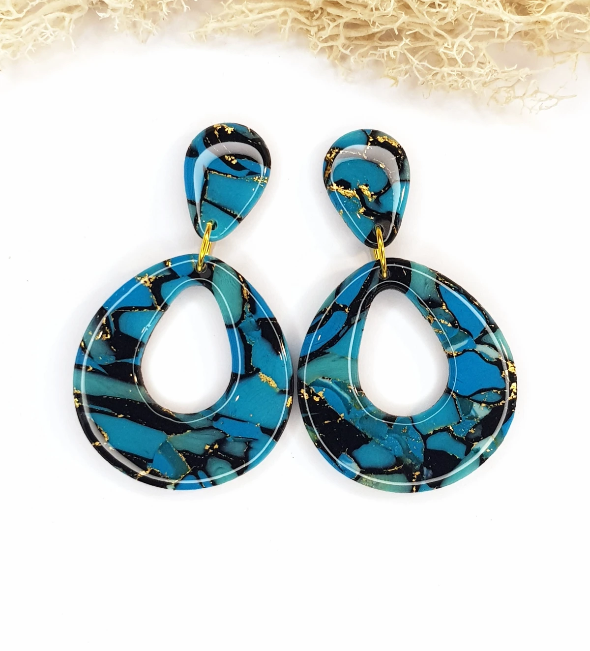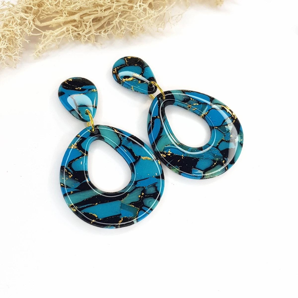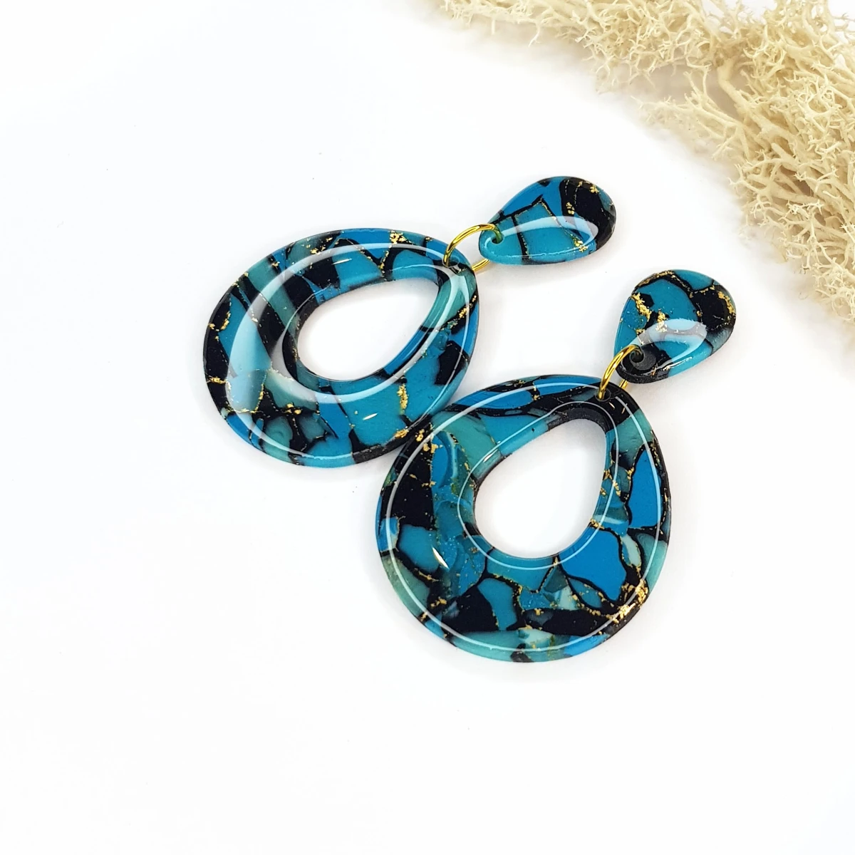 Te kolczyki to połączenie głębi czerni i hipnotyzującego turkusu, zamknięte w eleganckiej formie o długości 7 cm! 🌊🖤 Wykonane ręcznie z gliny polimerowej i powleczone żywicą epoksydową, zachwycają intensywnym kolorem i lustrzanym połyskiem. Turkusowe wzory przypominają oceaniczne fale rozbijające się o nocne niebo, tworząc efekt tajemniczej głębi. Dzięki swojej długości są wyraziste, ale jednocześnie lekkie i wygodne w noszeniu – idealne zarówno na wieczorne wyjście, jak i do podkręcenia codziennego looku. Każda para jest niepowtarzalna, niczym abstrakcyjne dzieło sztuki noszone przy uchu. To biżuteria dla odważnych dusz, które kochają kontrasty i uwielbiają błyszczeć!