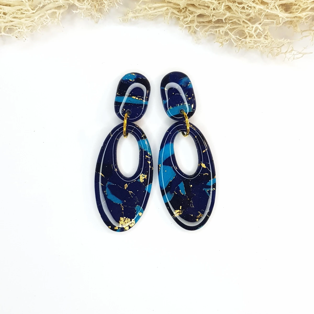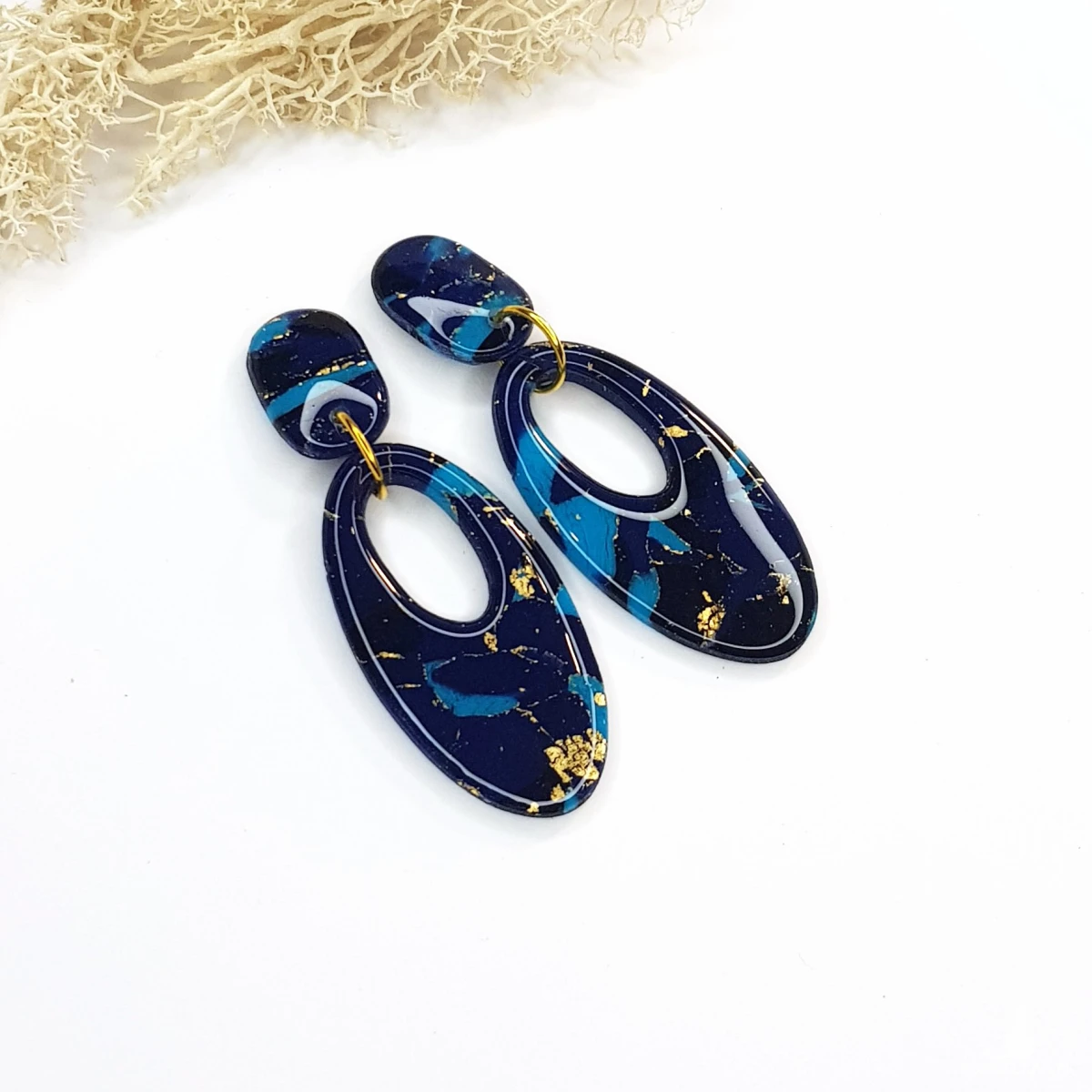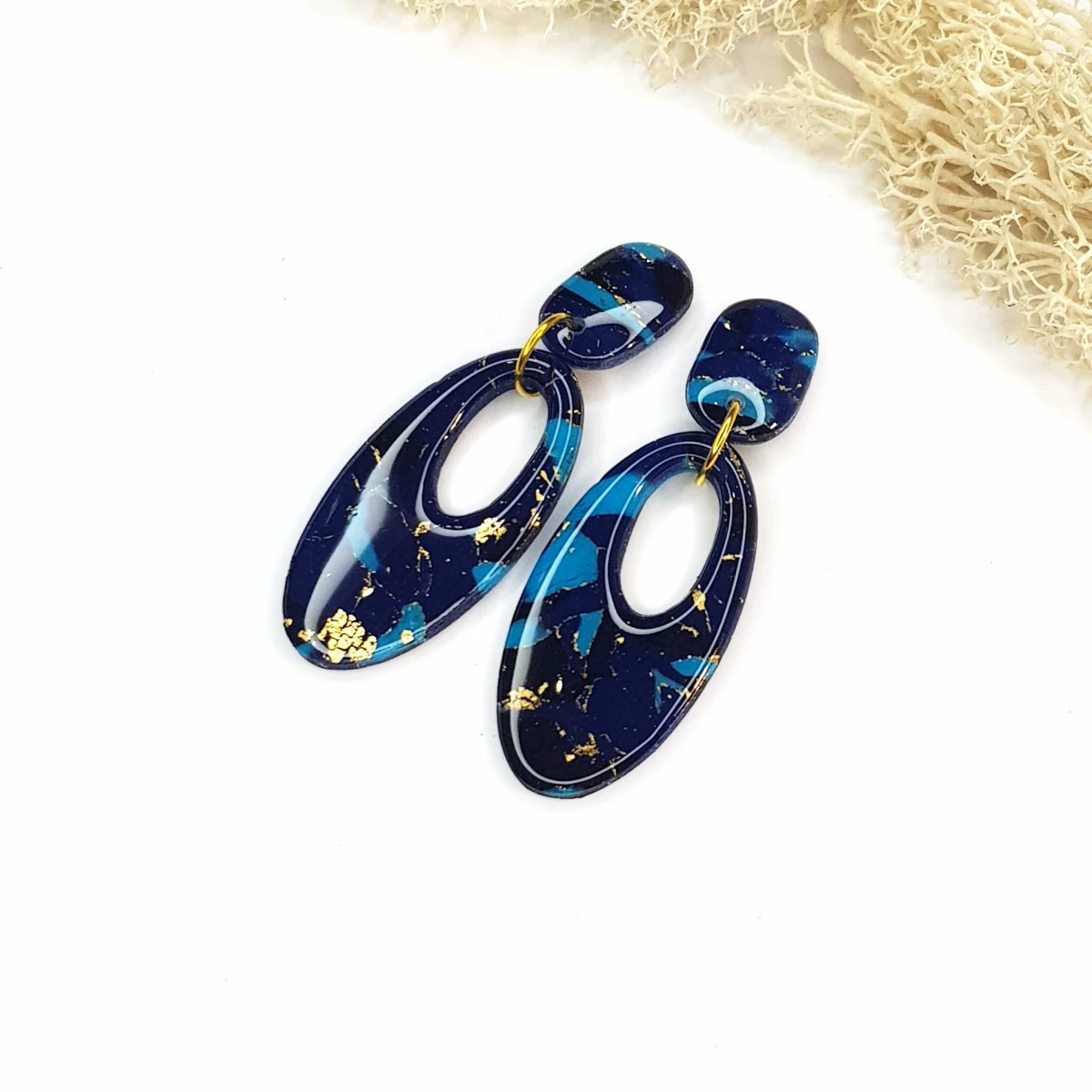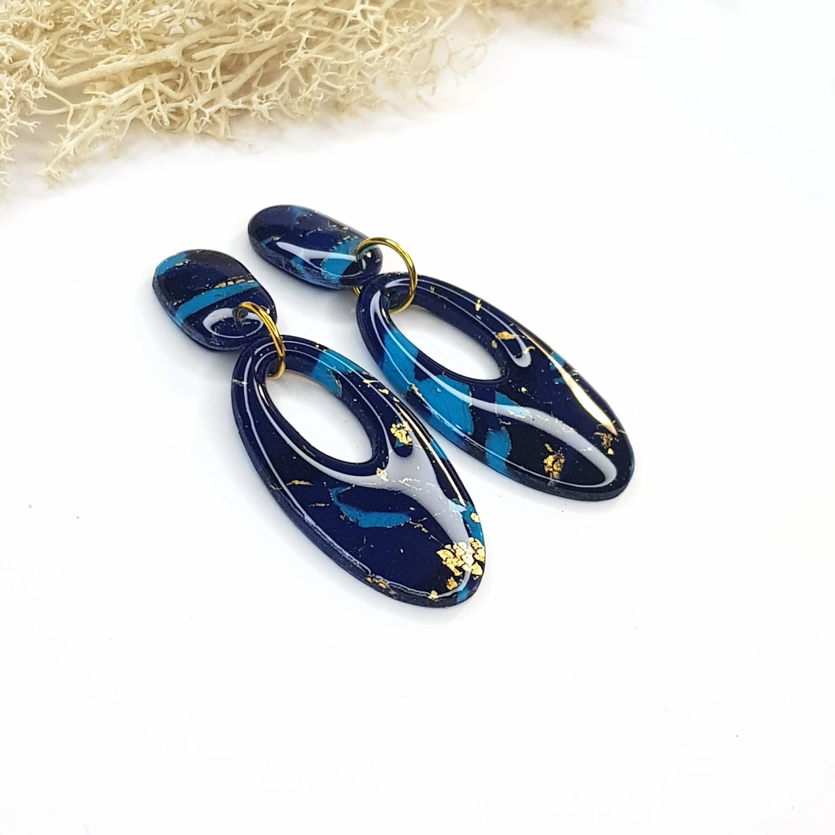 Te kolczyki to jak mały kawałek nocnego nieba pełnego złotych gwiazd! ✨ Granatowy kolor przypomina kosmos, a turkusowe akcenty dodają im tajemniczej głębi – jakbyś miała na uszach galaktyczną mgławicę. Złote drobinki połyskują jak spadające meteory, dodając elegancji i odrobiny luksusu. Ich wydłużony, owalny kształt oraz długość 6,5 cm nadają im lekkości i szyku, a jednocześnie sprawiają, że pięknie się układają przy ruchu. Są ręcznie wykonane z modeliny, więc każdy egzemplarz jest absolutnie wyjątkowy – jak gwiazda na nocnym niebie. To idealne kolczyki dla kogoś, kto lubi błyszczeć i zachwycać swoją kosmiczną aurą
