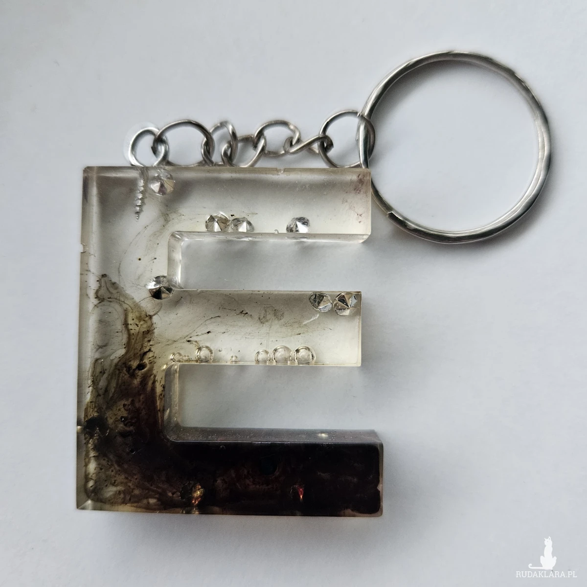 Brelok literka E z żywicy czarny z diamencikami coca cola