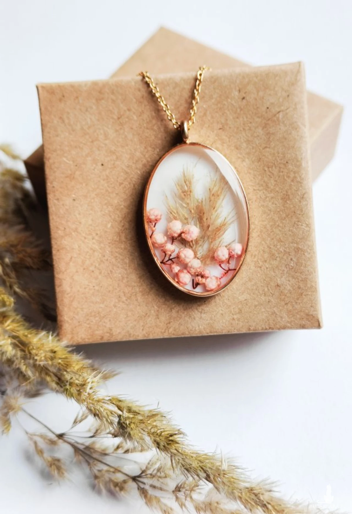 Uroczy wisiorek z zatopionymi suszonymi kwiatami oraz kłosem trawy. Wykonany z wysokiej klasy żywicy, która nie zmienia koloru pod wpływem promieniowania uv oraz wysokiej jakości stali chirurgicznej.