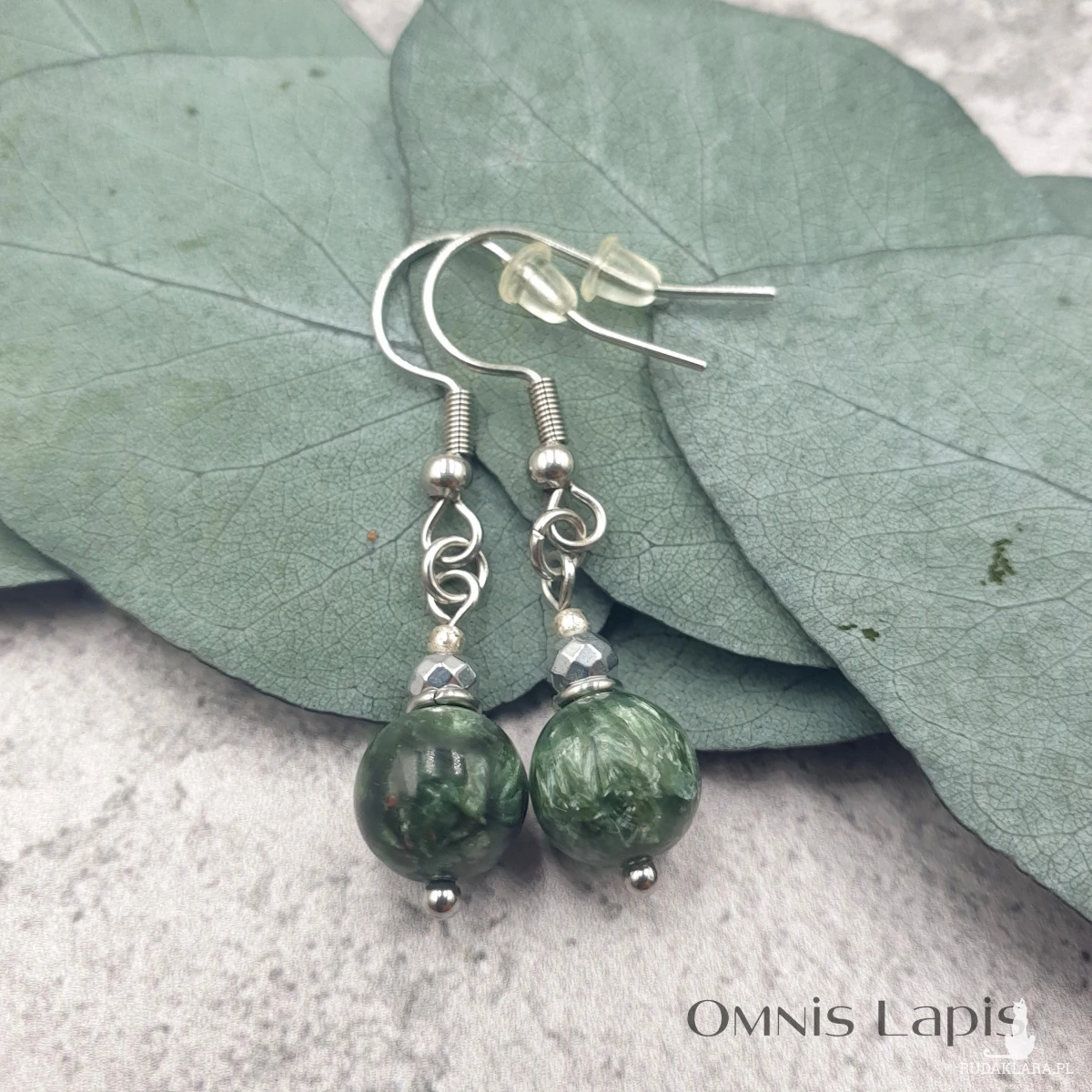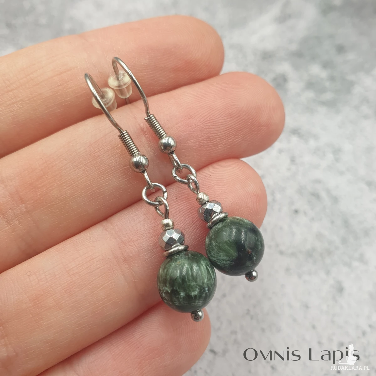 Delikatne, kobiece kolczyki w kolorze tajemniczej zieleni. Ozdobione kulami naturalnego serafinitu oraz fasetowanymi hematytami. Wykonane ze stali szlachetnej.