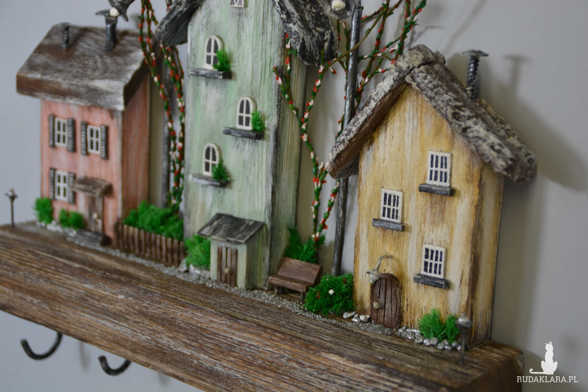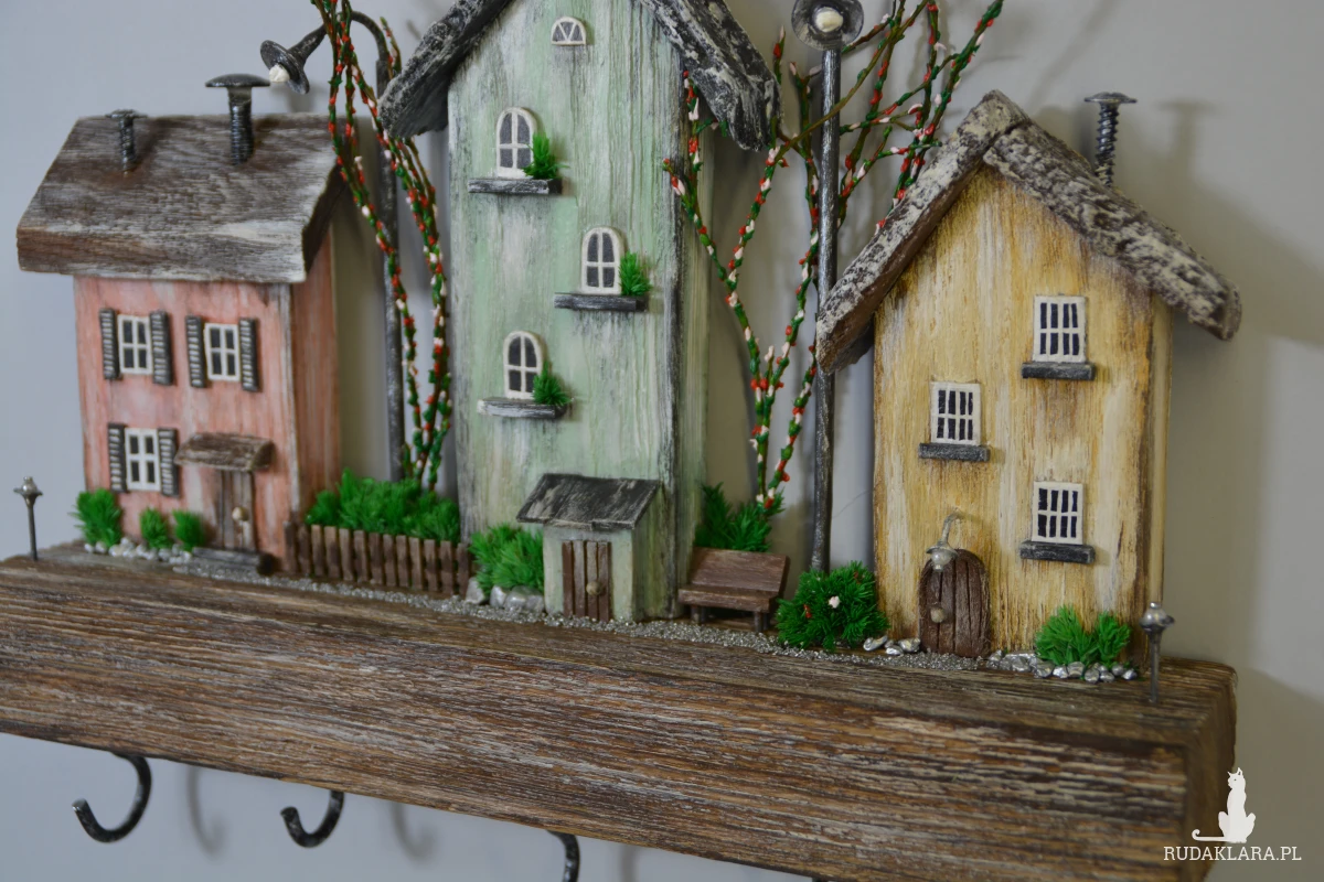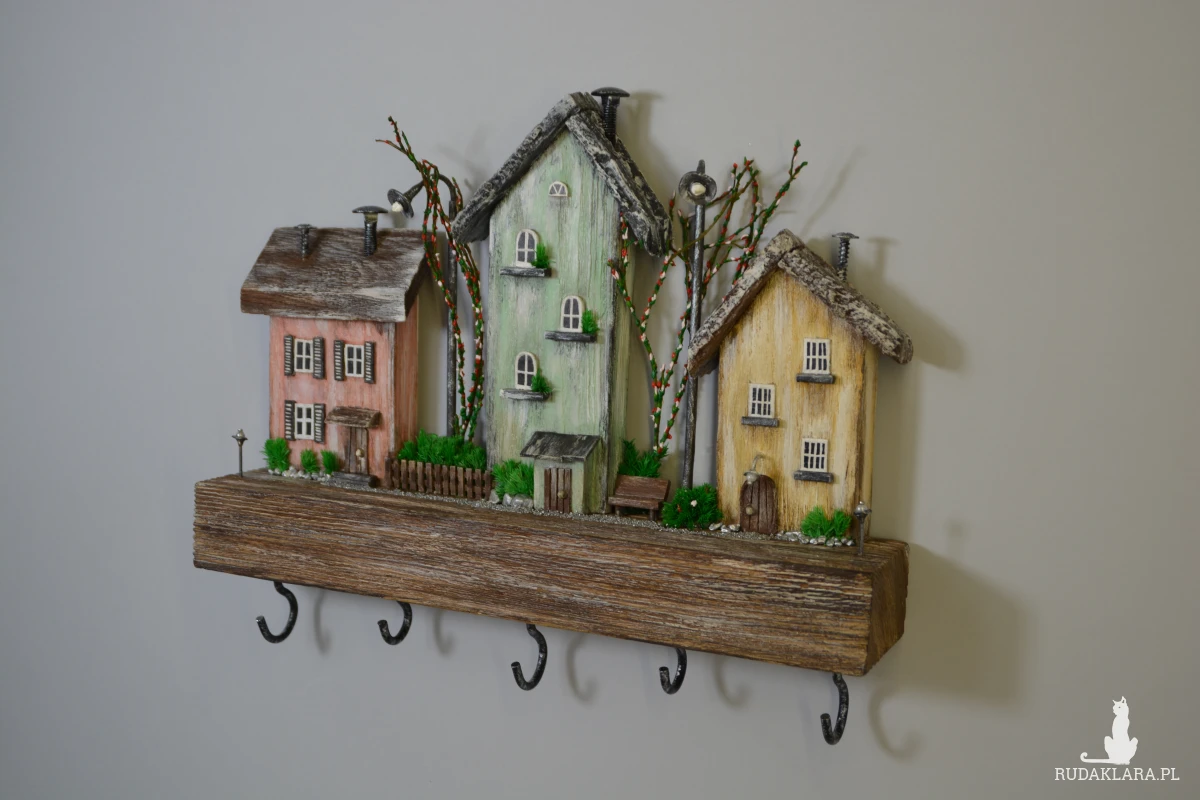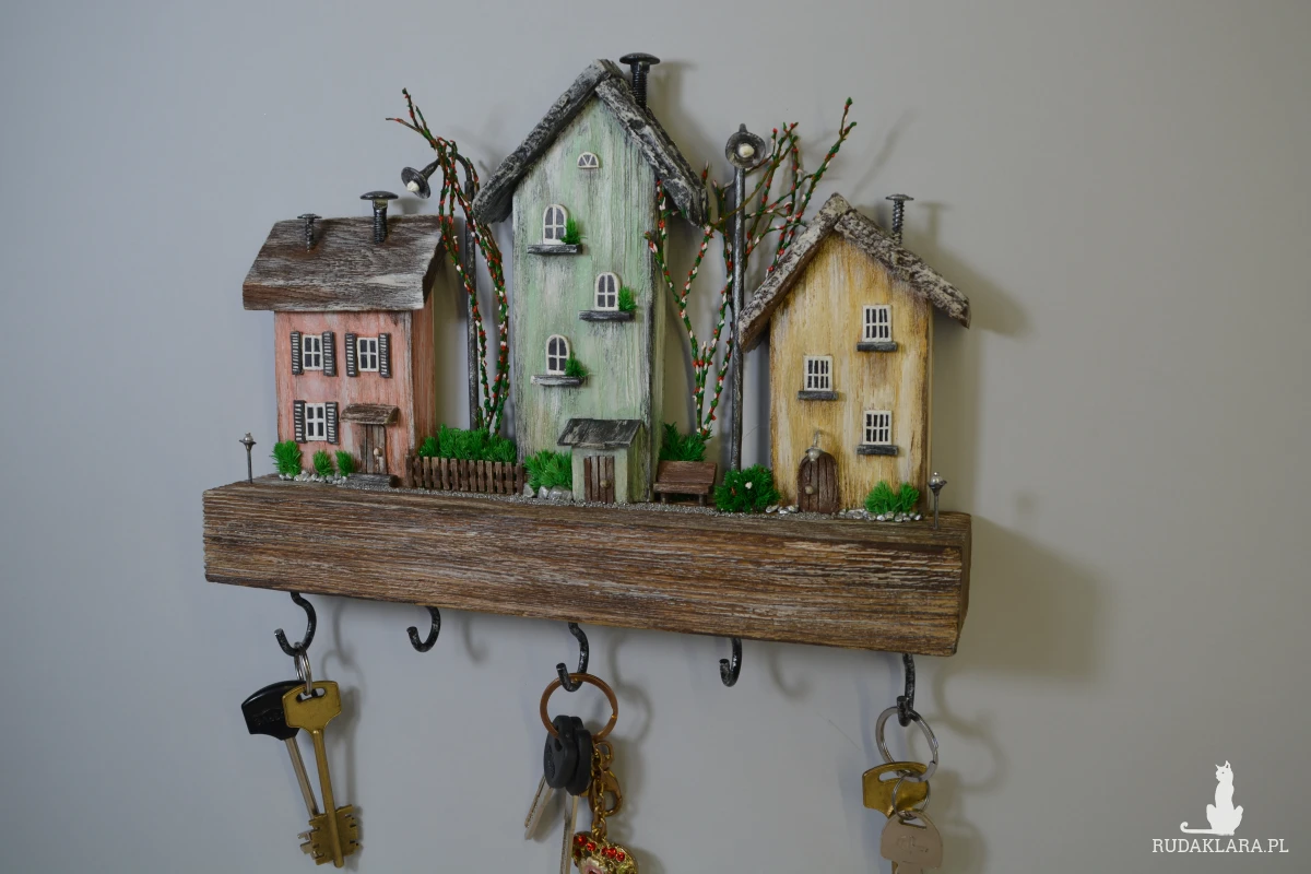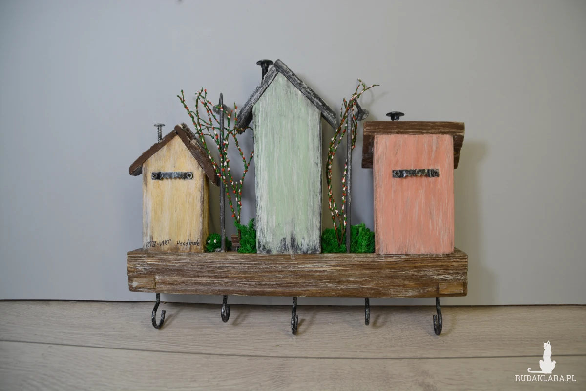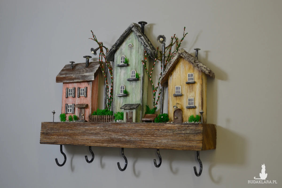 Ten drewniany wieszak na klucze wykonany jest z drewna sosnowego. Małe drewniane domki ze starego drewna oraz śrub, gwoździ, podkładek do śrub i nie tylko. Domy są ręcznie malowane ekologicznymi farbami na bazie wody. Wszystkie materiały, których używam są ekologiczne, pochodzą z napraw i recyklingu. Daję drugie życie starym, zapomnianym materiałom.