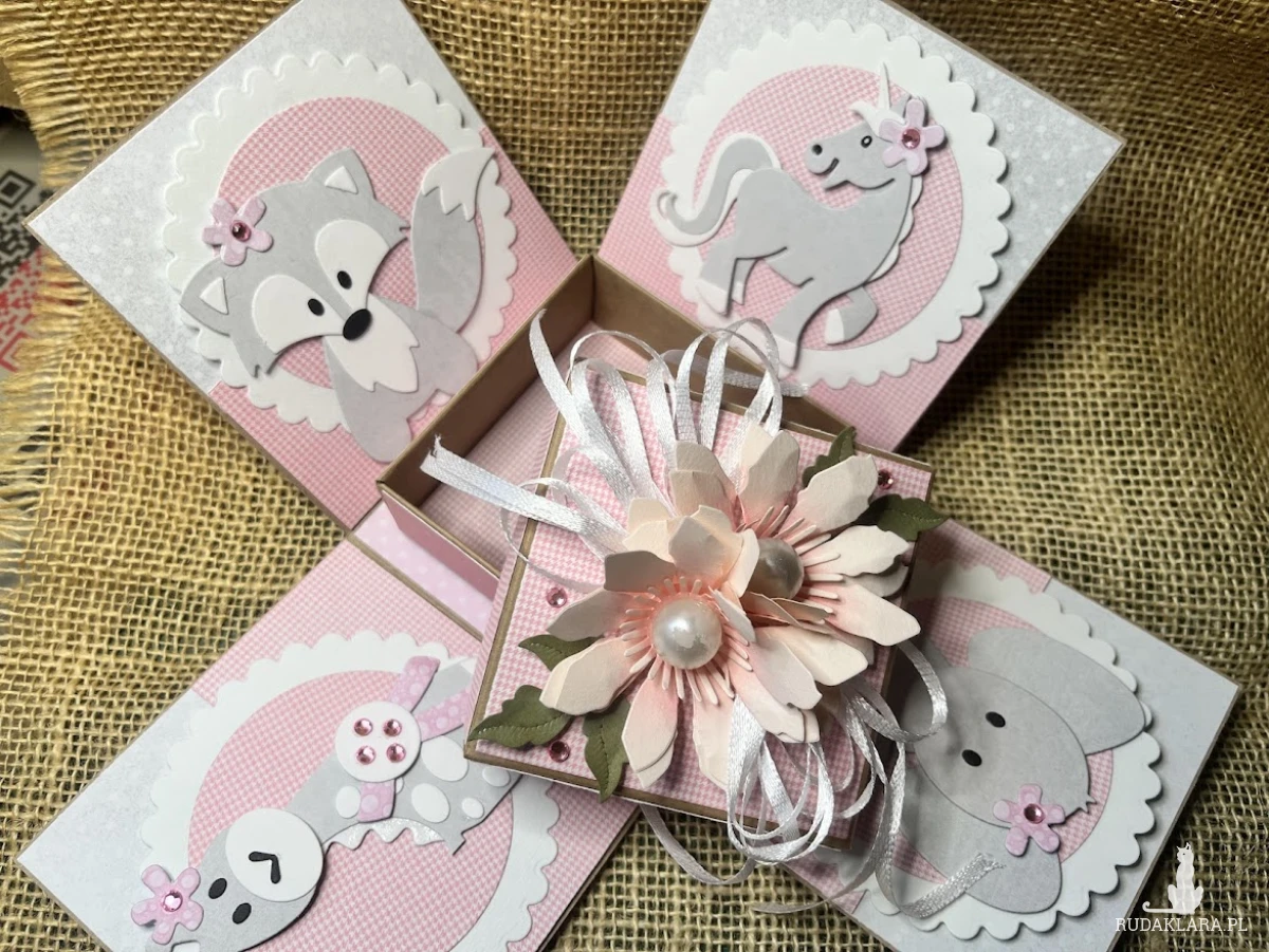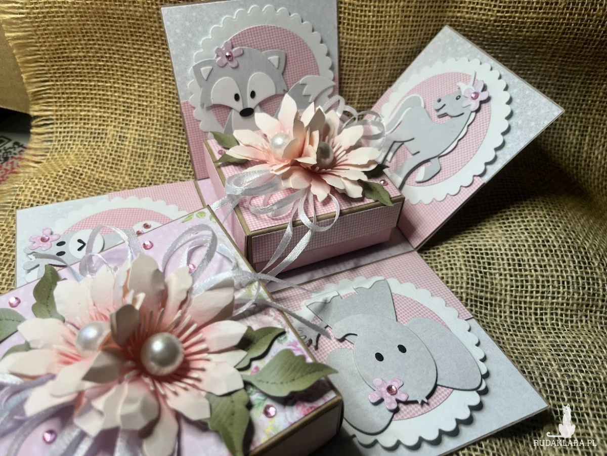 Exploding box na chrzest,narodziny lub roczek ze słodkimi zwierzątkami w pastelowych kolorach - wersja dla dziewczynki.Pudełeczko wykonane z największą dbałością o szczegóły.Wieczko ozdobione kompozycją kwiatową. W środku znajduje się jeszcze jedno pudełeczko na małe co nieco,pod wieczkiem boxa umieszczone są życzenia odpowiednie do uroczystości lub czysty karnecik na wypisanie własnych życzeń.Na czterech ściankach pod zwierzątkami znajdują się kieszonki na banknoty lub kupony lotto.Pudełko w tym stanie jest gotowe do natychmiastowej wysyłki w uwagach napisać na jaką okoliczność .