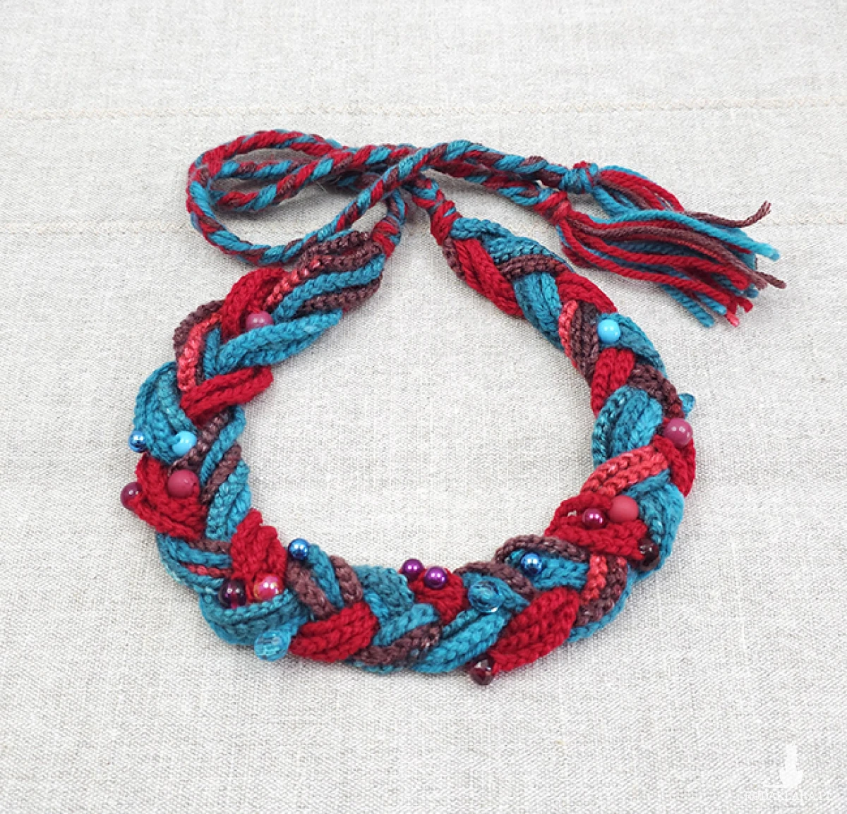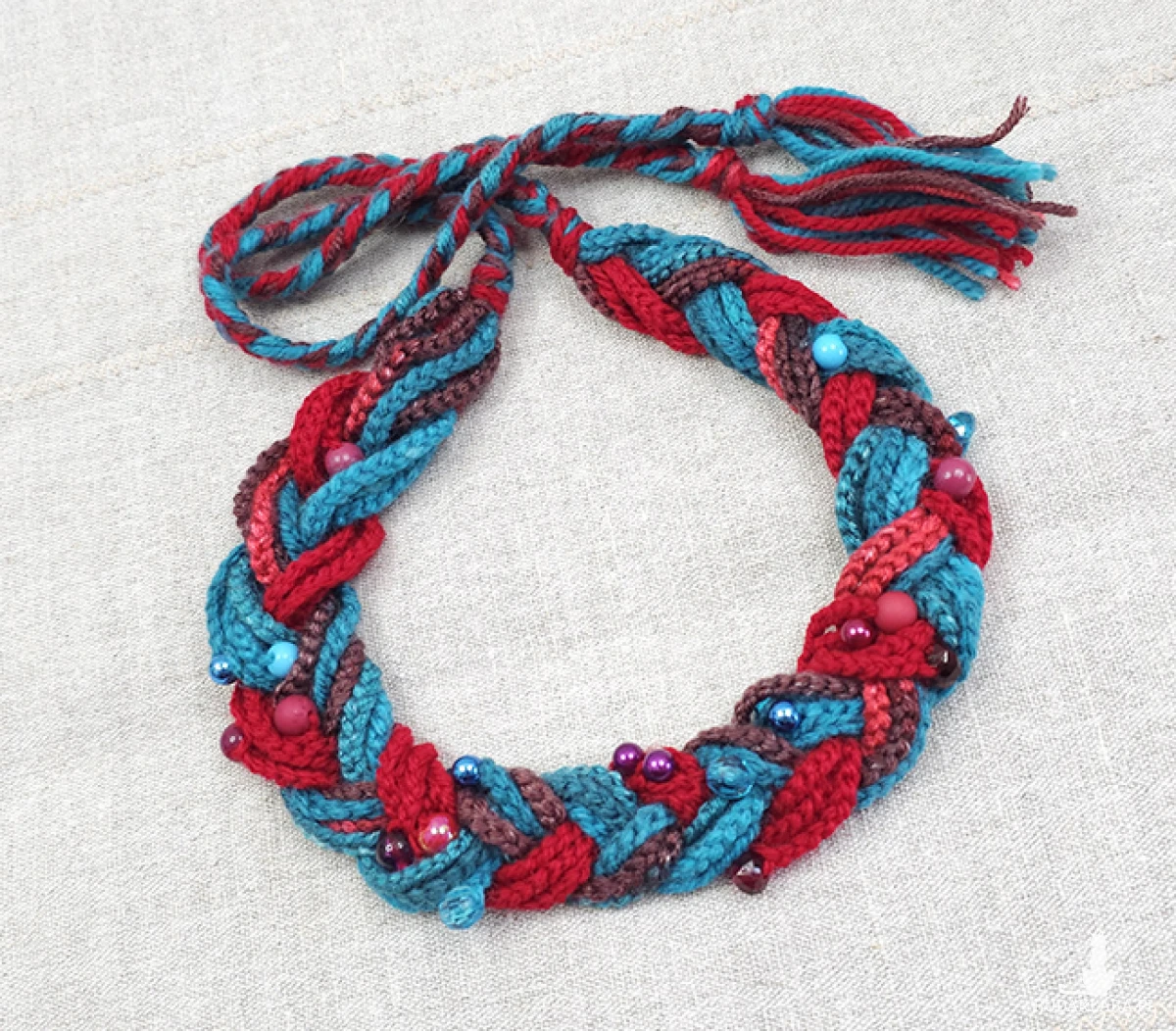 Naszyjnik wykonany z 12 szt. ręcznie plecionych sznurków, splecionych w luźny warkocz.