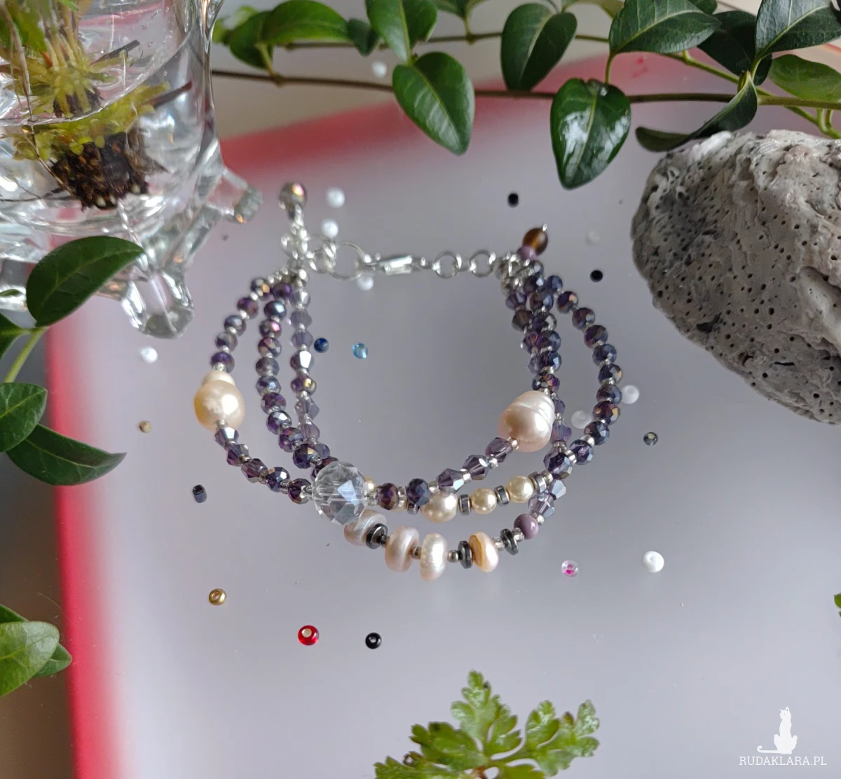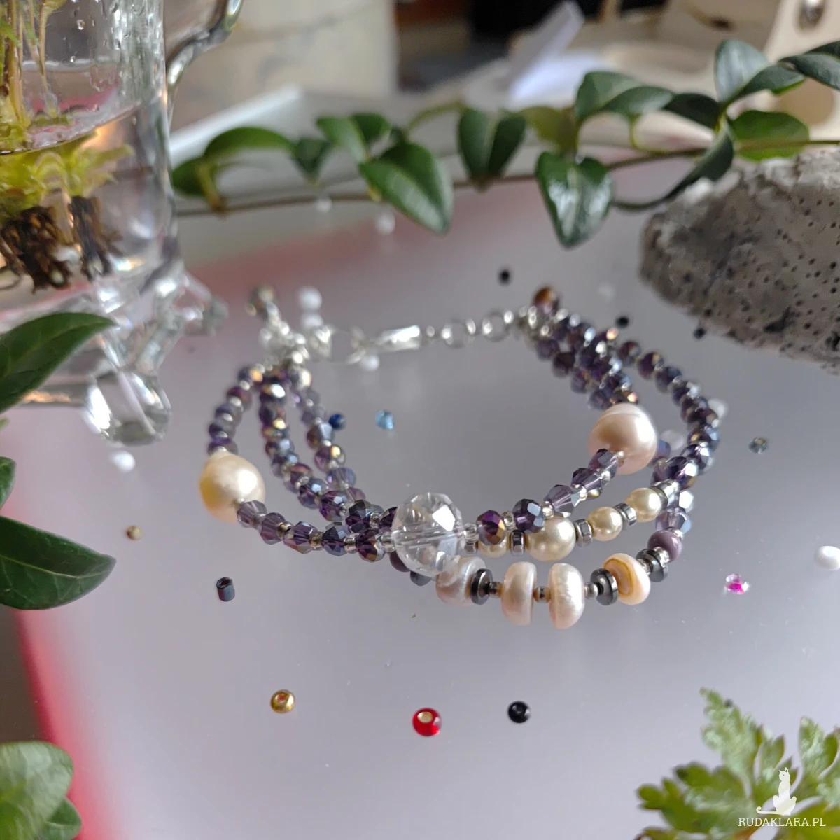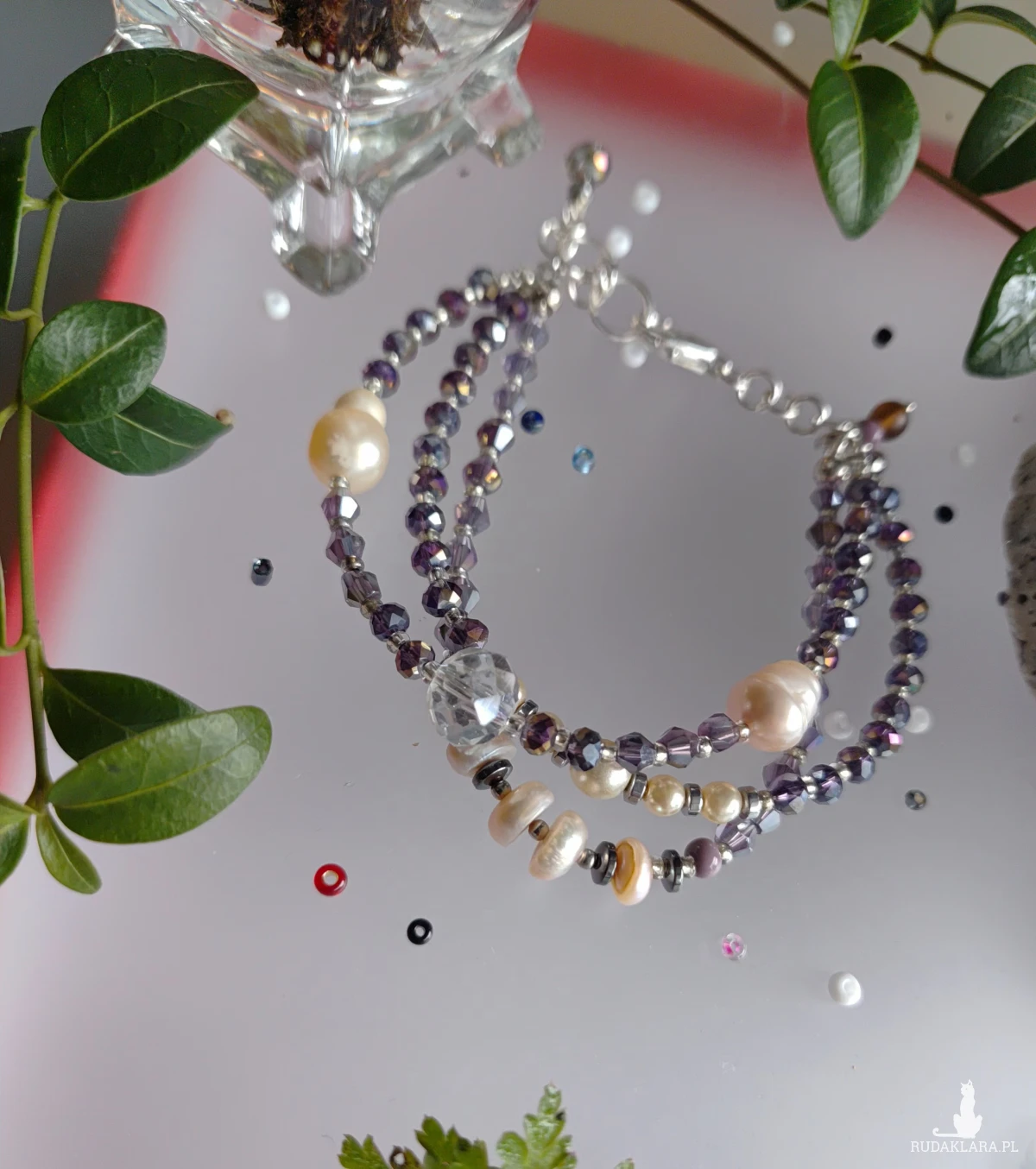 Bransoletka z kryształków szklanych i pereł hodowlanych. Przekładki z koralików szklanych i hematytów w kolorze srebrnym. szklo, metal, perly, obj. 18-20 cm