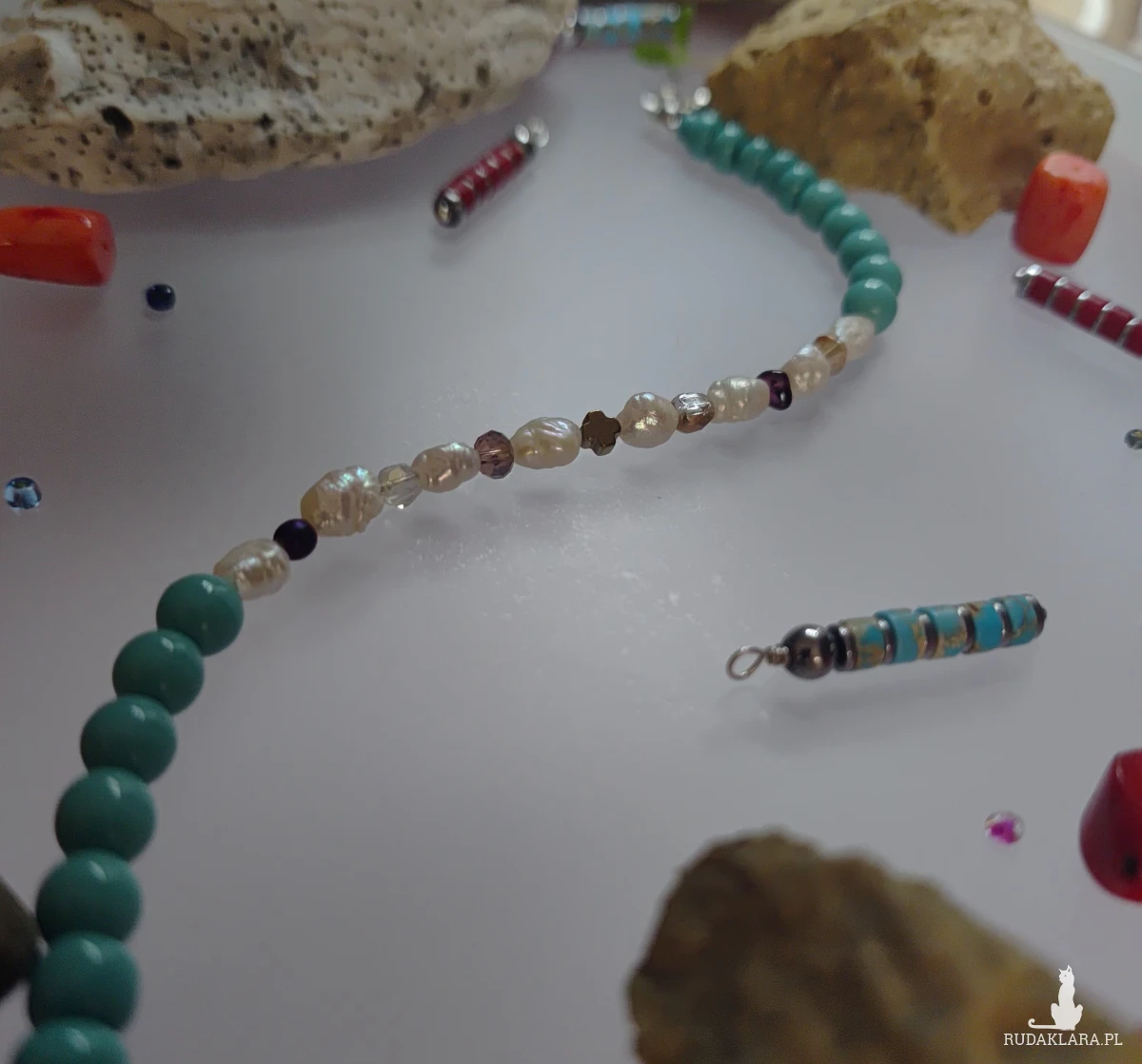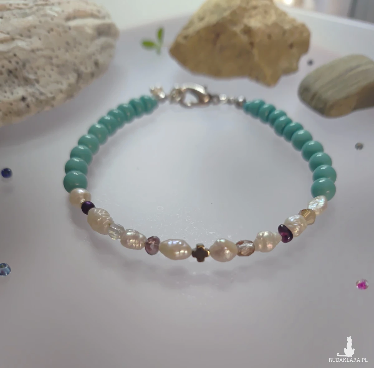 Bransoletka z malenkich perełek hodowlanych w połączeniu z kuleczką granatu, hematytu i innych przekładek malutkich. Kryształki kulki szklane w kolorze turkusowym. Bransoletka ma objętość dużą 21- 22 cm, zapięcie stal