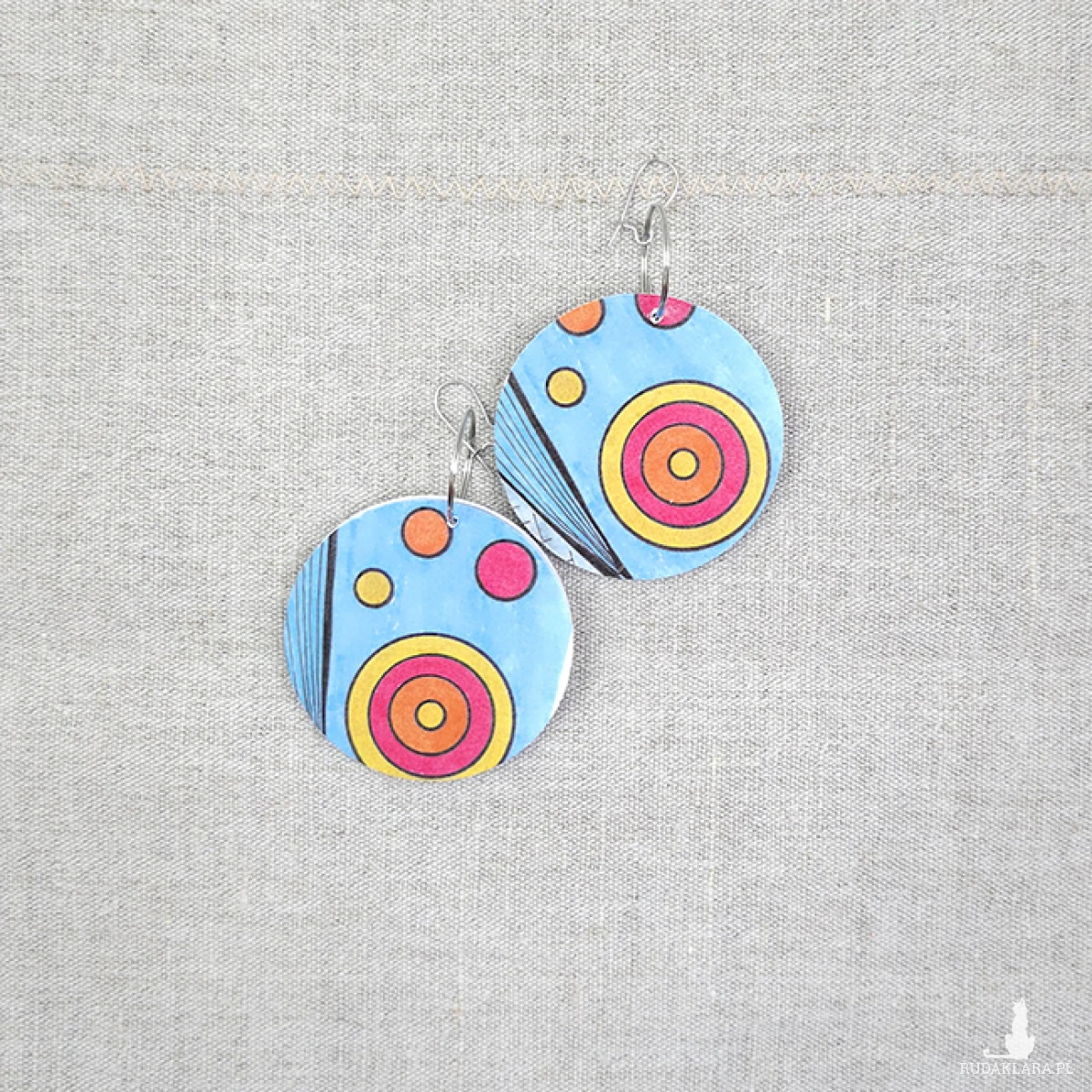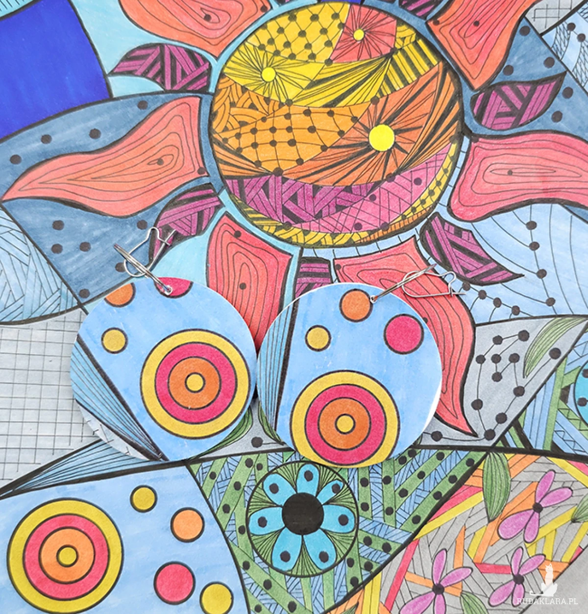 Kolczyki wykonane z drewnianej bazy oraz części mojego autorskiego rysunku "Upał".