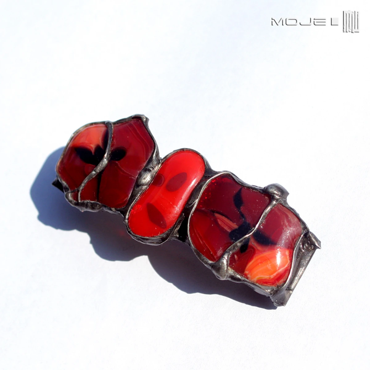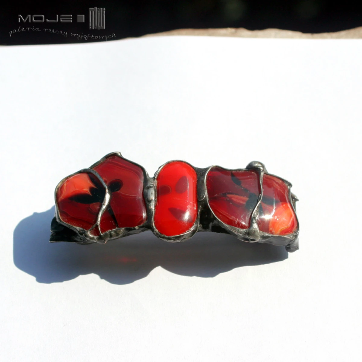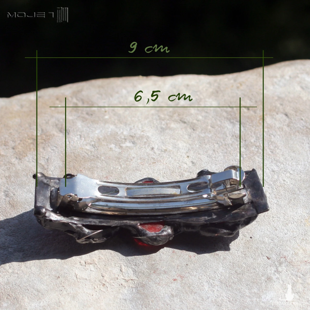Ozdobna klamra do włosów z miedzianej blachy i szklanych kaboszonów w odcieniach czerwieni, bieli i zieleni. Miedź jest cynowana, patynowana i przecierana. Klamra to standardowy metalowy mechanizm.
