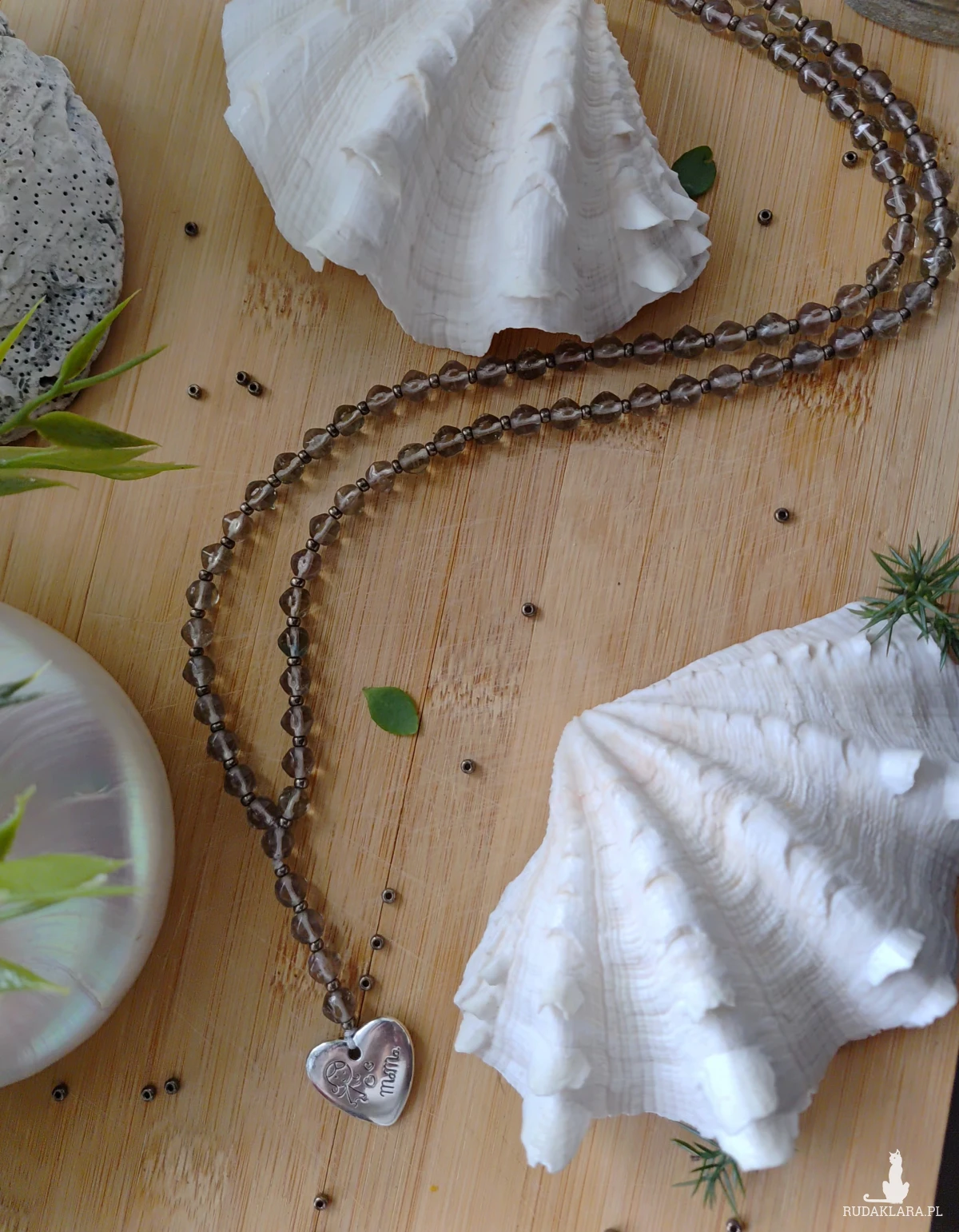 Naszyjnik korali szklanych 6 mm, kryształki przydymione z przekładkami w kolorze starego srebra. Zawieszka metalowa z napisem mama w kształcie serduszka 2 cm, naszyjnik na sznurku syntetycznym. Długość 44 cm