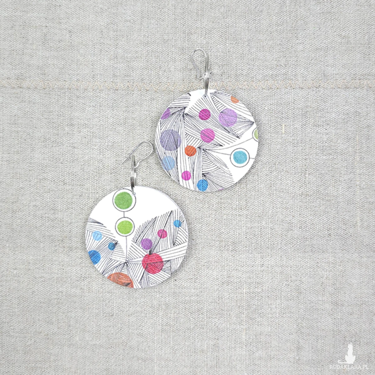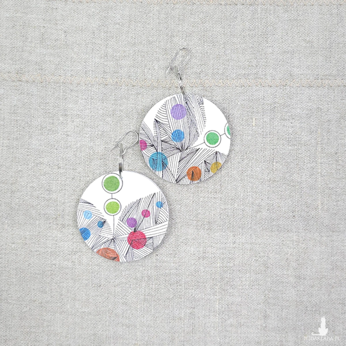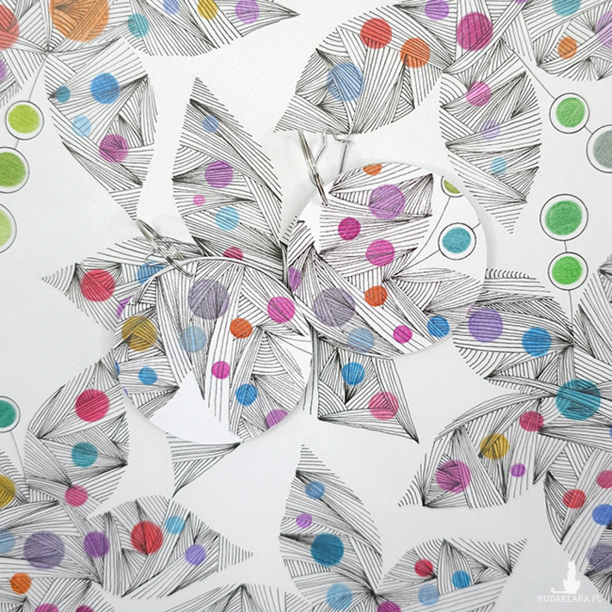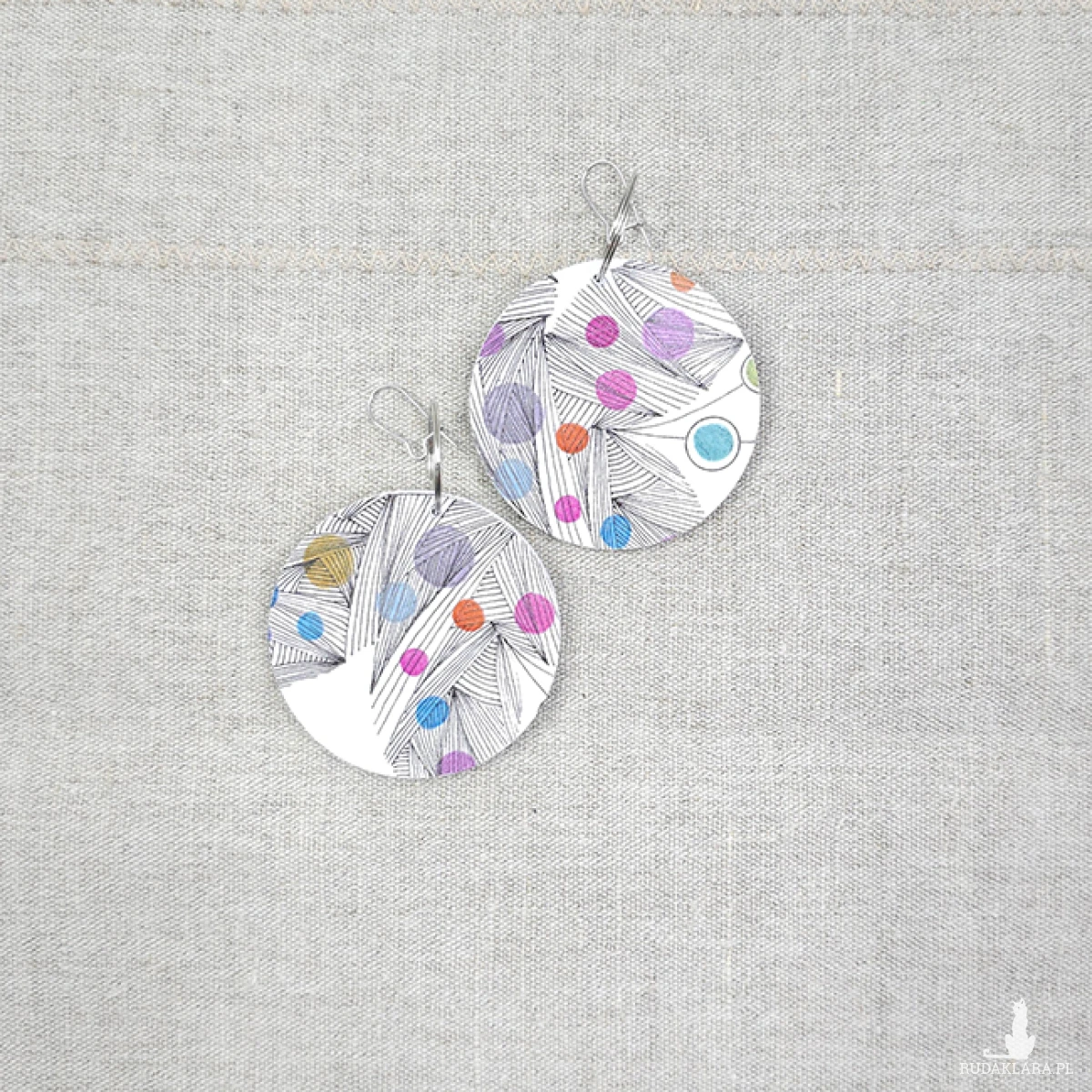 Kolczyki wykonane z drewnianej bazy oraz części mojego autorskiego rysunku "Kropki - kreski".