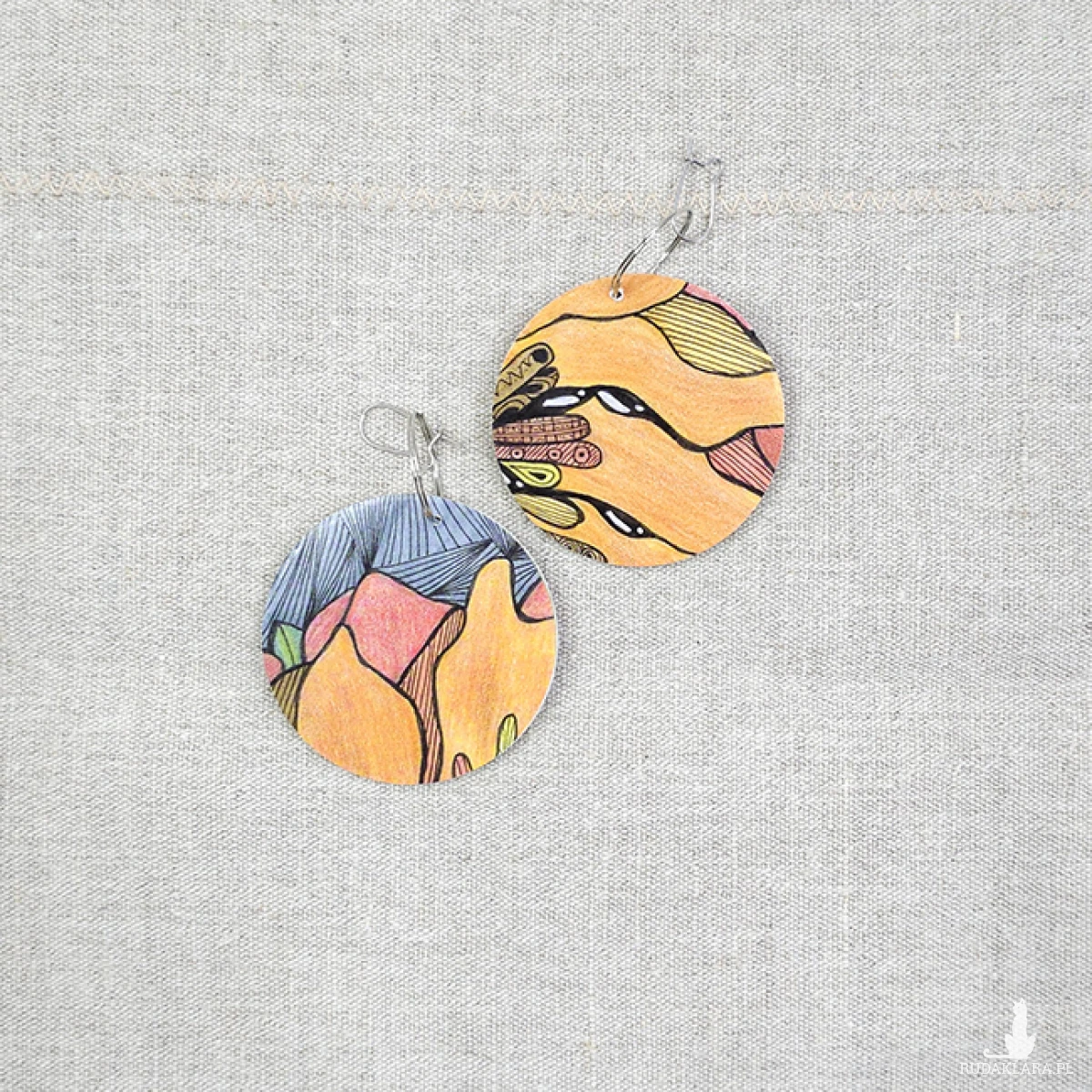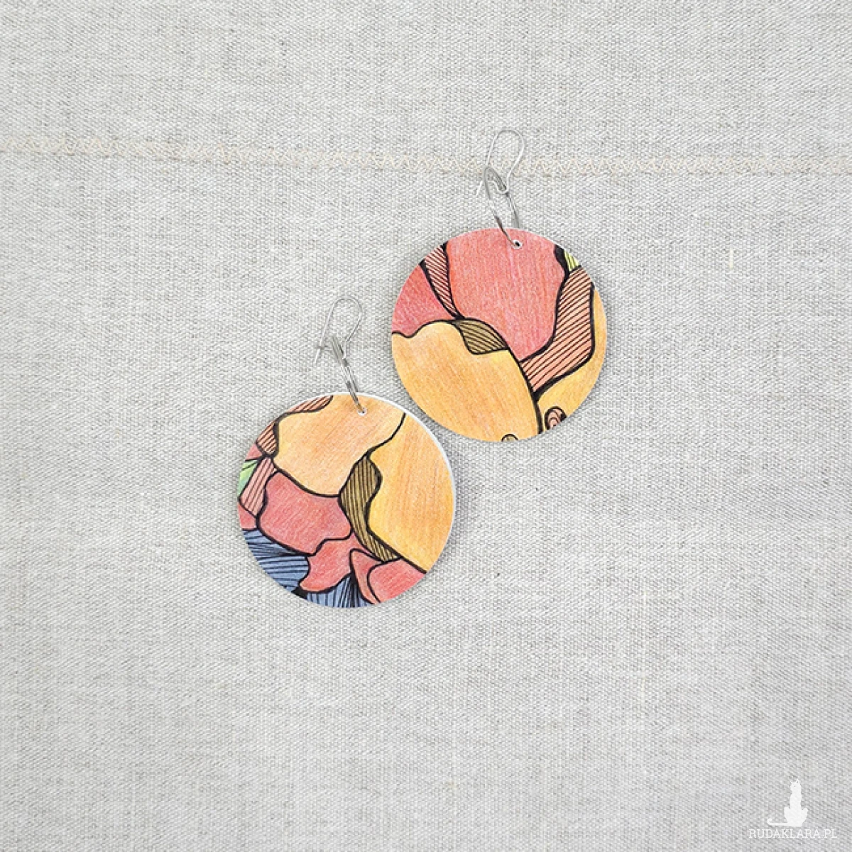 Kolczyki wykonane z drewnianej bazy oraz części mojego autorskiego rysunku "Chryzantema".