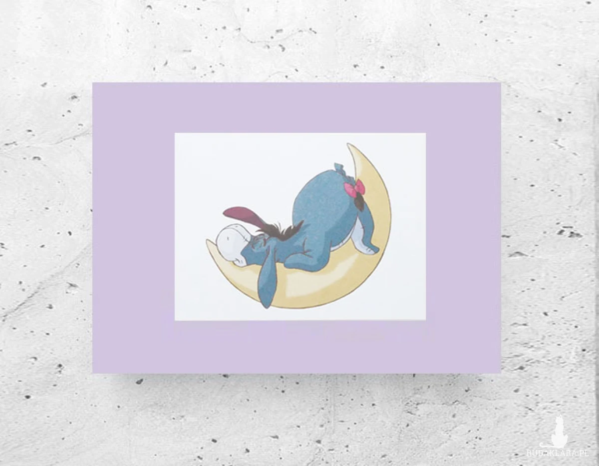 Nowy, kolorowy obrazek z osiołkiem o imieniu Kłapouchy z bajki o Kubusiu Puchatku. Dekoracja na ścianę do pokoju dziecięcego, kuchni, sypialni, jadalni, żłobka, bawialni, przedszkola, klubu malucha itp. Ładny plakat dla dziewczynki lub małego chłopczyka. Grafika na liliowym tle w formacie A4, gruby kartonik. Poster wystarczy dać do ramki w rozmiarze 21 x 30 cm.
