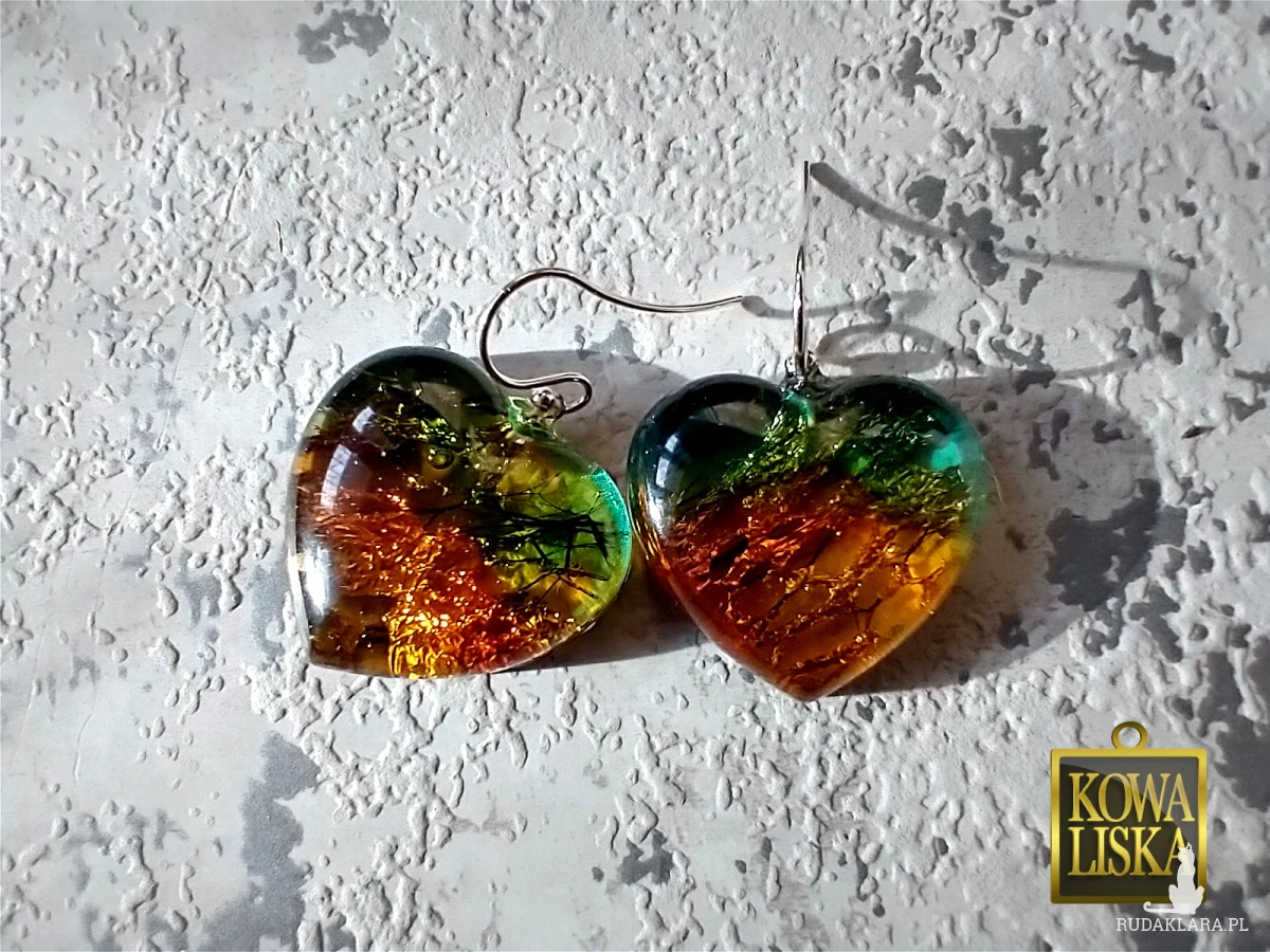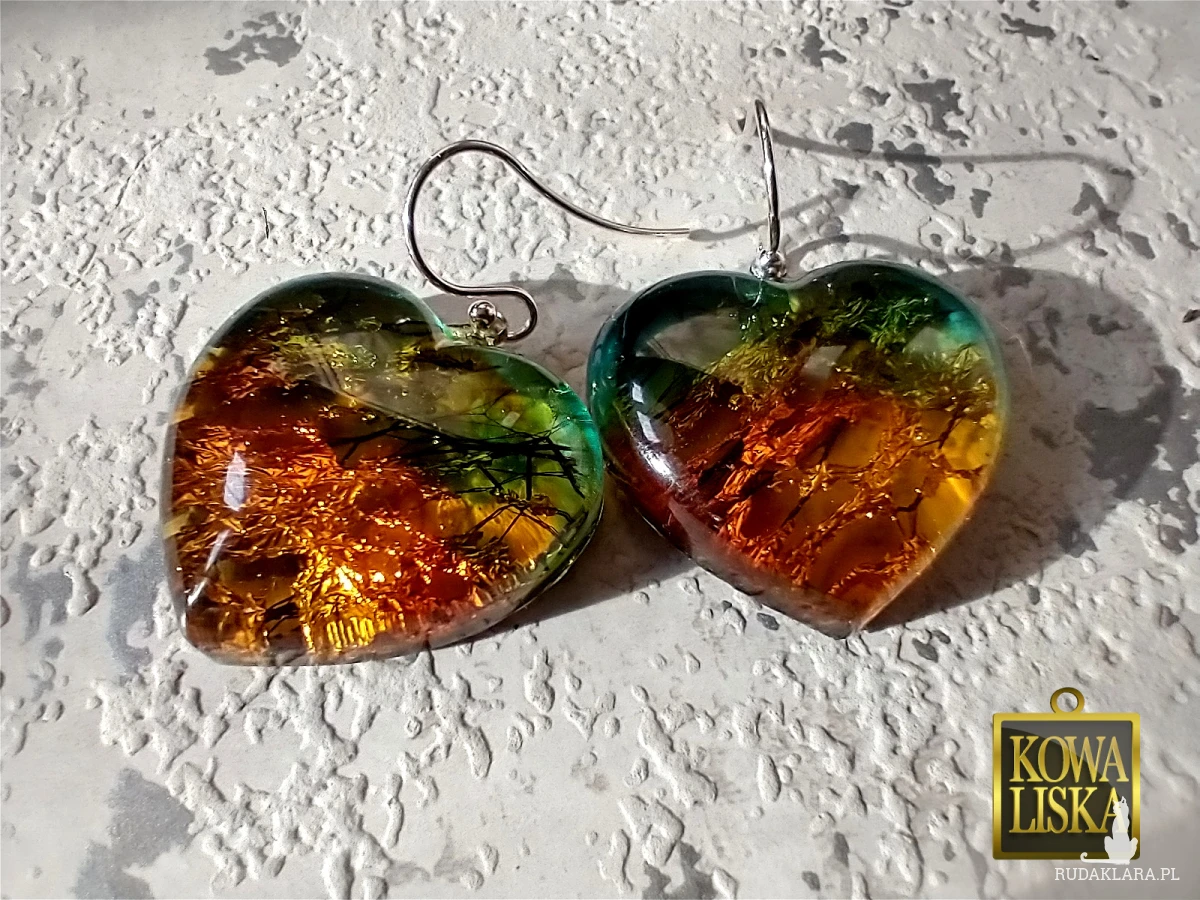 Podbarwiona żywica z zatopionym złoto-czarnym motywem zyskała intrygującą głębię i świetliste refleksy. Bursztyn i turkus tworzą zjawiskowy, miły dla oka efekt.
