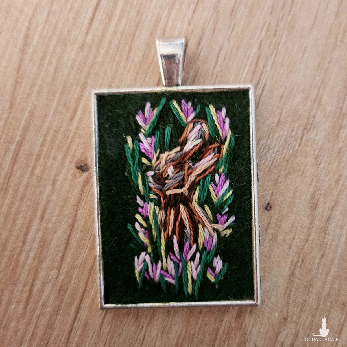 Recznie haftowany wisior królik w lawendzie/wrzosach