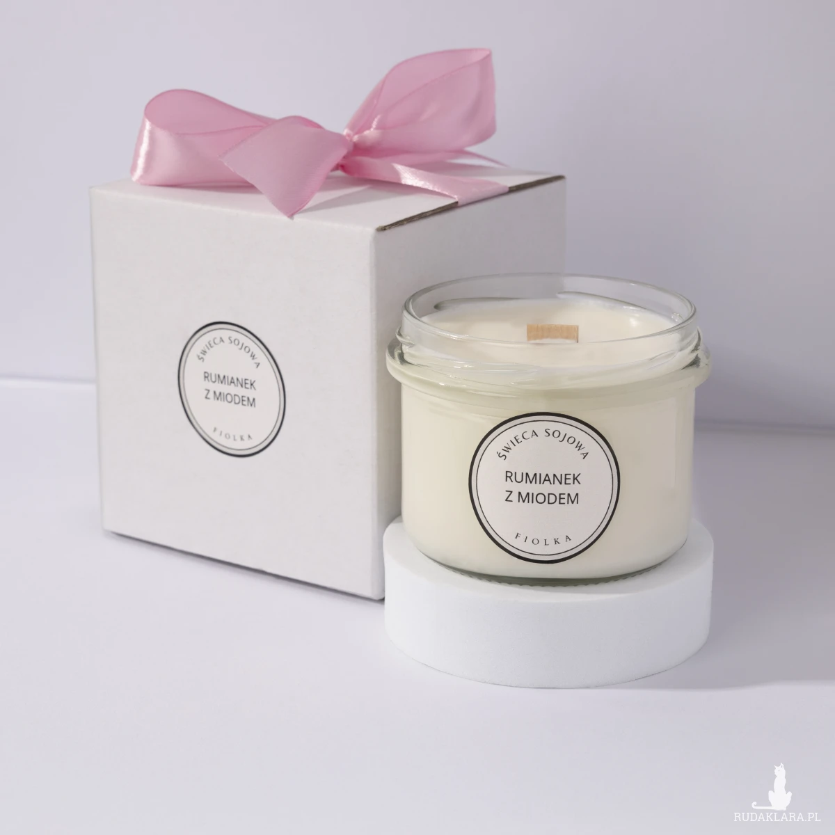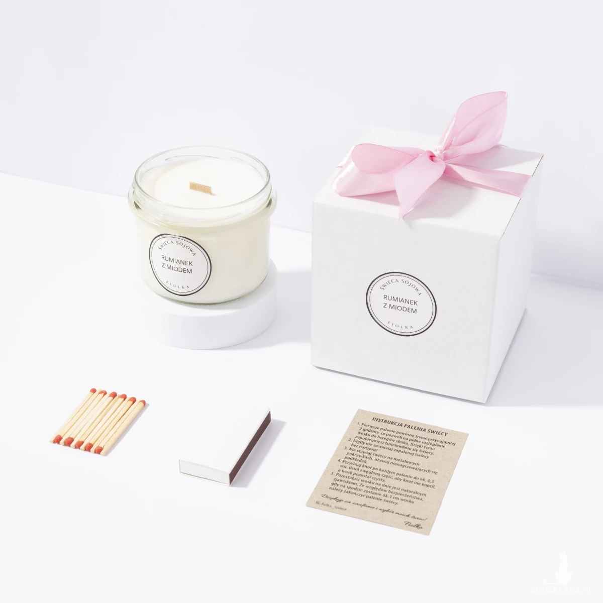 Świece sojowe wykonane z ogromnym sercem! 100% wosk sojowy. Pojemność słoika 235 mlŚwiece pakowane są w białe pudełko z wypełnieniem, zapałkami oraz instrukcja palenia. Całości uroku dodaje kokardka.