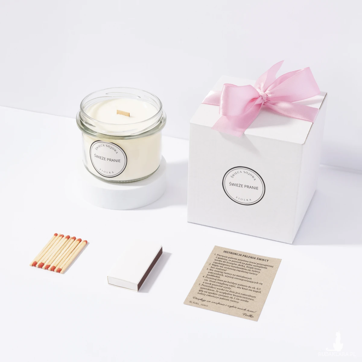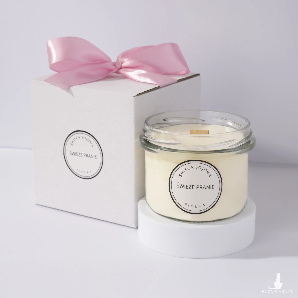 Świece sojowe wykonane z ogromnym sercem! 100% wosk sojowy. Pojemność słoika 235 mlŚwiece pakowane są w białe pudełko z wypełnieniem, zapałkami oraz instrukcja palenia. Całości uroku dodaje kokardka.
