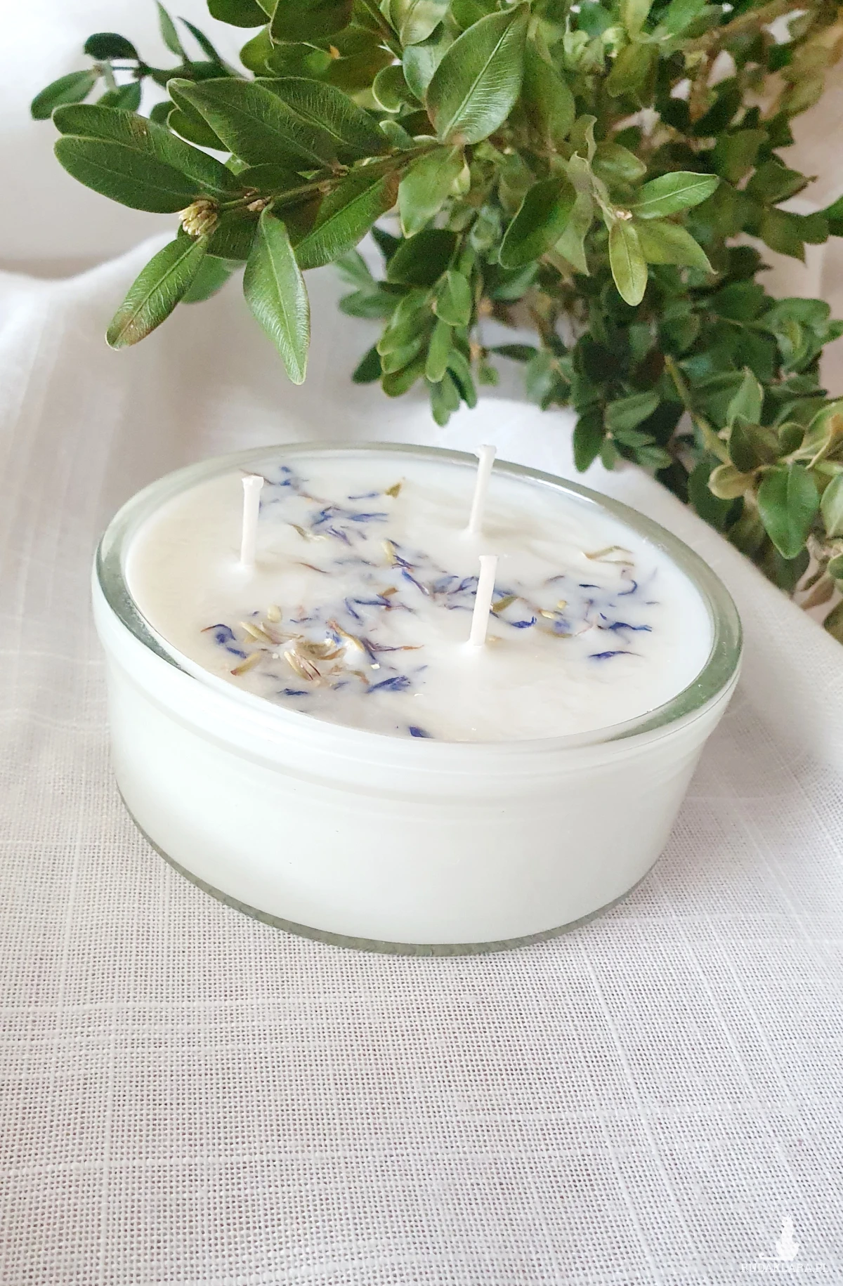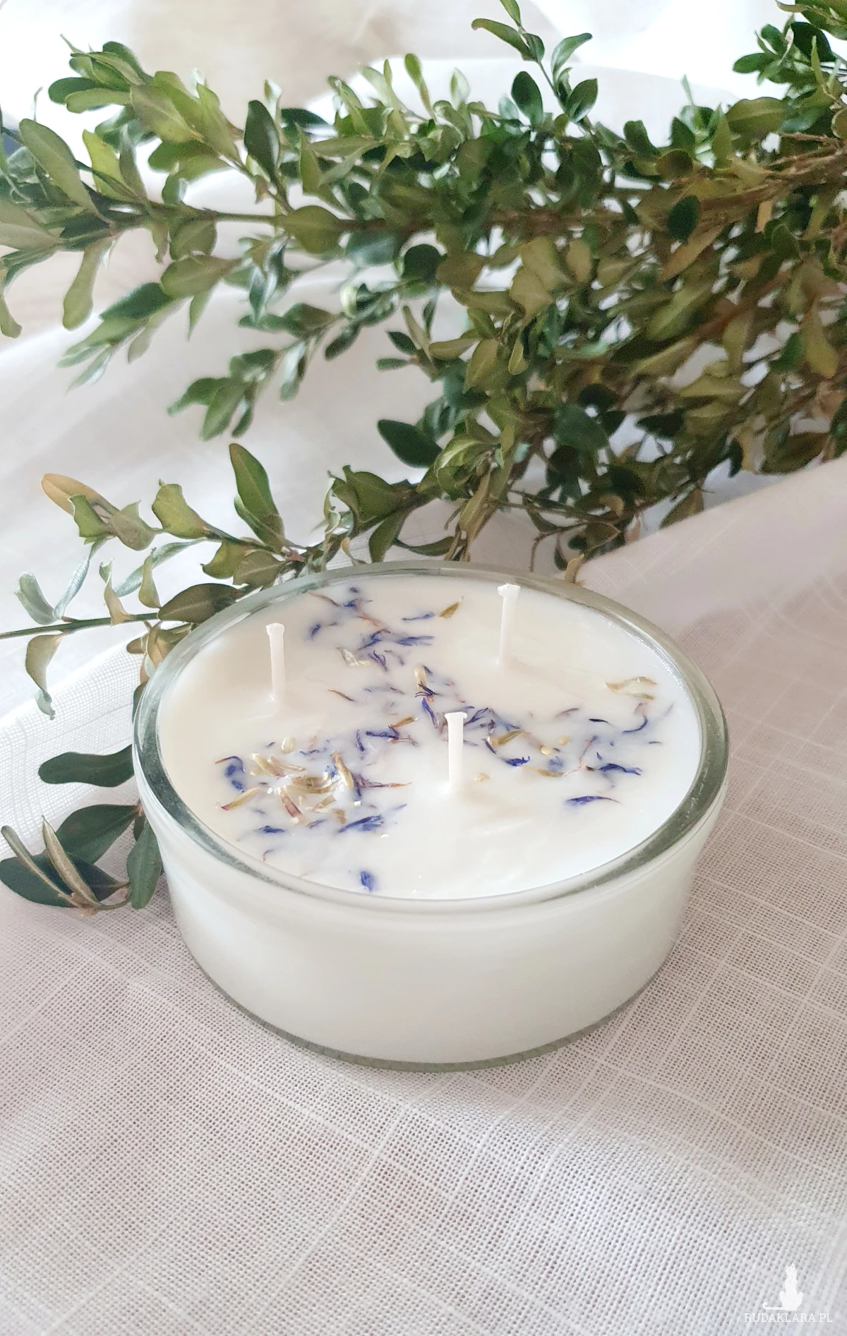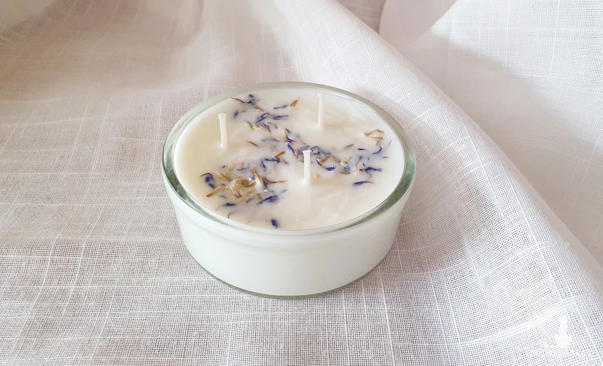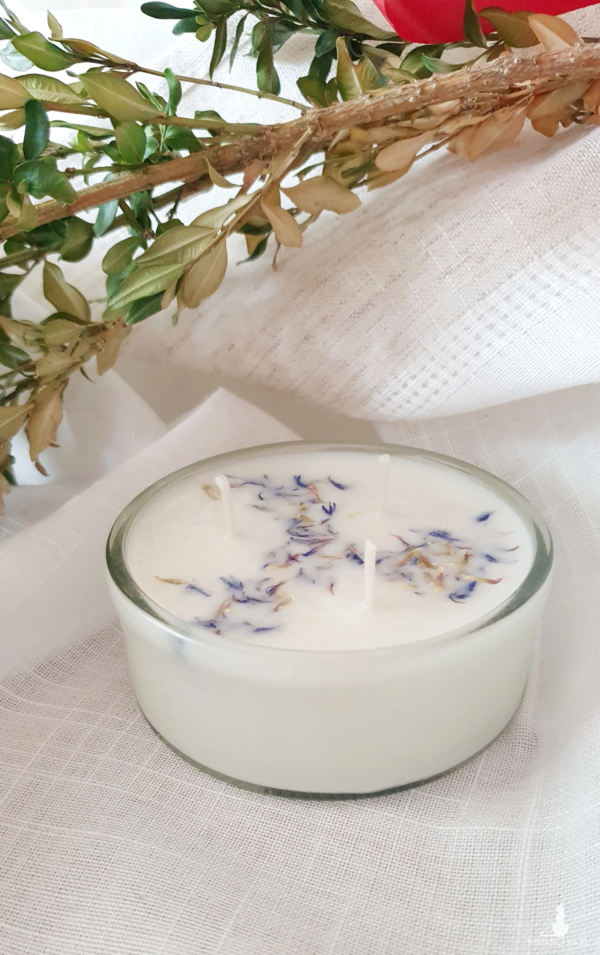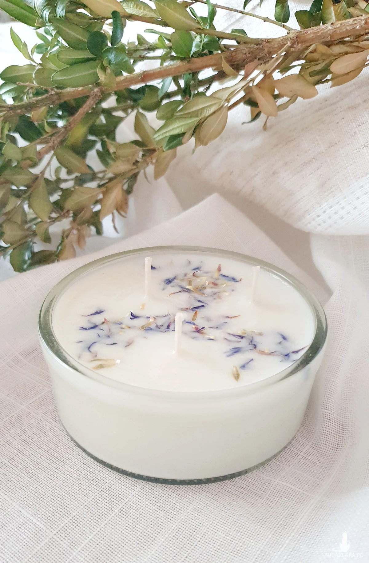 Świeca sojowa wykonana ze 100% wosku sojowego z dodatkiem olejku o zapachu citronelli, udekorowana suszonym bławatkiem. Lekkie nierówności na wierzchu świecy świadczą o własnoręcznym jej wykonaniu.