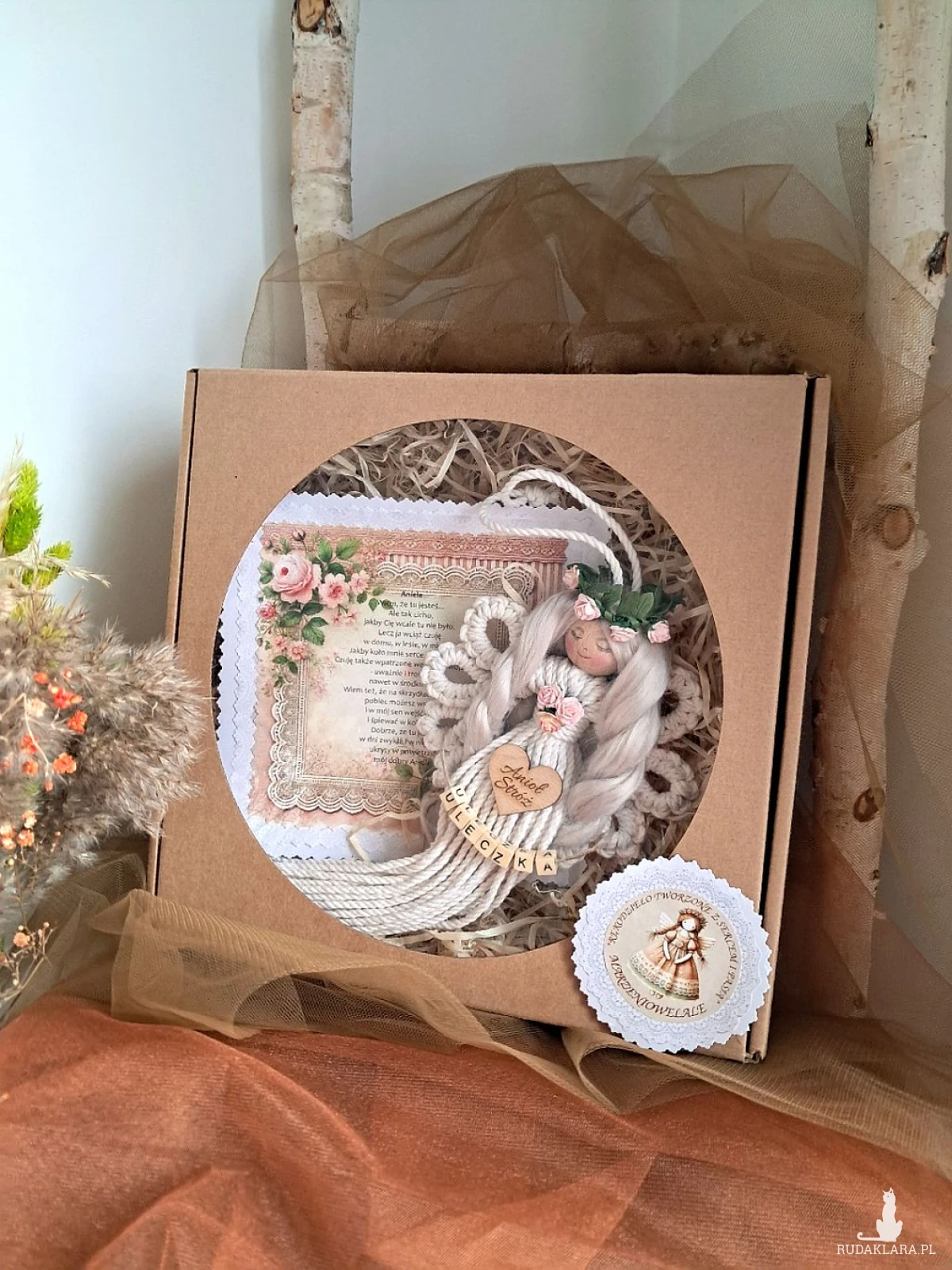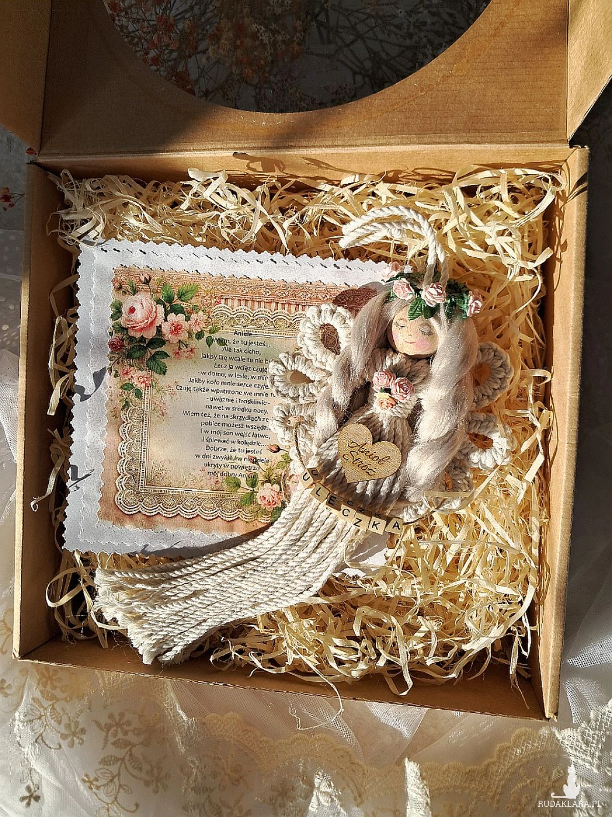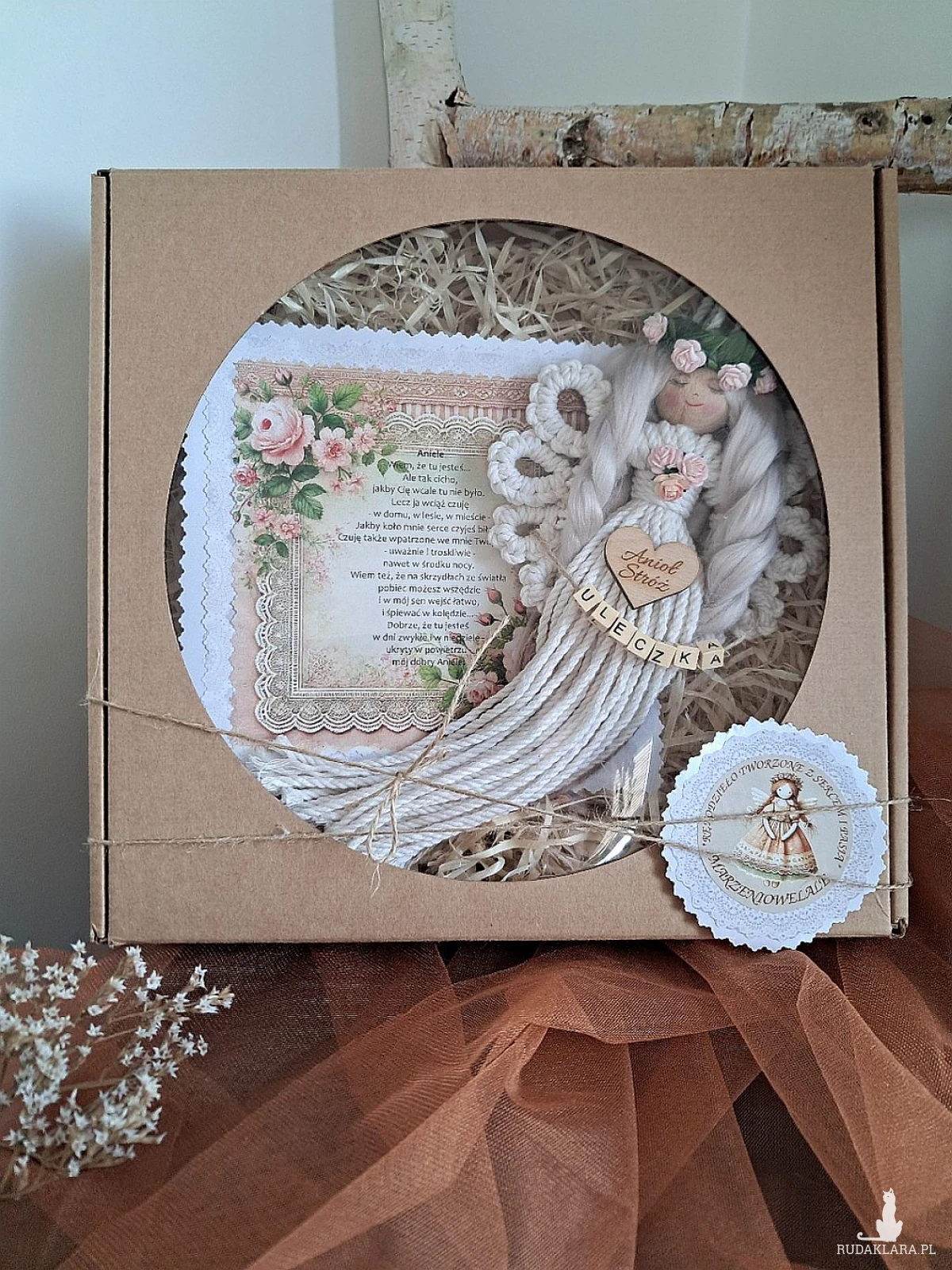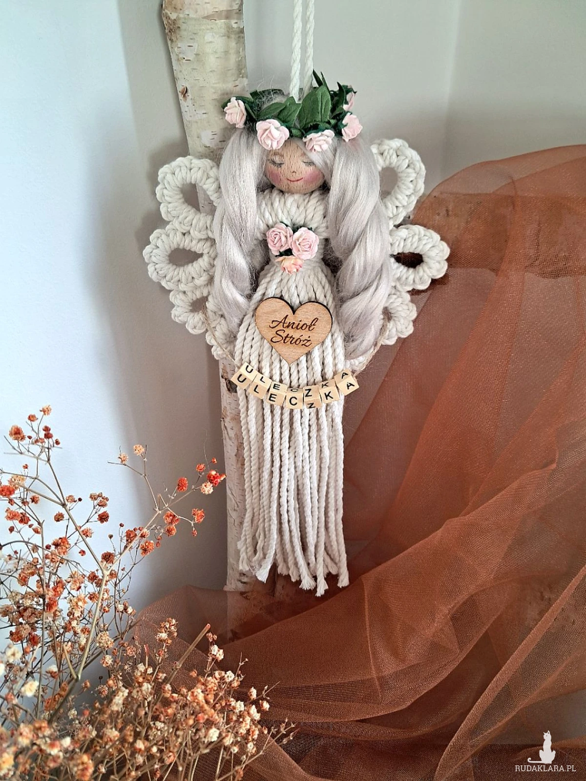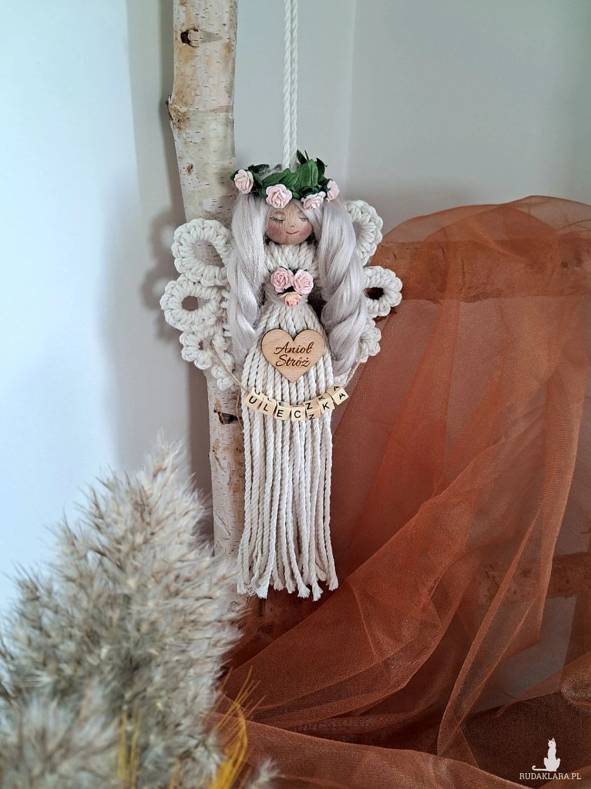 Mam do sprzedania aniołka wykonanego metodą makramy. Aniołek jest upleciony na drewnianym kółku; posiada włosy z wełny czesankowej koloru mysi blond, udekorowany został różyczkami koloru różowego oraz drewnianym scrapkiem z napisem "Anioł stróż". Koralikowe imię zmienię stosownie do potrzeb:) Proszę zwrócić uwagę na nietuzinkowe skrzydełka. Dł. anioła bez zawieszki 25 cm, Może stanowić uroczy upominek z różnych okazji - w pudełku dołączona dedykacja:)