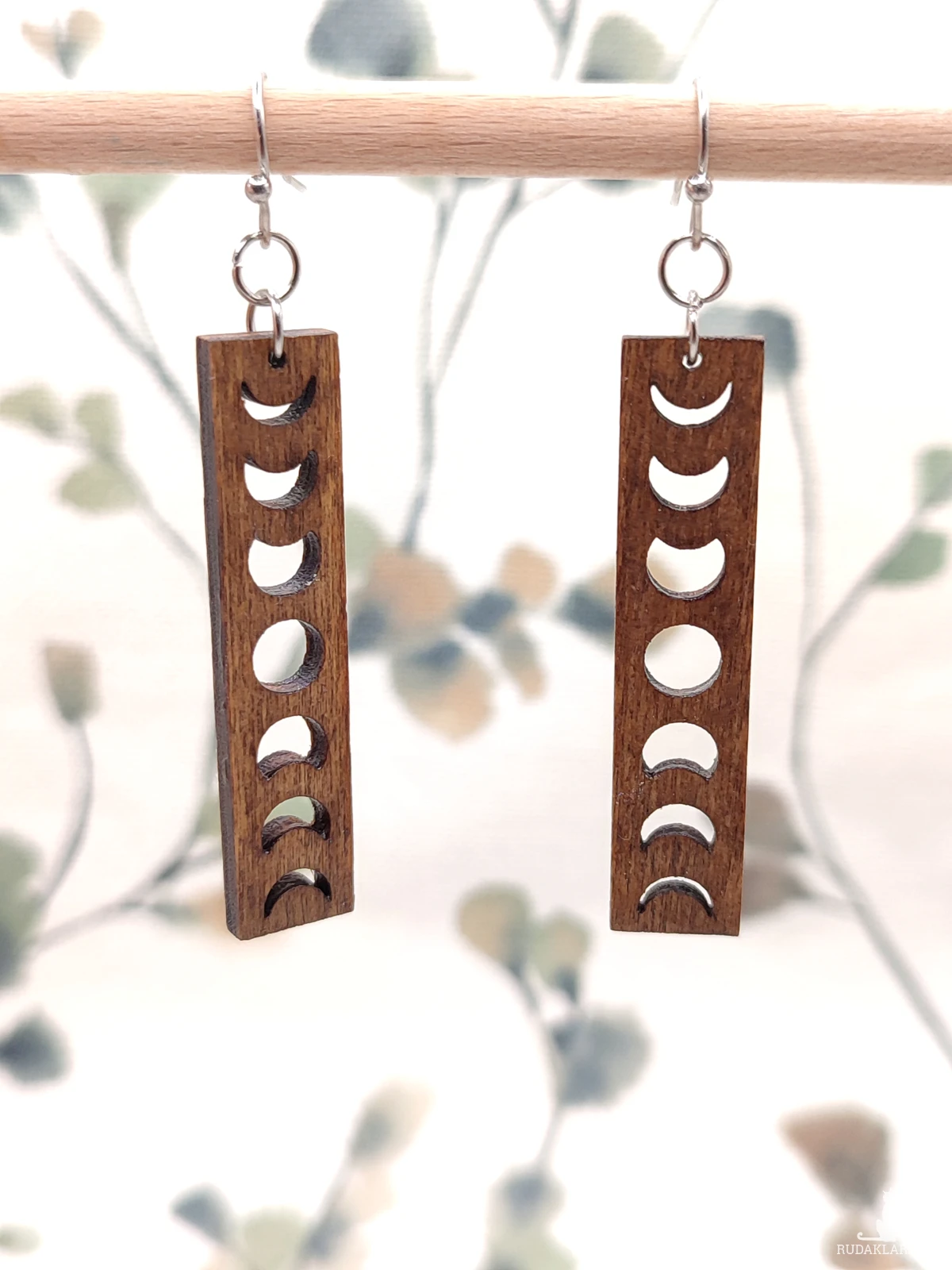 Kolczyki wykonane ręcznie z drewna warstwowego zabezpieczonego lakierem i bigli ze stali szlachetnej.
