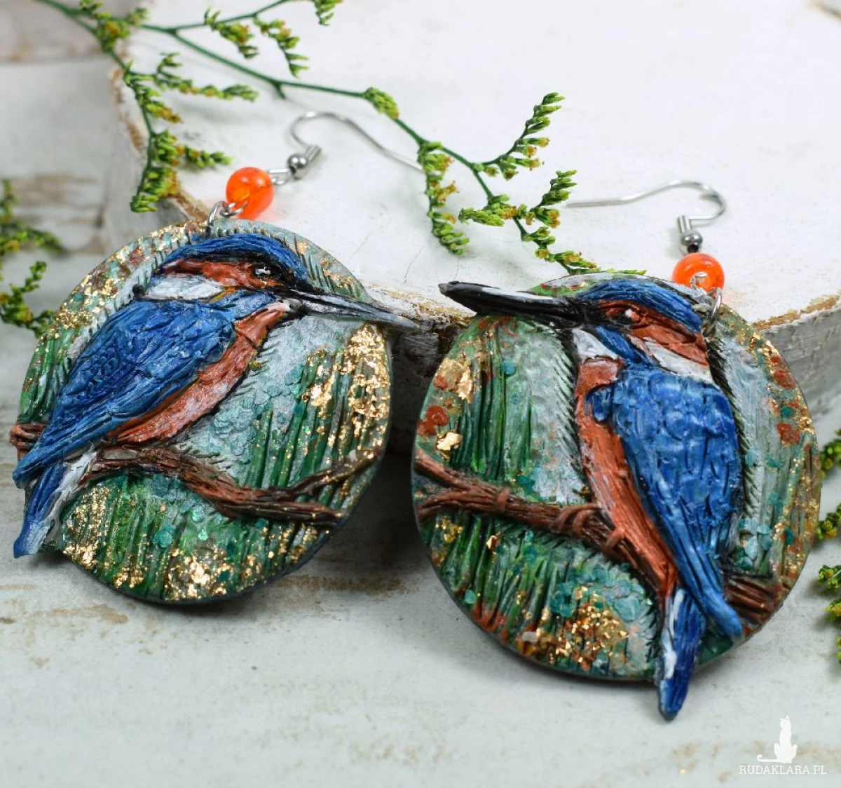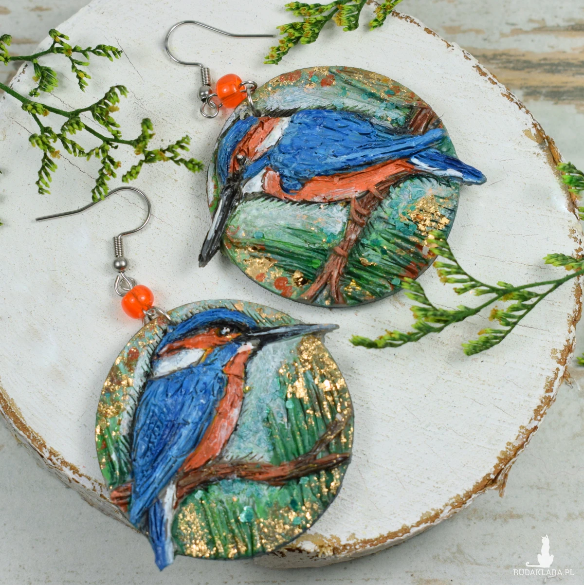 Unikatowe, wykonane ręcznie kolczyki z motywem zimorodka, w odcieniach niebieskiego, brązu, zieleni.
