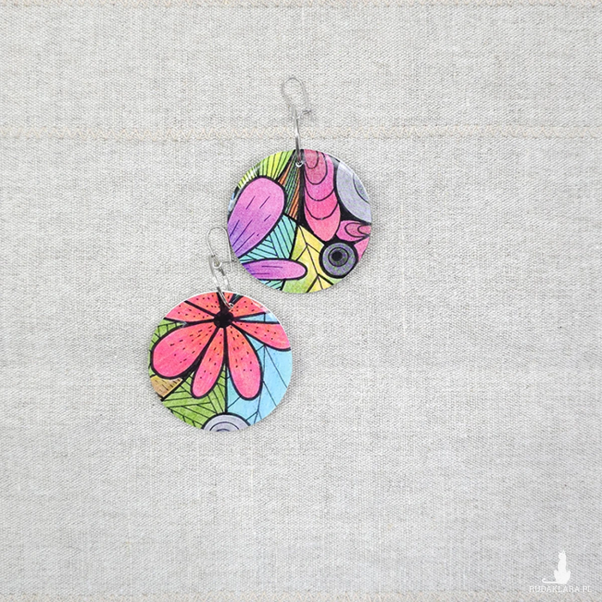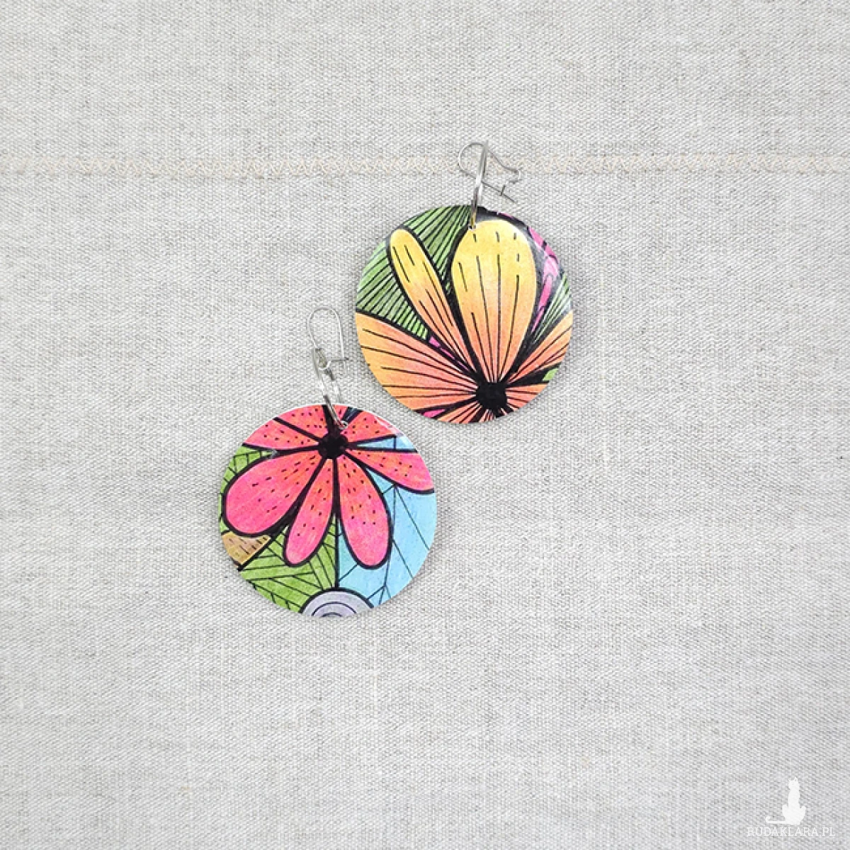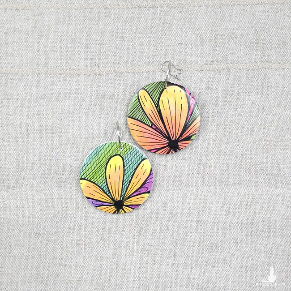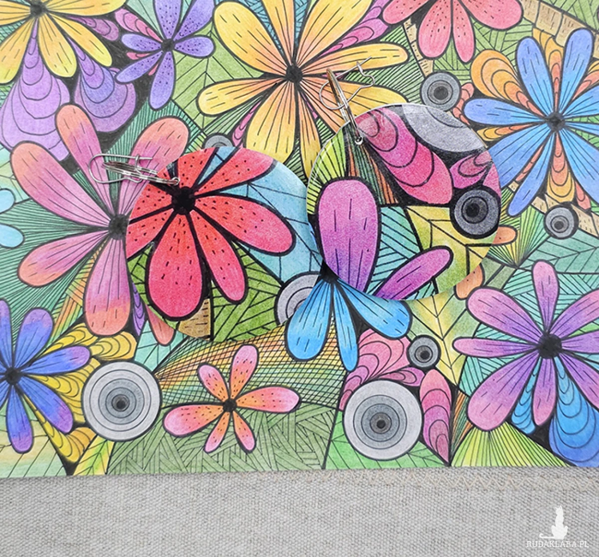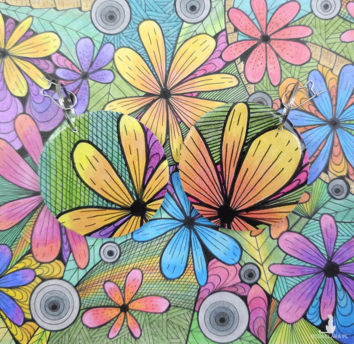 Kolczyki wykonane z drewnianej bazy oraz części mojego autorskiego rysunku "Zaczarowany ogród".