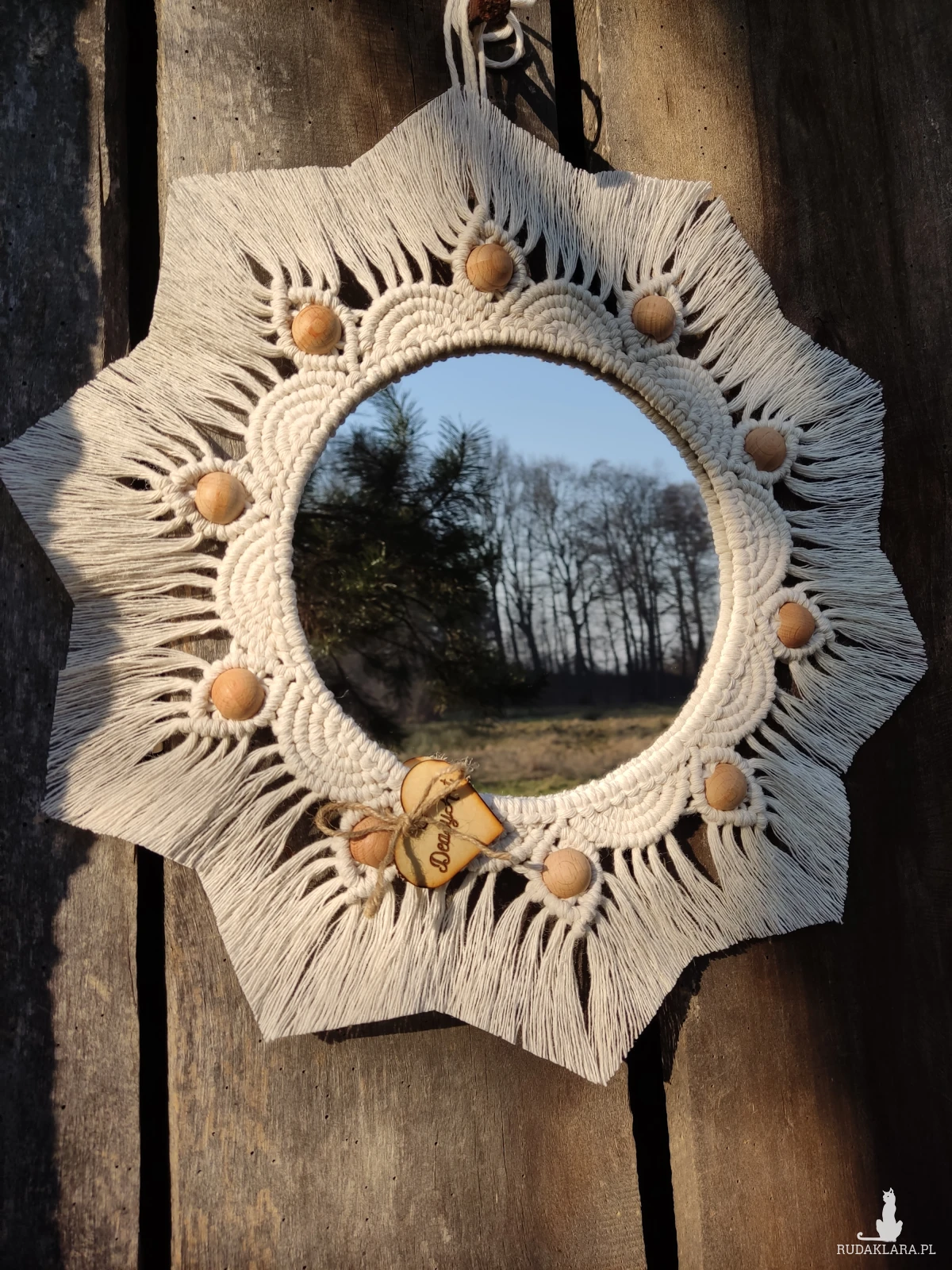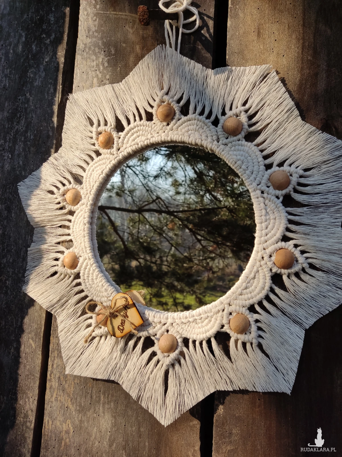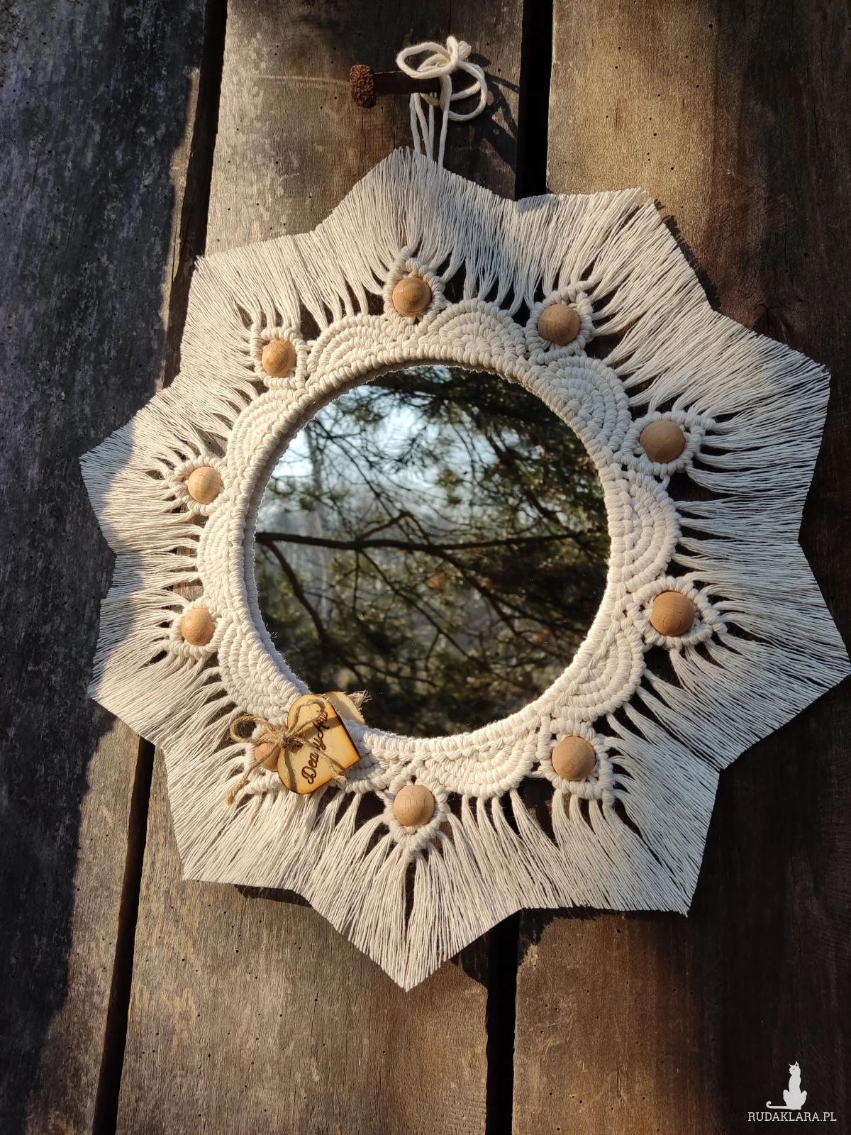 Sprzedam ręcznie wykonaną mandale z lusterkiem, całkowita średnica wynosi ok 40 cm, średnica samego lustra wynosi 20 cm. Wykonana z sznurka skręcanego 3 mm w kolorze naturalnym z dodatkiem drewnianych koralików.