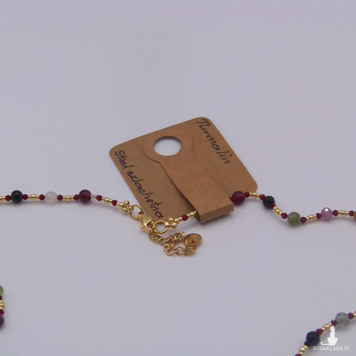 Delikatny naszyjnik zrobiłam z kamieni naturalnych na przemian : kolorowy Turmalin koraliki 4mm - koraliki kryształek szklany 2mm + złote koralik toho 2mm -, w takiej kolejności na całej długości. Wszystkie elementy wykończeniowe ze stali chirurgicznej w kolorze złotym: ozdobny łącznik, karabińczyk, przedłużka, ogniwka . Długość 46 cm + łańcuszek przedłużka 5 cm.